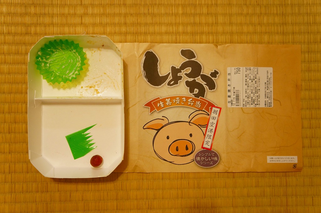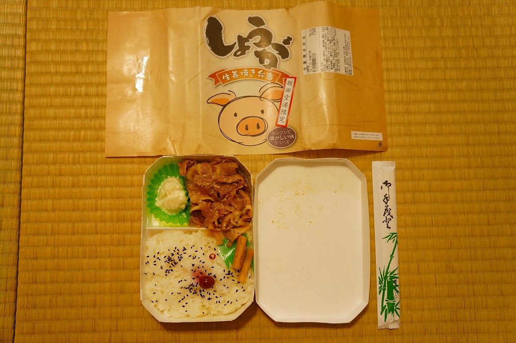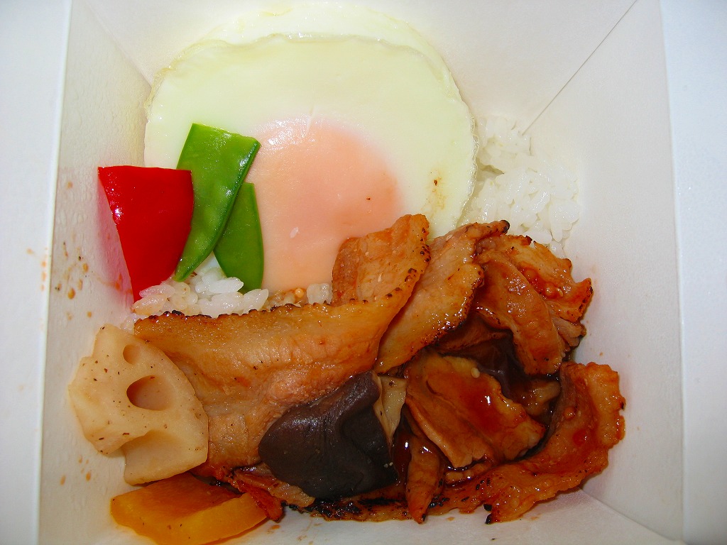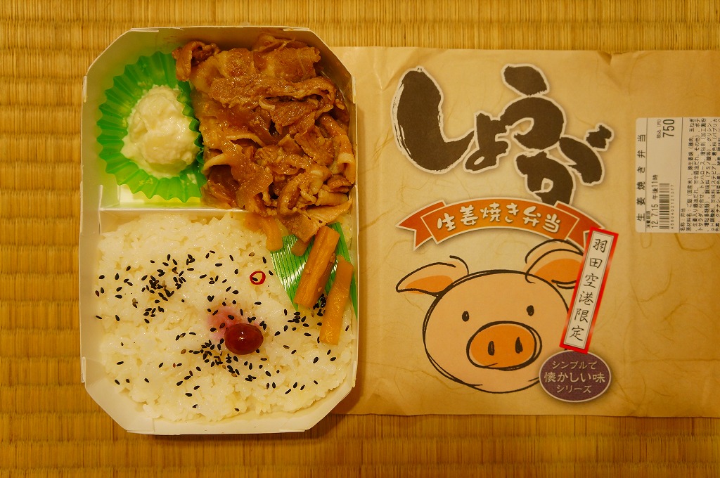 2012年前半の登場か。牛乳パックのような耐水紙の容器の半分が日の丸御飯、半分がトンカツ、そこに焼きそばや昆布を付け合わせるという、懐かしくはないが確かにシンプルで割り切った仕様。空弁売店で買える常温のホカ弁。 【東京国際空港】1931(昭和6)年8月25日開港 東京都大田区羽田空港 http://www.tokyo-airport-bldg.co.jp/ 【日本エアポートデリカ株式会社】東京都大田区羽田空港1−8−2 03(5708)7788 http://www.airdeli.co.jp/ しょうが 生姜焼き弁当(750円) 2012年7月15日に羽田空港第2旅客ターミナル売店で購入