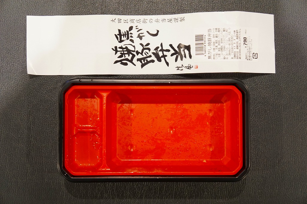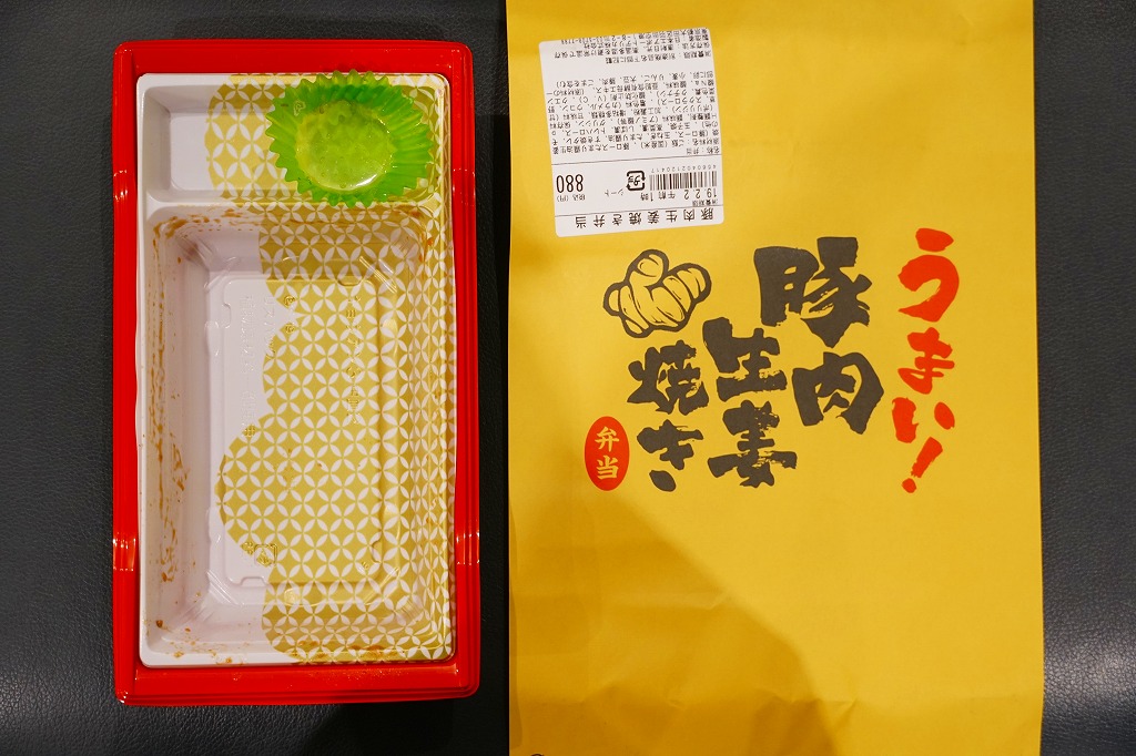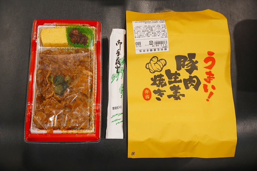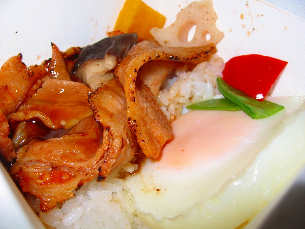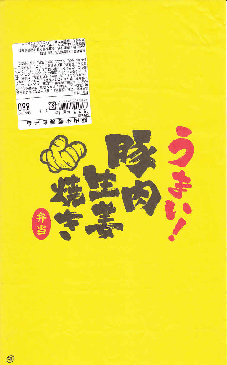 2012年前半の登場か。牛乳パックのような耐水紙の容器の半分が日の丸御飯、半分がトンカツ、そこに焼きそばや昆布を付け合わせるという、懐かしくはないが確かにシンプルで割り切った仕様。空弁売店で買える常温のホカ弁。 【東京国際空港】1931(昭和6)年8月25日開港 東京都大田区羽田空港 http://www.tokyo-airport-bldg.co.jp/ 【日本エアポートデリカ株式会社】東京都大田区羽田空港1−8−2 03(5708)7788 http://www.airdeli.co.jp/ しょうが 生姜焼き弁当(750円) 2012年7月15日に羽田空港第2旅客ターミナル売店で購入
