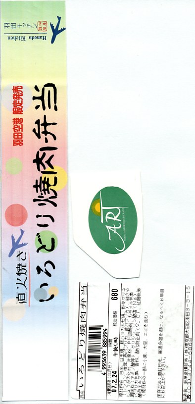 登場時期不詳。黒く小柄な発泡材正方形容器に、商品名を書いて調製シールを貼った掛紙をテープ留めし、箸袋を挟んでゴムでしばる。中身は半分強に日の丸御飯、半分弱にエビフライ2本となすフライ2個、その下敷きに小さな円形のカツフライを2個、ぎゅうぎゅうに詰めるもの。ソースは2袋を添付。 分量的に、ひれかつ弁当ではなくエビフライ弁当が正当。衣はどの具も厚く、油で胃がもたれる、パワフルな空弁。ブランド名と思われる「美趣蘭」はミシュランと読むのだろうか。 【東京国際空港】1931(昭和6)年8月25日開港 東京都大田区羽田空港 http://www.tokyo-airport-bldg.co.jp/ 【東京エアポートレストラン株式会社AS】東京都大田区羽田空港3−3−2 03(5757)8883 http://www.airport-restaurant.co.jp/ 直火焼きいろどり焼肉弁当(680円) 2007年2月24日に羽田空港第2旅客ターミナルビル弁当売店で購入