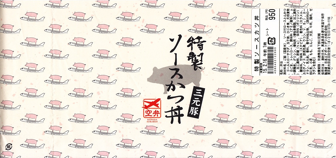 2015年の6月までに発売か。御飯の上に豚角煮を折り重ね、タレをかけて、高菜と柴漬けを添える、シンプルな空弁。ここでは「大田区商店街の弁当屋謹製」を名乗ったが、調製元は10年以上前から羽田に空弁を出荷している。柔らかすぎる肉が、とろけていった。 【東京国際空港】1931(昭和6)年8月25日開港 東京都大田区羽田空港 http://www.tokyo-airport-bldg.co.jp/ 【株式会社グローバルサンドカンパニー】東京都大田区中央3−20−11 03(3775)4774 http://global-sand.com/ 特製ソースかつ丼(950円) 2015年2月15日に羽田空港の第1旅客ターミナルの売店で購入