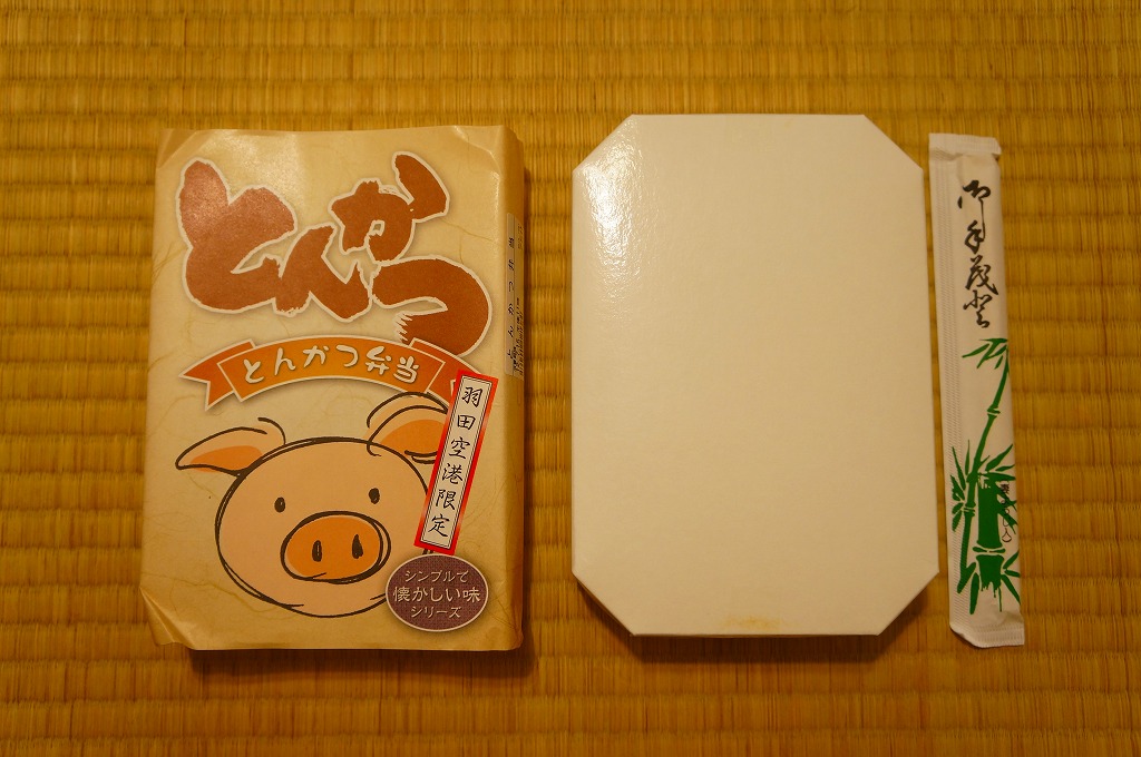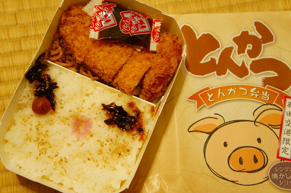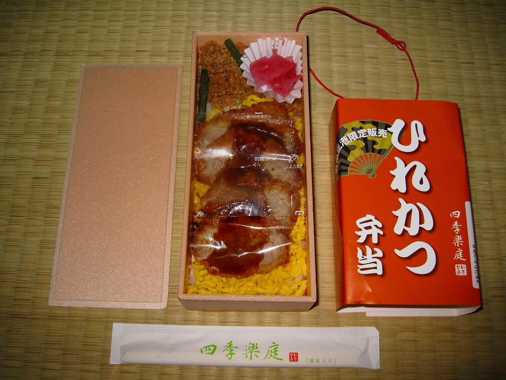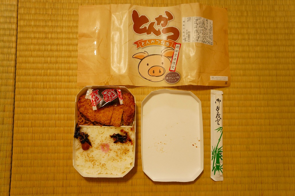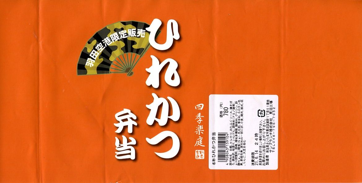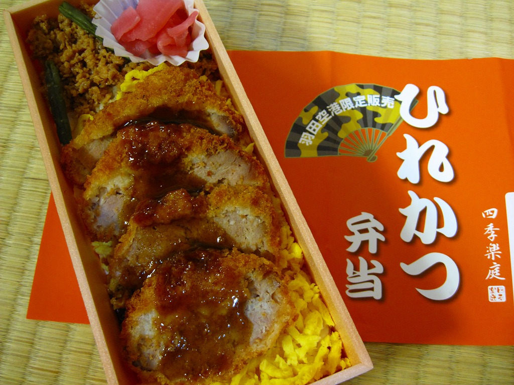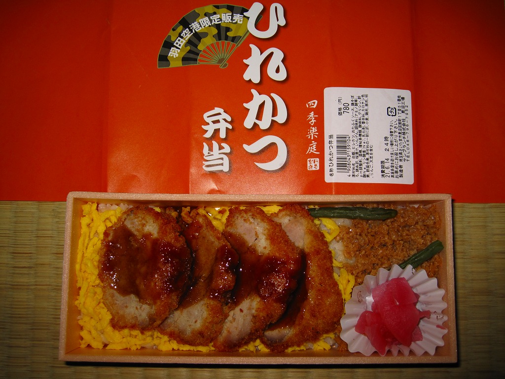 2012年の登場か。紙張り経木の長方形容器に、日の丸俵飯と三元豚を使ったというとんかつを詰め、玉子焼、きんぴらごぼう、柴漬け、とんかつソースを添えるもの。中身も味も容器も既視感があるが、ていねいに作られている。空港内なのに朝5時台でもこんな重たい弁当が買えるのは、羽田ならでは。なお、この空弁の掛紙に記されるブランドネーム「多喜屋」は、調製元の羽田空港向け惣菜会社がこの弁当のために作ったものであるようだ。 【東京国際空港】1931(昭和6)年8月25日開港 東京都大田区羽田空港 http://www.tokyo-airport-bldg.co.jp/ 【日本エアポートデリカ株式会社】東京都大田区羽田空港1−8−2 03(5708)7788 http://www.airdeli.co.jp/ ひれかつ弁当(780円) 2009年6月14日に羽田空港第1旅客ターミナル搭乗待合室売店で購入