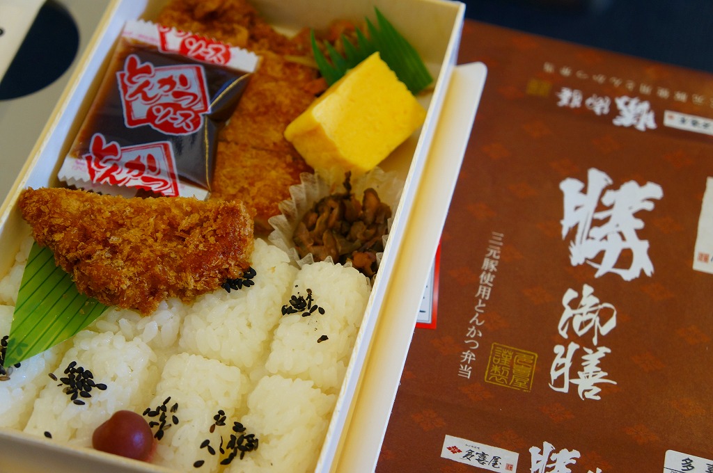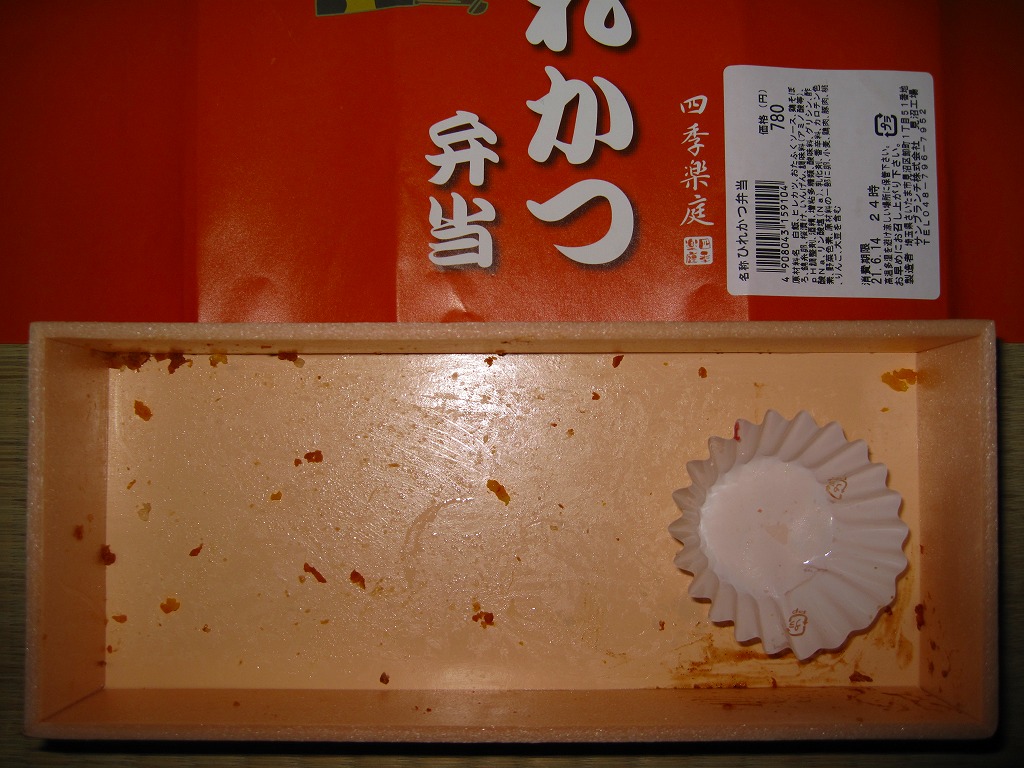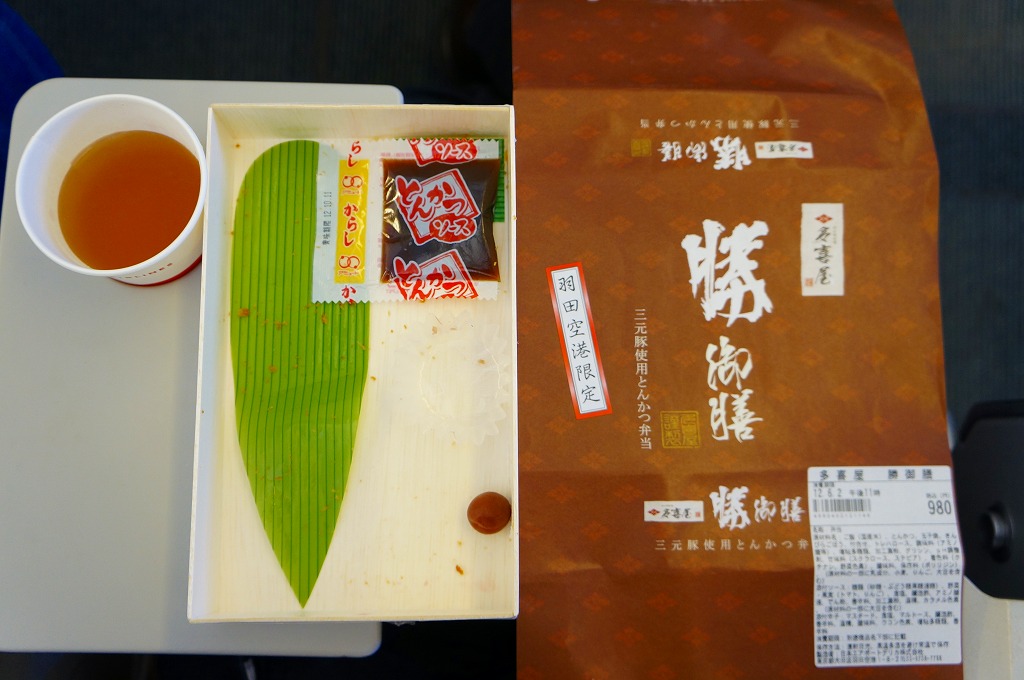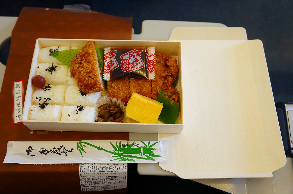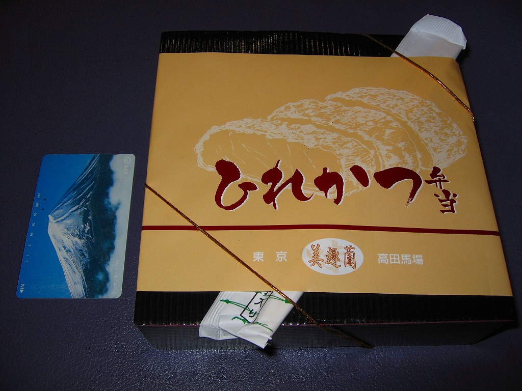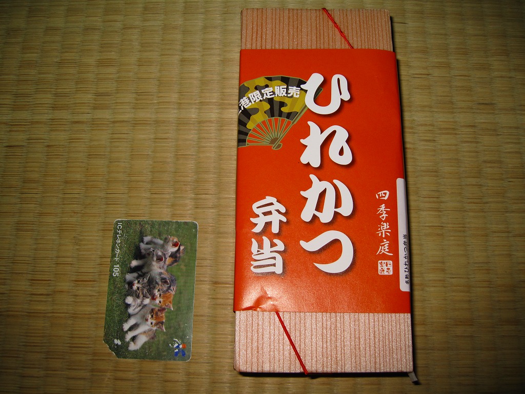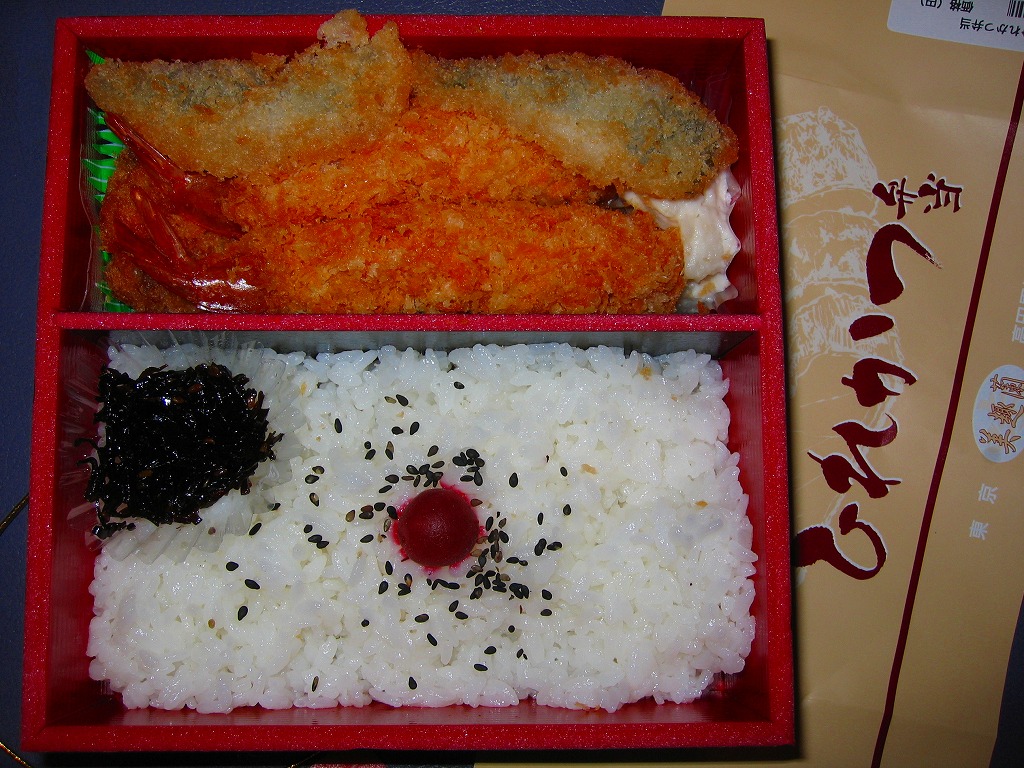 2012年の登場か。紙張り経木の長方形容器に、日の丸俵飯と三元豚を使ったというとんかつを詰め、玉子焼、きんぴらごぼう、柴漬け、とんかつソースを添えるもの。中身も味も容器も既視感があるが、ていねいに作られている。空港内なのに朝5時台でもこんな重たい弁当が買えるのは、羽田ならでは。なお、この空弁の掛紙に記されるブランドネーム「多喜屋」は、調製元の羽田空港向け惣菜会社がこの弁当のために作ったものであるようだ。 【東京国際空港】1931(昭和6)年8月25日開港 東京都大田区羽田空港 http://www.tokyo-airport-bldg.co.jp/ 【日本エアポートデリカ株式会社】東京都大田区羽田空港1−8−2 03(5708)7788 http://www.airdeli.co.jp/ ひれかつ弁当(780円) 2009年6月14日に羽田空港第1旅客ターミナル搭乗待合室売店で購入