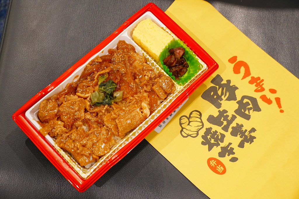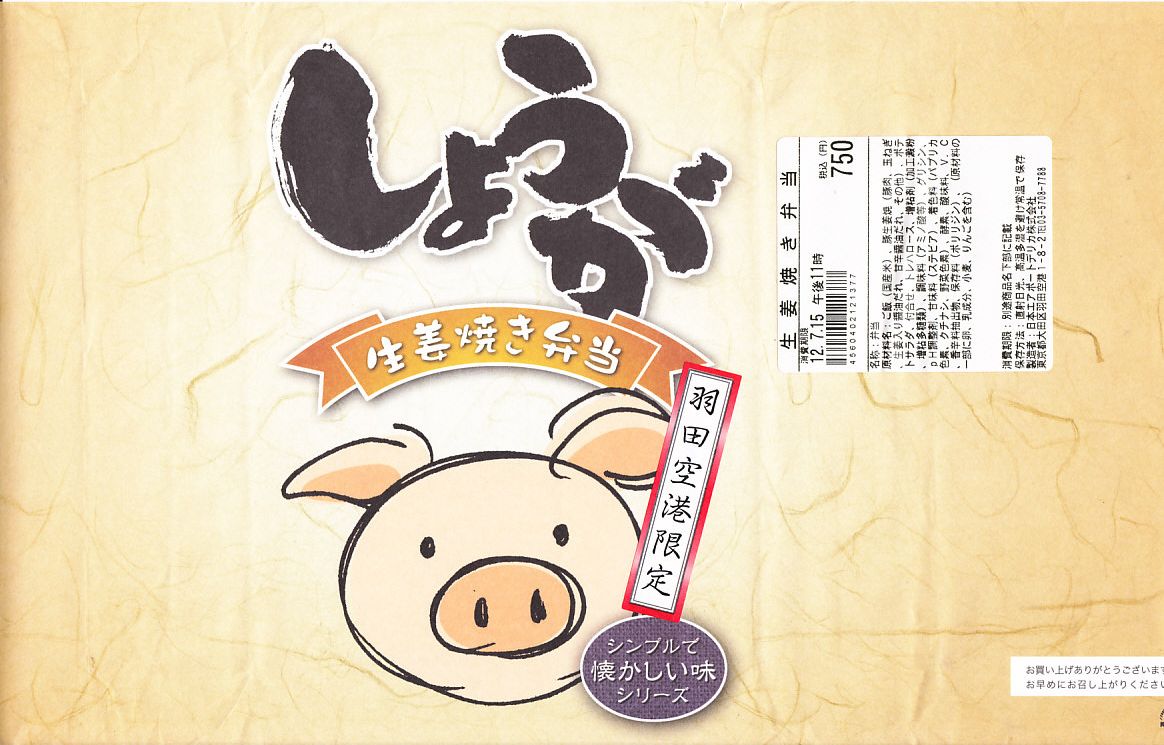 2015年の1月までに発売されたと思われる、下記の羽田空弁「特製ソースかつ丼」の、2021年時点の姿か。白飯をロースカツのソース漬けで覆い、ひじき、玉子焼、漬物を添えるシンプルな内容は変わらない。豚が飛行機に乗っていた掛紙が、商品名のみを目立つように記す絵柄に変わった。価格は50円のアップ。空弁ブームの終焉かコロナ禍か、羽田空港の空弁は東京都内の商業施設で広く売られる惣菜の他は、日本エアポートデリカのものばかりになっている。 【東京国際空港】1931(昭和6)年8月25日開港 東京都大田区羽田空港 http://www.tokyo-airport-bldg.co.jp/ 【日本エアポートデリカ株式会社】東京都大田区羽田空港1−8−2 03(5708)7788 http://www.airdeli.co.jp/ うまい!豚肉生姜焼き弁当(880円) 2019年2月1日に羽田空港の第2旅客ターミナルビルの売店で購入
