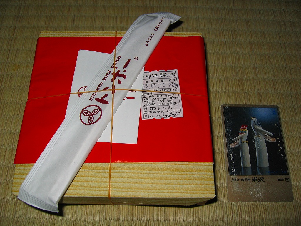 羽田空弁で無名なほうのとんかつ弁当。有名なほうは「むかしの味」が付く650円の商品。経木枠の長方形容器に木目調の紙ぶたをかけてゴムで留めて、保存に向かず開封に苦労する両端シール構造の薄い掛紙を巻いて、調製シールを貼る。中身は日の丸御飯に昆布と煮玉子とマカロニサラダ、そして岩手産ハーブ豚のヒレカツが2個。見栄えはまるで駅弁で、風味は上質。空弁らしさを意識しない機能的な食事。 【東京国際空港】1931(昭和6)年8月25日開港 東京都大田区羽田空港 http://www.tokyo-airport-bldg.co.jp/ 【株式会社マコト】東京都大田区東六郷1−25−3 03(3735)2711 http://www.makoto-j.co.jp/ トンポー蒸篭(せいろ)(700円) 2005年1月16日に京王百貨店駅弁大会で購入