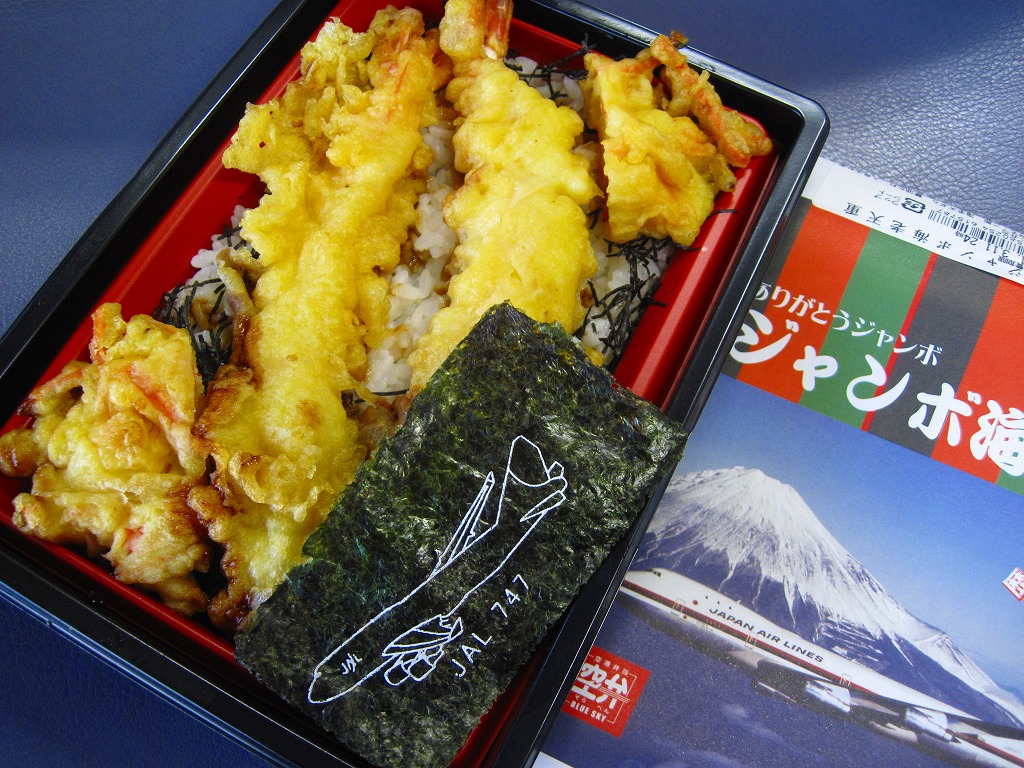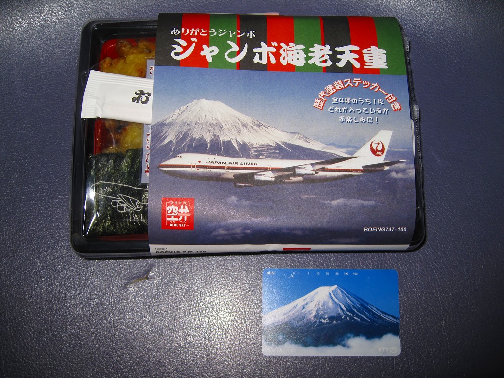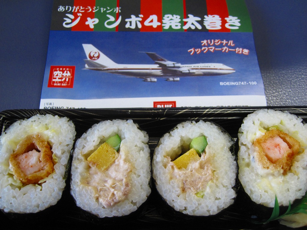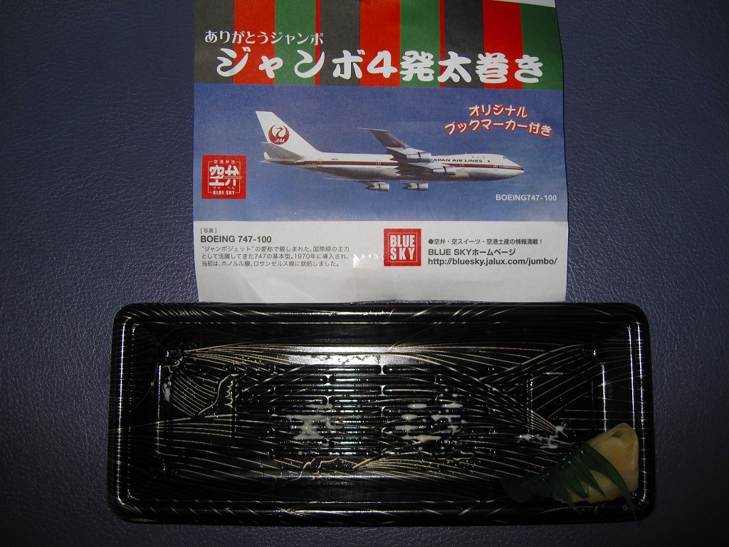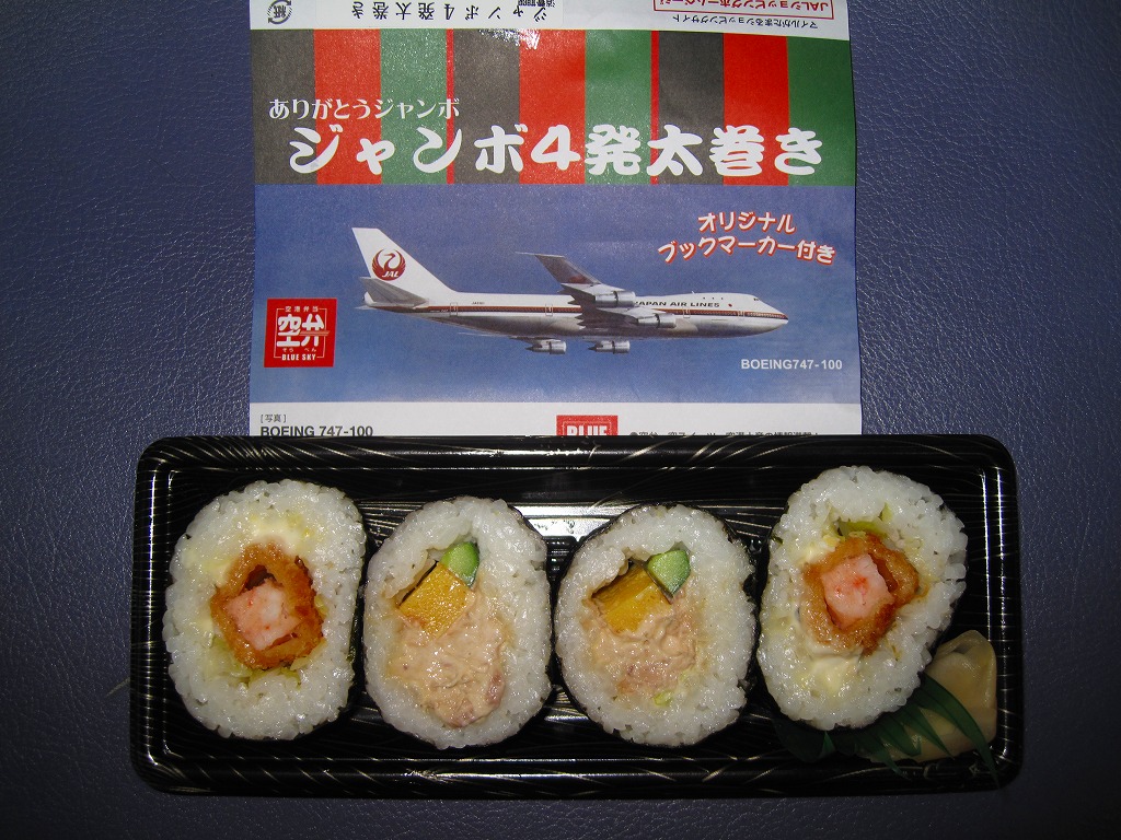 日本航空のボーイング747型機の退役を記念して2010年11月に登場。海老天2本とかき揚げ2切れを白御飯の上に並べ、飛行機の絵柄を印刷した海苔を添えるもの。空弁なので分量が多いわけではないが、朝6時台からこんなものを食べてしまい、胃にとても重かった。飛行機のシールを1枚添付。 日本航空は2000年に経営危機が表面化し、2010年1月には倒産した。その原因は1998年以降の国内線での運賃競争の激化、2001年9月11日のアメリカ同時多発テロによる乗客の急減や保安対策の強化、2003年のイラク戦争以降の原油価格の高騰、2008年のリーマンショックや2009年の新型インフルエンザなどを外部要因として挙げるのだろう。しかし個人的には、労働組合の乱立や顧客無視の労使の対立なり協調といった日本国有鉄道と同じような親方日の丸体質に、2002年の日本エアシステムの吸収合併で社内の混乱が深刻化したためではないかと思っている。 倒産後の企業再生支援機構による経営再建の一環として、ジェットエンジンを4発も積むため燃費が悪いとされた大型機のボーイング747型機がすべて退役させられることになった。後に「クラシックジャンボ」と呼ばれた掛紙写真のB747−100型機は2009年7月に退役済で、対して「ハイテクジャンボ」と呼ばれたB747−400型機も2011年3月1日のホノルル発成田行JL75便と那覇発成田行JL3098便を最後に引退した。全日本空輸の所有機と2機の政府専用機は、引き続き国内の空を飛び続ける。 【東京国際空港】1931(昭和6)年8月25日開港 東京都大田区羽田空港 http://www.tokyo-airport-bldg.co.jp/ 【株式会社JALUX NFD】東京都品川区東品川3−32−42 043(422)8858 http://www.jalux.com/ ジャンボ4発太巻き(450円) 2011年3月11日に羽田空港第1旅客ターミナルビル売店で購入