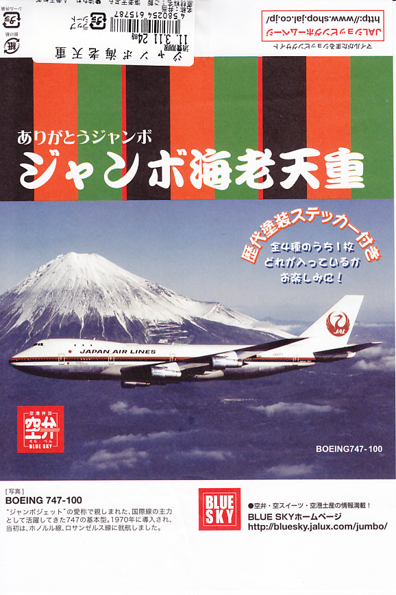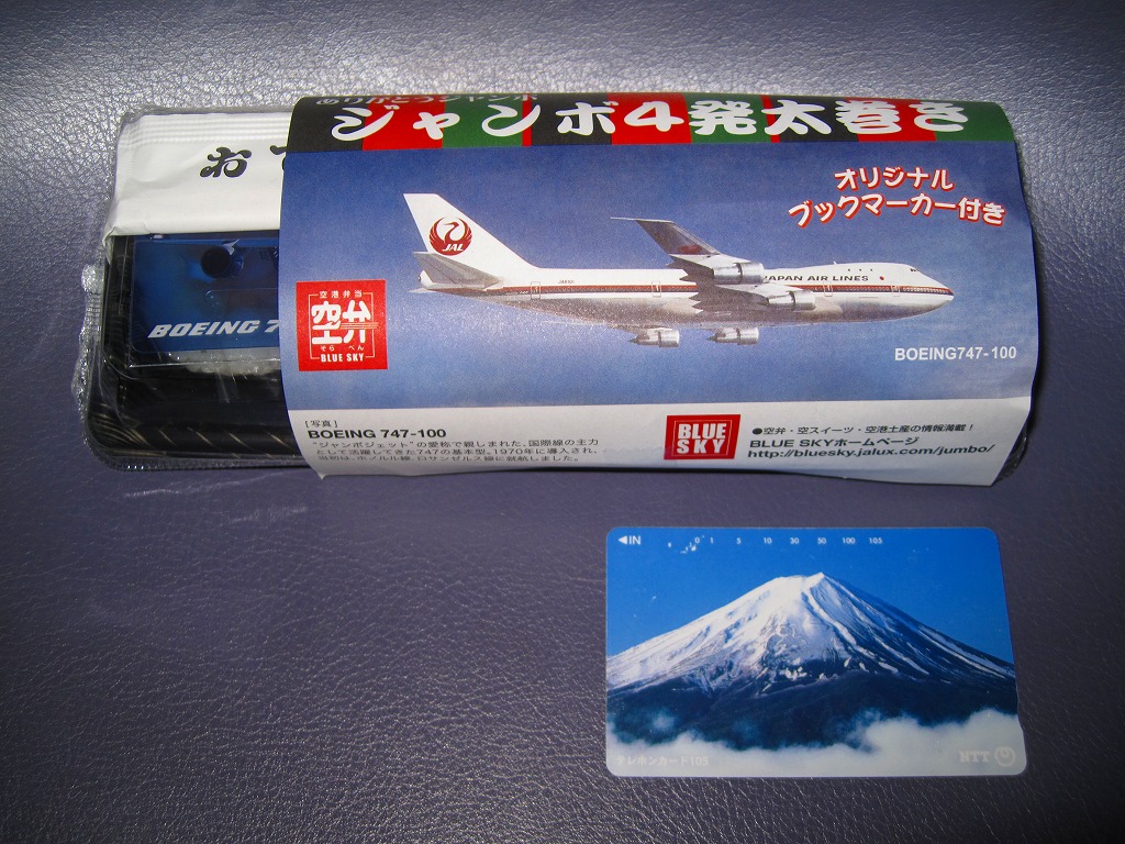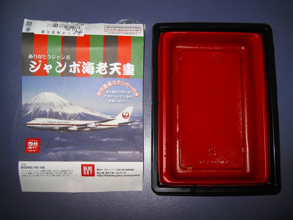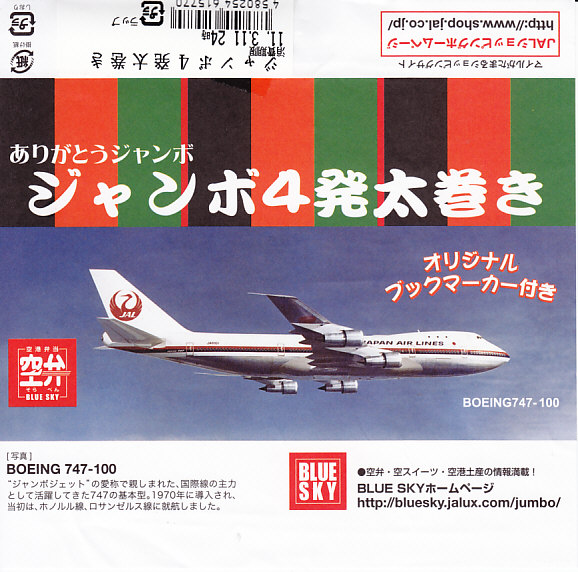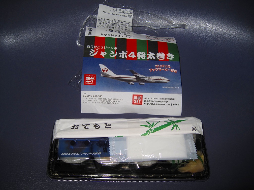 日本航空のボーイング747型機の退役を記念して2010年11月に登場。海老天2本とかき揚げ2切れを白御飯の上に並べ、飛行機の絵柄を印刷した海苔を添えるもの。空弁なので分量が多いわけではないが、朝6時台からこんなものを食べてしまい、胃にとても重かった。飛行機のシールを1枚添付。 日本航空は2000年に経営危機が表面化し、2010年1月には倒産した。その原因は1998年以降の国内線での運賃競争の激化、2001年9月11日のアメリカ同時多発テロによる乗客の急減や保安対策の強化、2003年のイラク戦争以降の原油価格の高騰、2008年のリーマンショックや2009年の新型インフルエンザなどを外部要因として挙げるのだろう。しかし個人的には、労働組合の乱立や顧客無視の労使の対立なり協調といった日本国有鉄道と同じような親方日の丸体質に、2002年の日本エアシステムの吸収合併で社内の混乱が深刻化したためではないかと思っている。 倒産後の企業再生支援機構による経営再建の一環として、ジェットエンジンを4発も積むため燃費が悪いとされた大型機のボーイング747型機がすべて退役させられることになった。後に「クラシックジャンボ」と呼ばれた掛紙写真のB747−100型機は2009年7月に退役済で、対して「ハイテクジャンボ」と呼ばれたB747−400型機も2011年3月1日のホノルル発成田行JL75便と那覇発成田行JL3098便を最後に引退した。全日本空輸の所有機と2機の政府専用機は、引き続き国内の空を飛び続ける。 【東京国際空港】1931(昭和6)年8月25日開港 東京都大田区羽田空港 http://www.tokyo-airport-bldg.co.jp/ 【株式会社JALUX NFD】東京都品川区東品川3−32−42 043(422)8858 http://www.jalux.com/ ジャンボ4発太巻き(450円) 2011年3月11日に羽田空港第1旅客ターミナルビル売店で購入