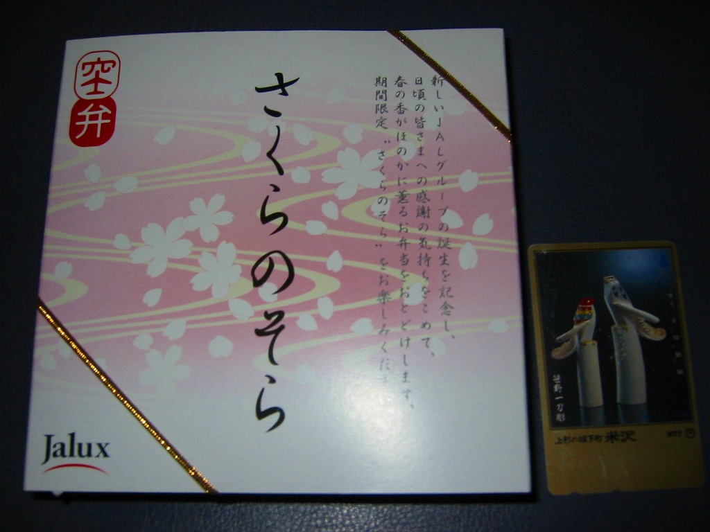 日本航空(JAL)と日本エアシステム(JAS)の完全統合を記念して、2004(平成16)年4月1日から5月31日まで羽田空港で発売される空弁。小柄な正方形の発泡材容器にフィルムを介し桜色なボール紙の蓋をかけ金色の輪ゴムで留める。中身は桜花の載る赤飯、紅白の蒲鉾、海老、桜餅など、目出度い桜のお弁当。空弁名は日本を代表する、そして春を代表する桜に、空弁とJALUX直営売店名「BLUE SKY」のそらを合わせたものだという。記念空弁などつい半年前まで考えられなかったことだ。 2004(平成16)年4月1日に国内発着の航空便について、JALグループの便名がJALに、ANAグループの便名がANAに、それぞれ統一された。JALとJASは表向きこそ対等な一体化と思わせる広報を打っているが、乗客側からはJALによるJASの吸収合併にしか見えない。 【東京国際空港】1931(昭和6)年8月25日開港 東京都大田区羽田空港 http://www.tokyo-airport-bldg.co.jp/ 【株式会社JALUX】東京都品川区東品川2−4−11 03(5460)7220 http://www.jalux.com/ Copyright (C) 2006-2022 まっこうくじら |