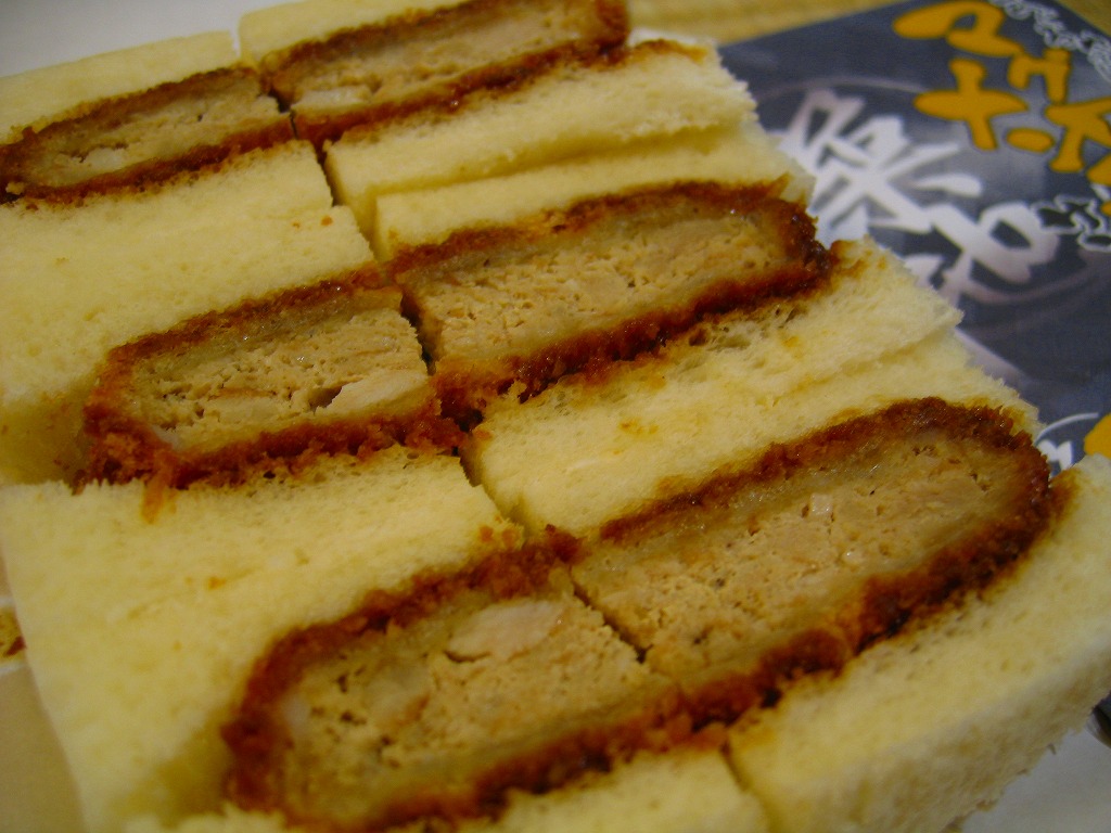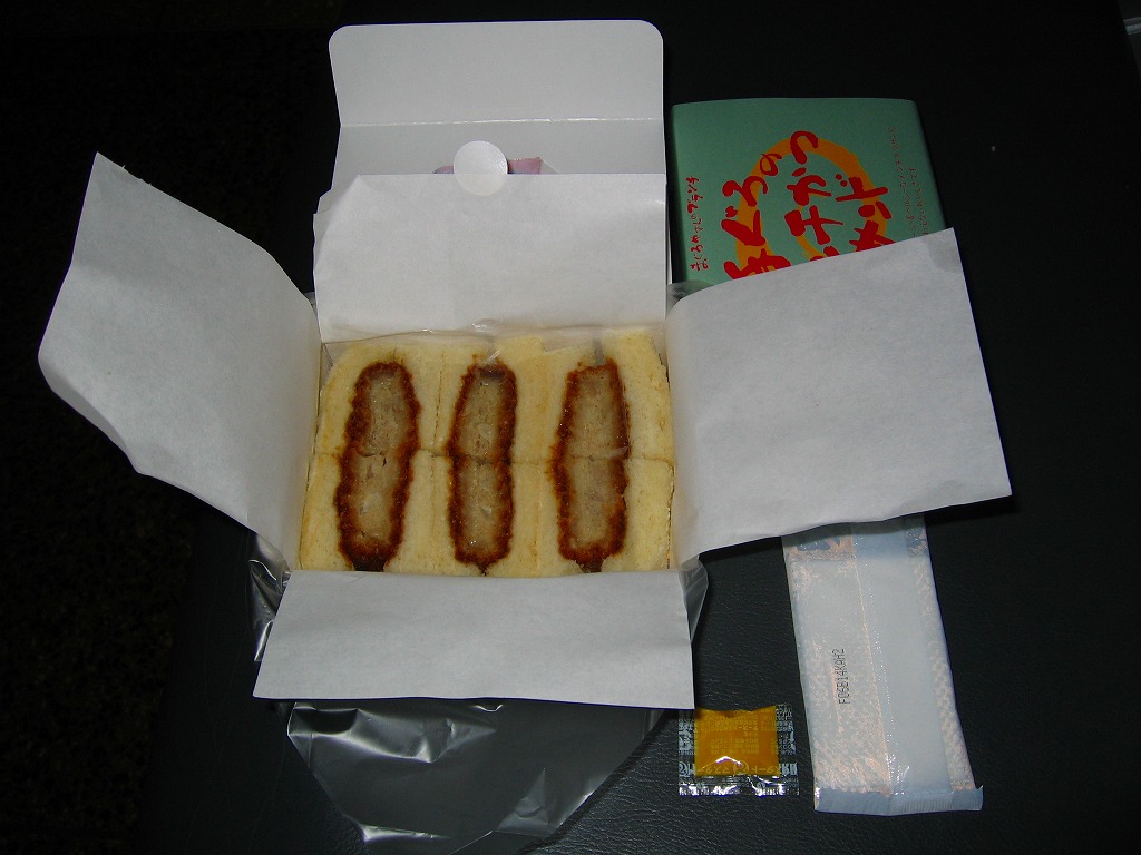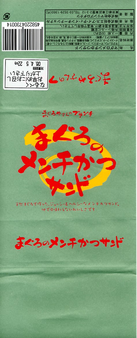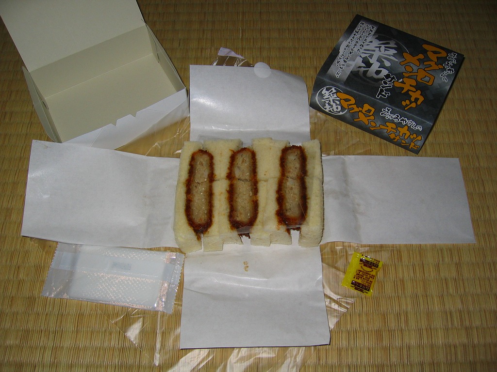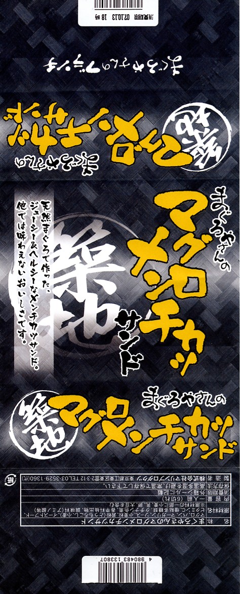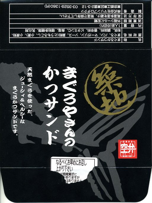 下の「まぐろやさんのかつサンド」と同じものだと思う。中身や分量や風味は同一で、商品名がまた変わり、値段が30円上がった。あるいはスーパーやデパートでの駅弁空弁催事用のパッケージだろうか。 【東京国際空港】1931(昭和6)年8月25日開港 東京都大田区羽田空港 http://www.tokyo-airport-bldg.co.jp/ 【株式会社マリンプロダクツ】東京都江東区東雲2−3−12 03(3529)1360 http://www.marine-prd.co.jp/ まぐろやさんのかつサンド(650円) 2007年7月1日に羽田空港第1旅客ターミナルJAL売店で購入