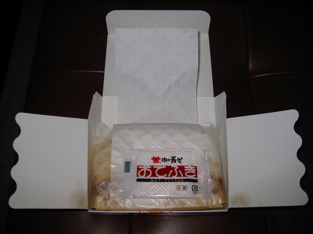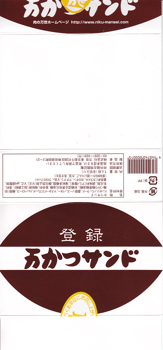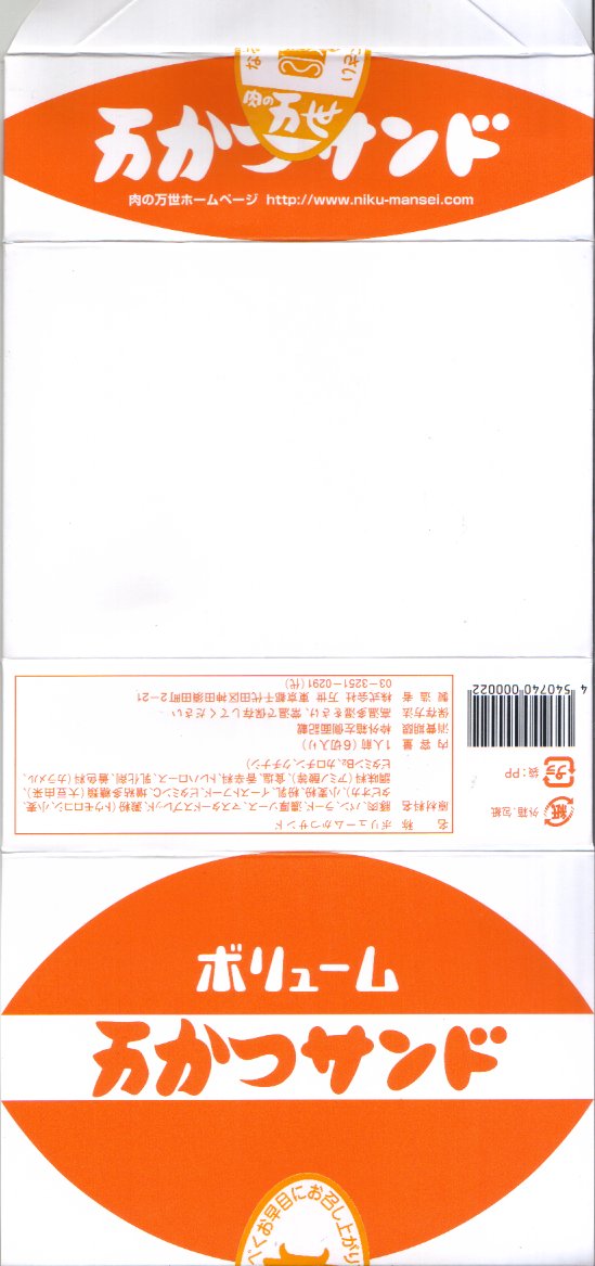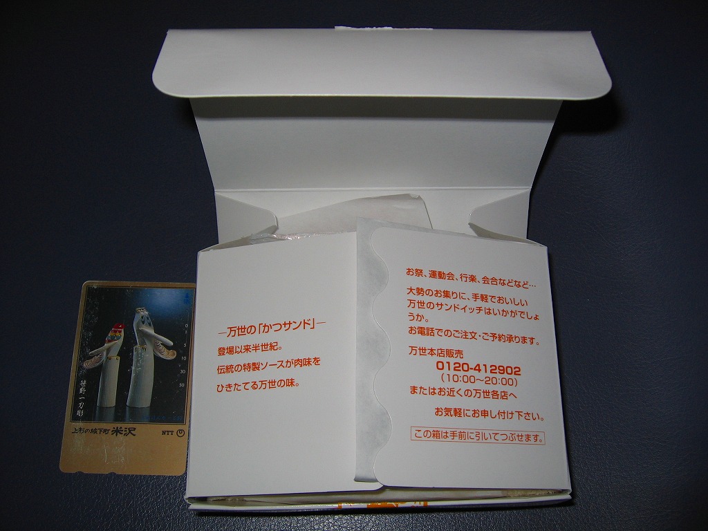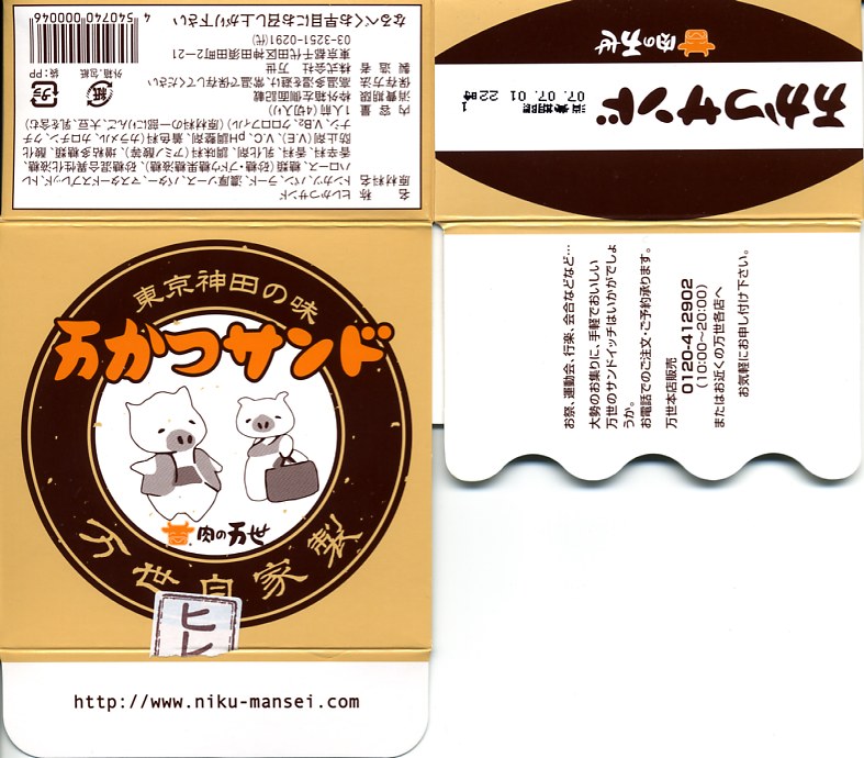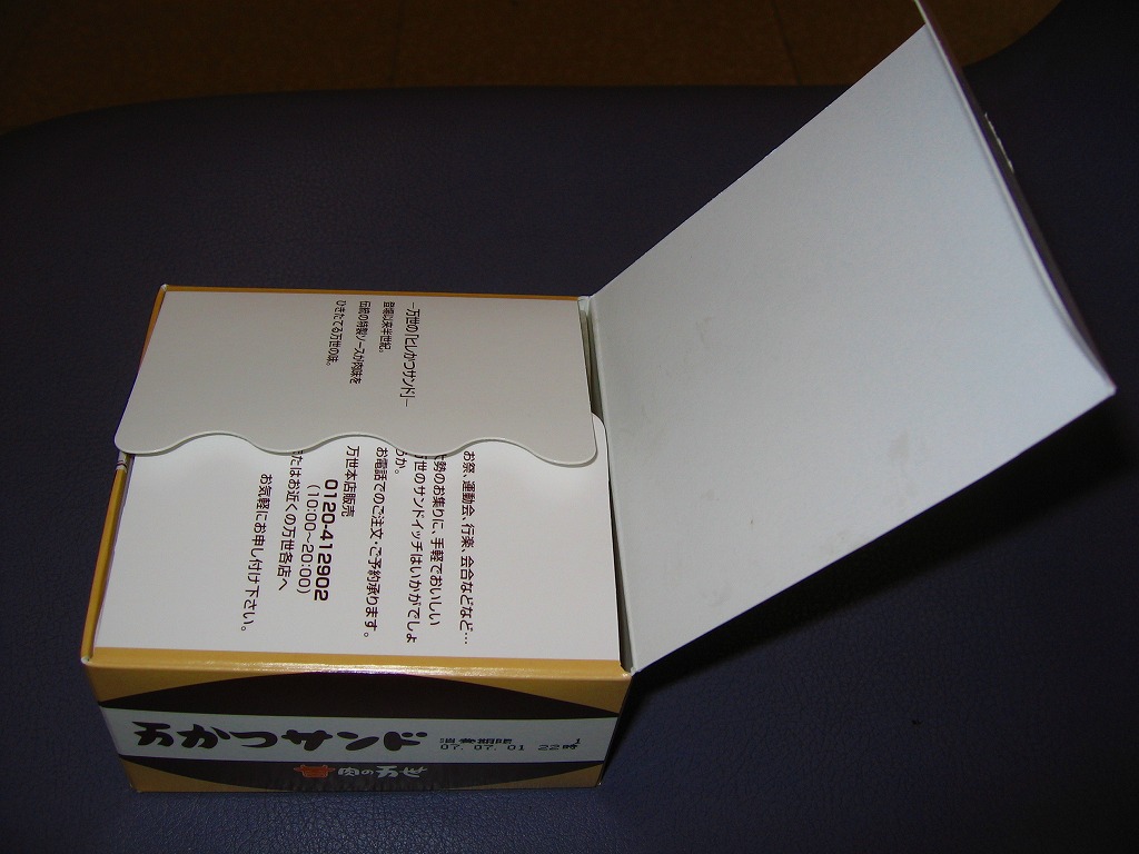 商品そのものは以前からあるようだが、羽田空港で見たのは購入時が初めて。パッケージは通常の「万かつサンド」と同じ大きさで中身も同じ、90グラムのトンカツがこちらは120グラム入るのが違いだという。それで100円差なのだからお買い得ではあるが、ロースカツなので脂肪塊もサイズアップするため、これが苦手であれば通常版を選択するのがよい。 【東京国際空港】1931(昭和6)年8月25日開港 東京都大田区羽田空港 http://www.tokyo-airport-bldg.co.jp/ 【株式会社万世】東京都千代田区神田須田町2−21 03(3251)0291 http://www.niku-mansei.com/ 万かつサンド(600円) 2002年12月14日に羽田空港搭乗待合室内売店で購入