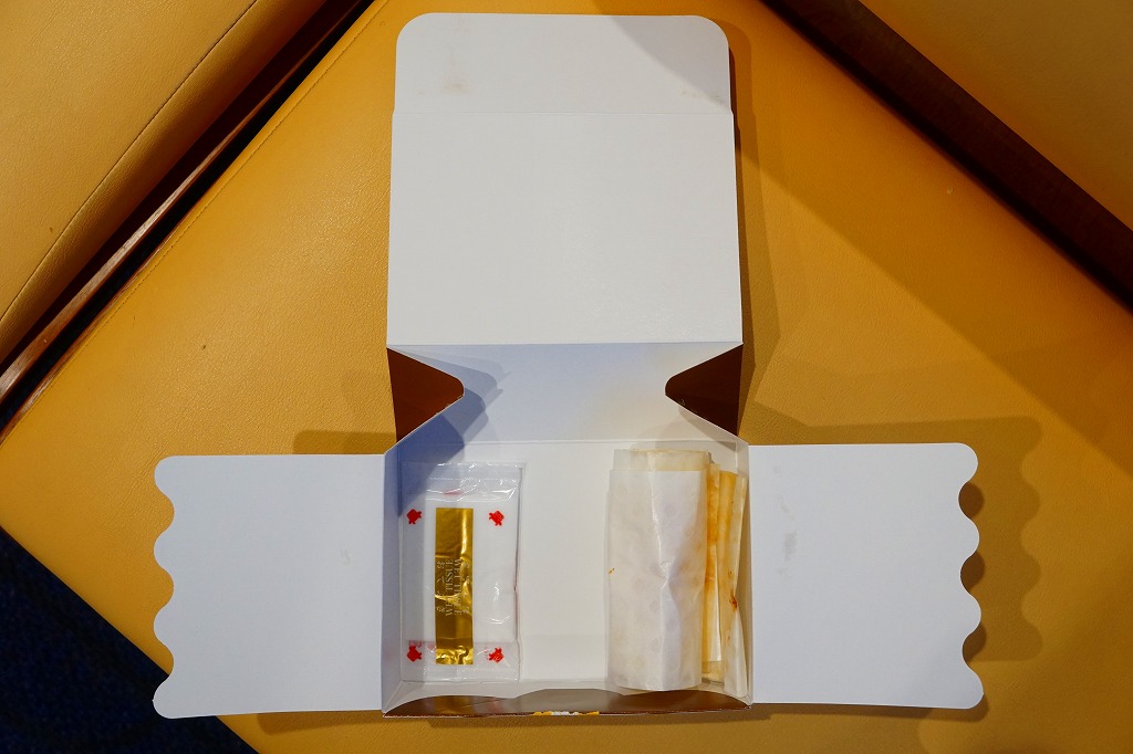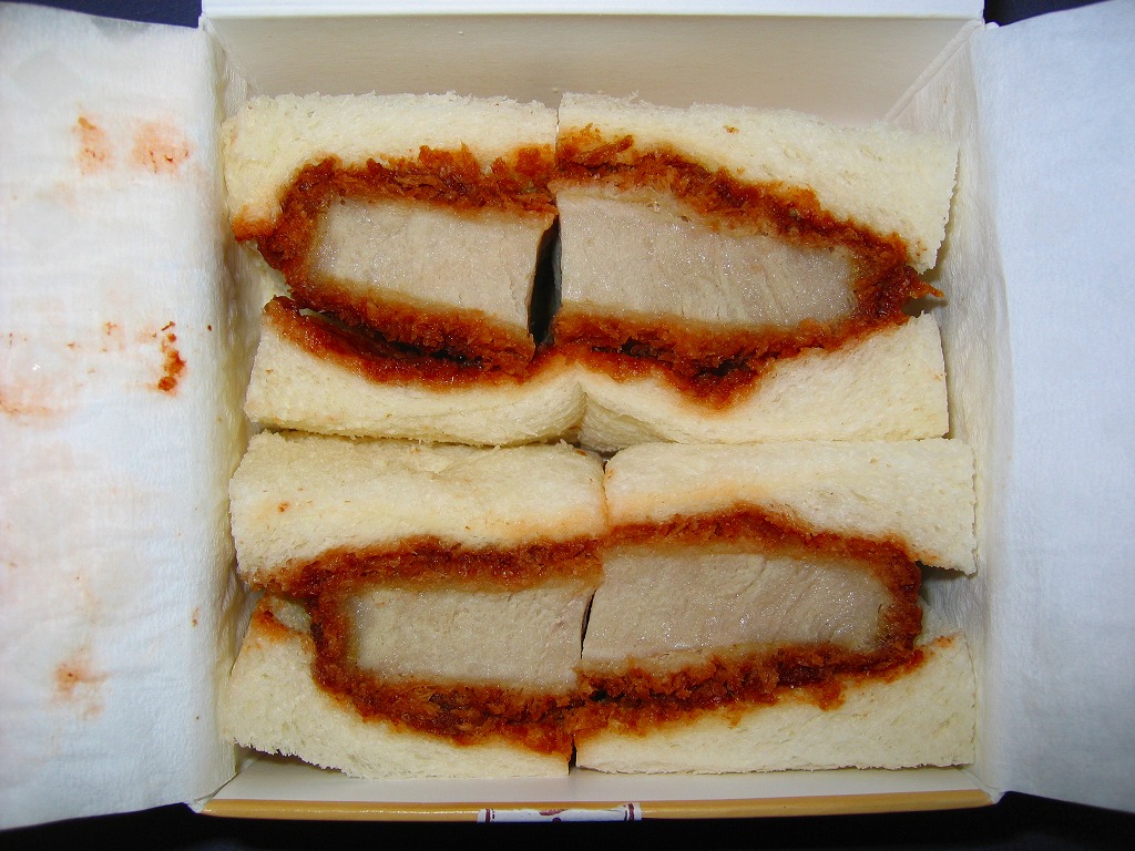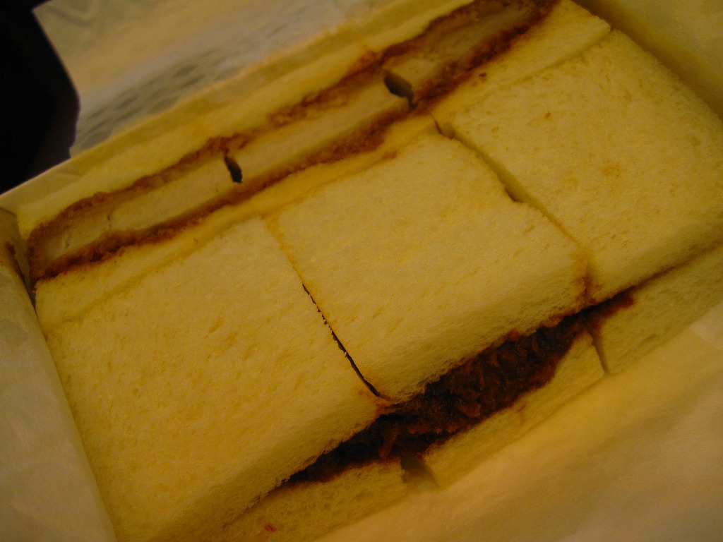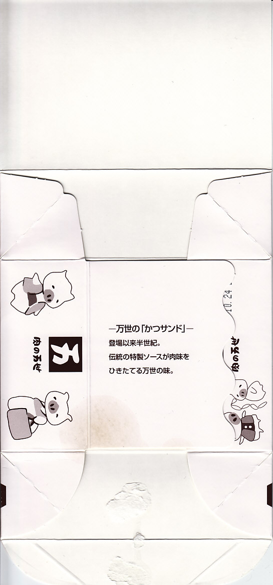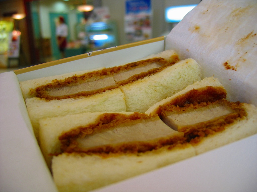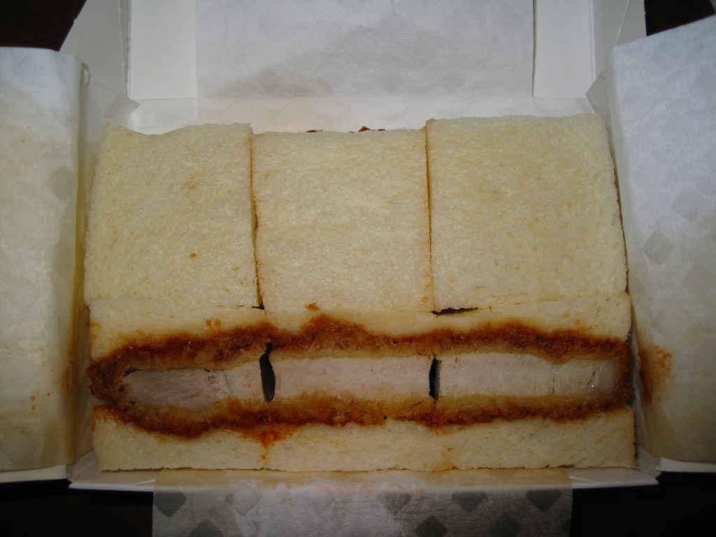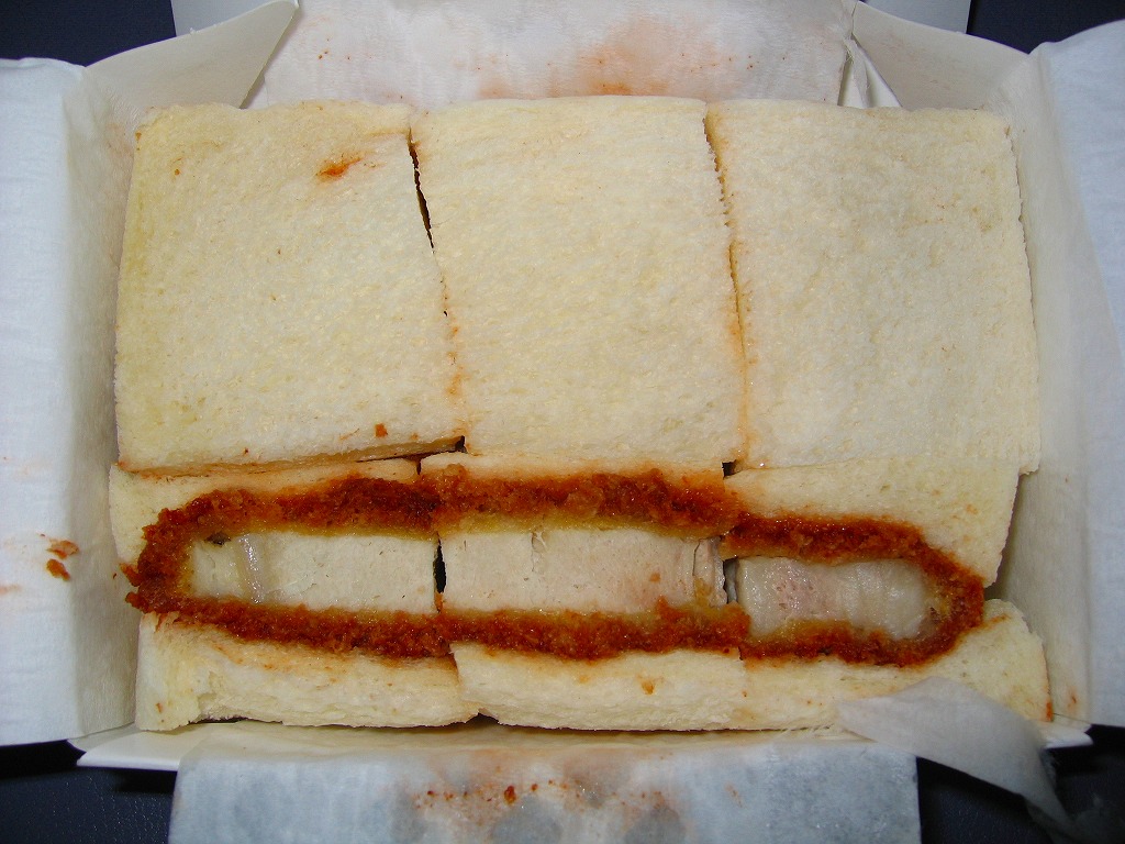 商品としては2009年8月の発売。空港に来たのはいつからだろうか。羽田空港で一番人気だと思われる、伝統のカツサンドの増量版。紙箱に収まるカツサンドに、ソース漬けのカツが1枚ではなく2枚挟まる。パンも耳付きになっていて、より増量感がある。商品の名前でも、パッケージの絵柄でも、普段の2倍をアピール。 値段も見栄えも豪快だが、食べると意外にくどく、肉の固さと脂の重さとソースの辛さが気になる。普段の組合せが、ソースとカツとパンのバランスが取れているのだろう。それでもインパクトは十分。 【東京国際空港】1931(昭和6)年8月25日開港 東京都大田区羽田空港 http://www.tokyo-airport-bldg.co.jp/ 【株式会社万世】東京都千代田区神田須田町2−21 0120-412902 http://www.niku-mansei.com/ 万かつサンド(650円) 2010年10月24日に羽田空港第1旅客ターミナルビル売店で購入