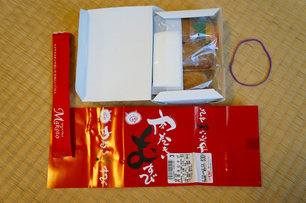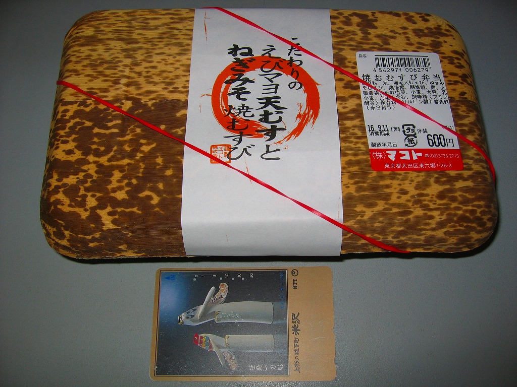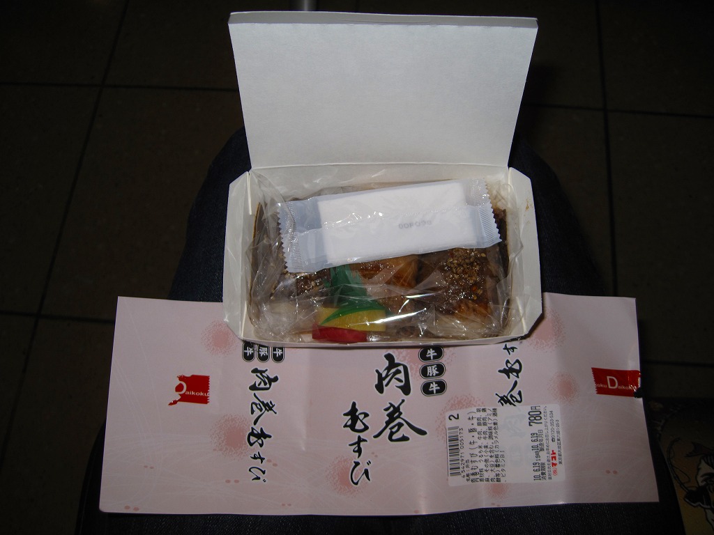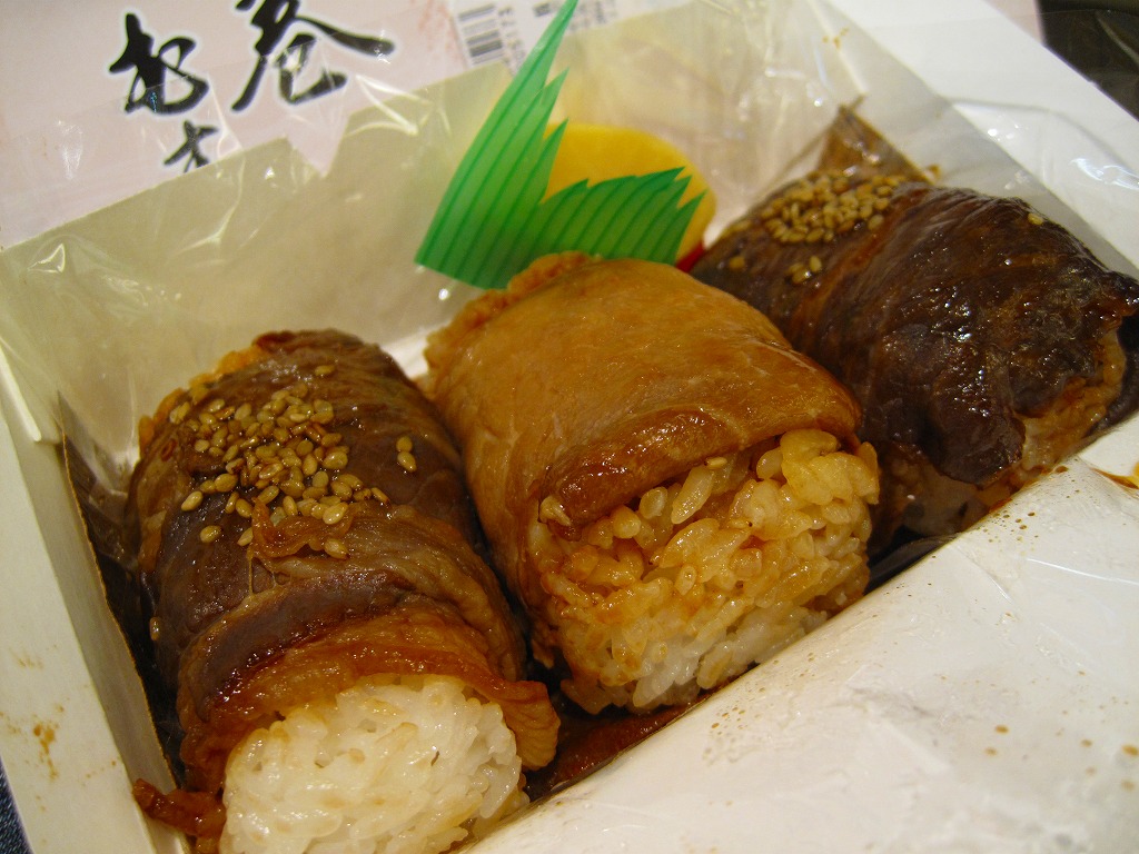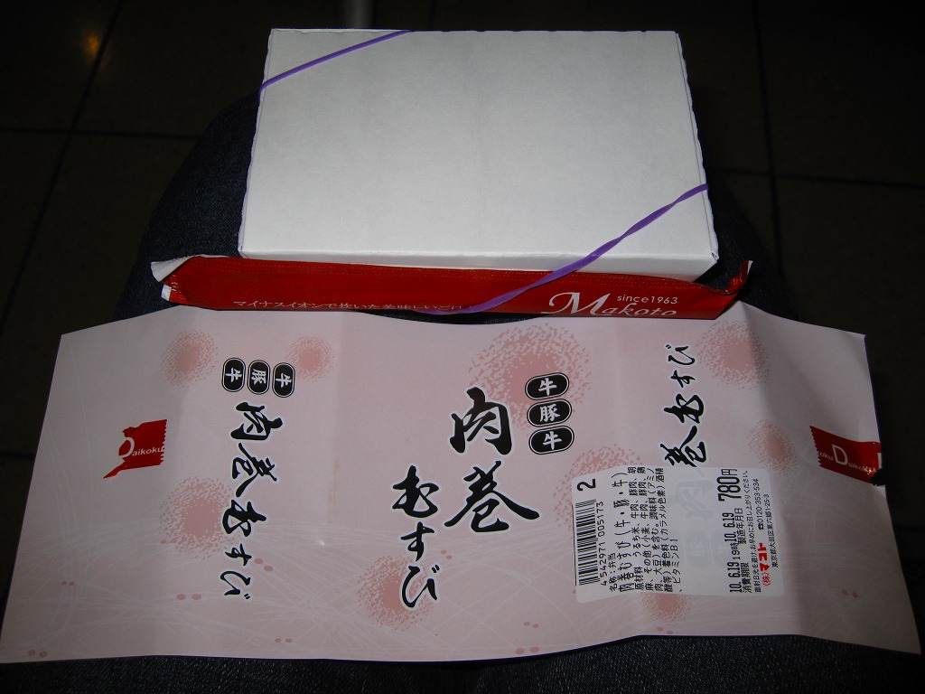下記商品の2012年時点での姿か。掛紙が真っ赤になり、肉巻きむすびはすべて豚肉の同じものとなり、価格が2割下がった。 【東京国際空港】1931(昭和6)年8月25日開港 東京都大田区羽田空港 http://www.tokyo-airport-bldg.co.jp/ 【株式会社マコト】東京都大田区東六郷1−25−3 0120-353-534 http://www.makoto-j.co.jp/ 肉巻むすび(780円) 2010年6月19日に羽田空港第2旅客ターミナルビル空弁売店で購入