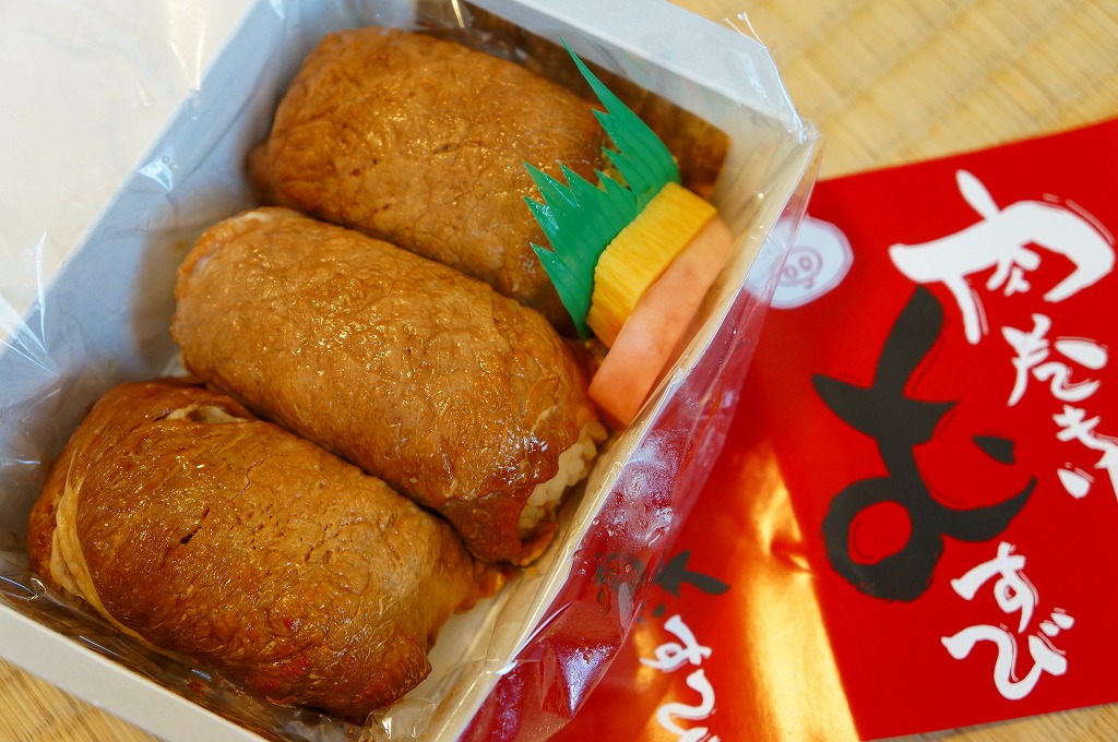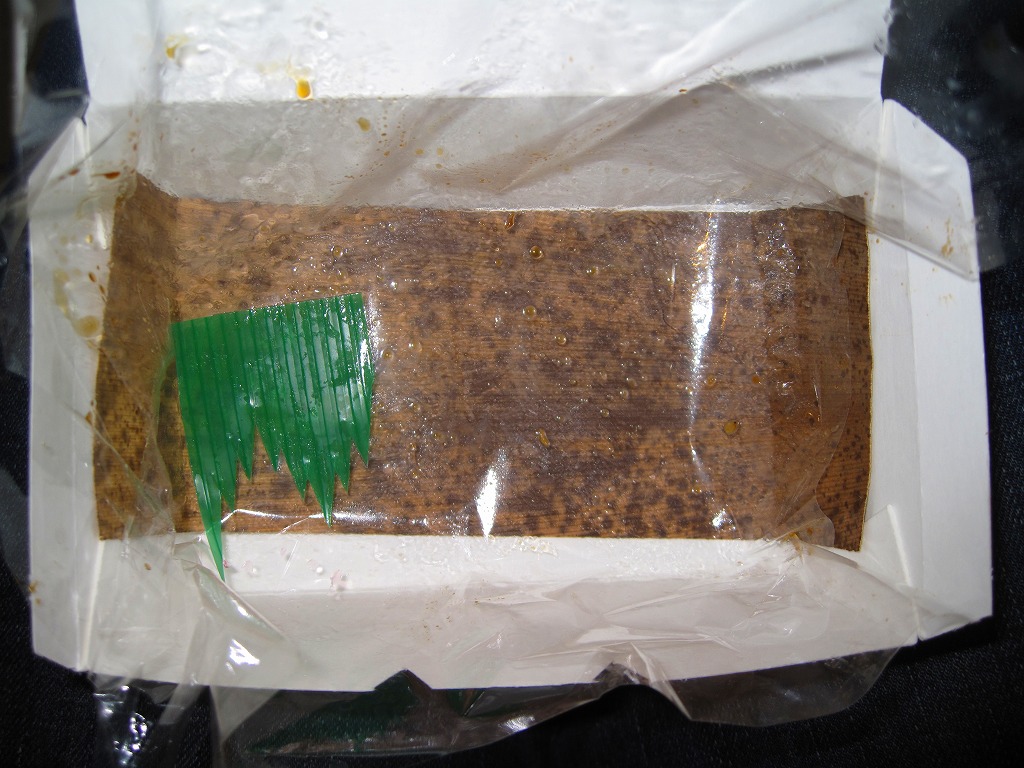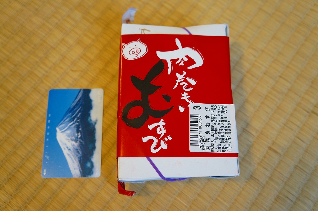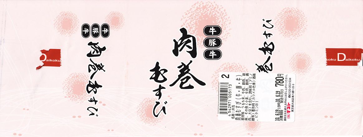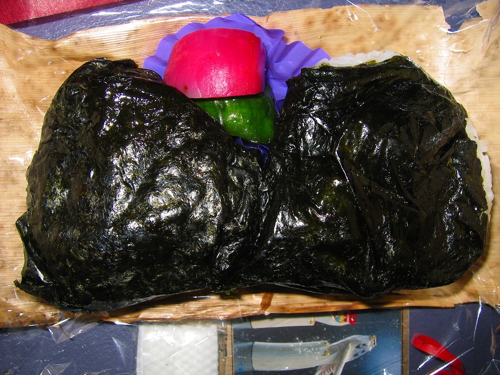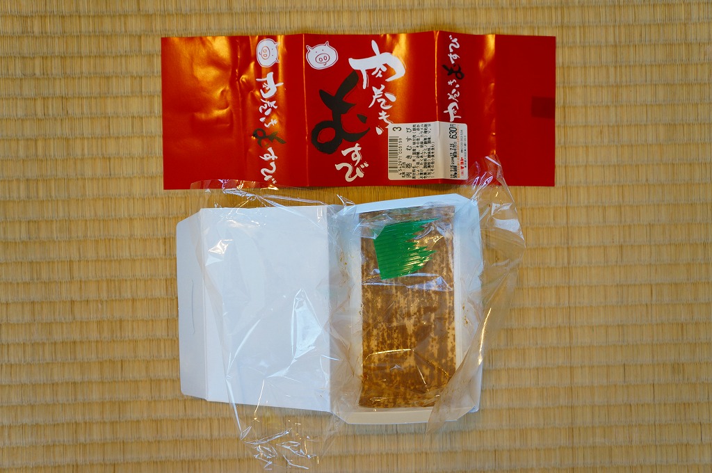 下記商品の2012年時点での姿か。掛紙が真っ赤になり、肉巻きむすびはすべて豚肉の同じものとなり、価格が2割下がった。 【東京国際空港】1931(昭和6)年8月25日開港 東京都大田区羽田空港 http://www.tokyo-airport-bldg.co.jp/ 【株式会社マコト】東京都大田区東六郷1−25−3 0120-353-534 http://www.makoto-j.co.jp/ 肉巻むすび(780円) 2010年6月19日に羽田空港第2旅客ターミナルビル空弁売店で購入