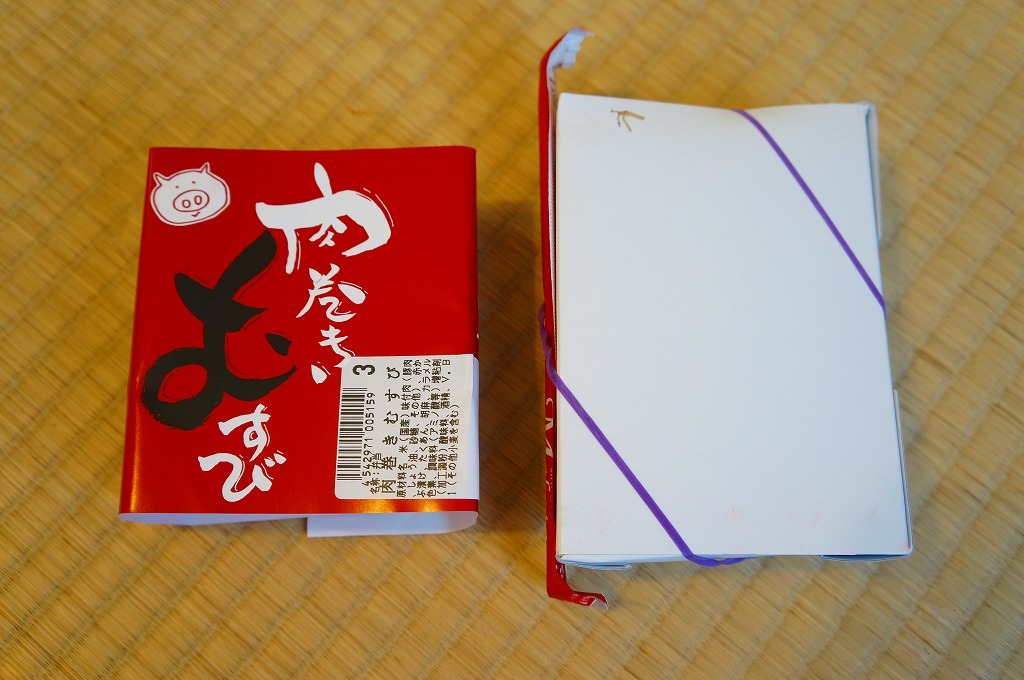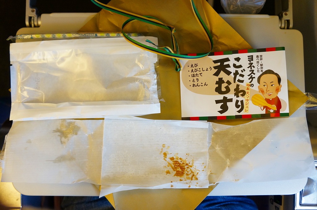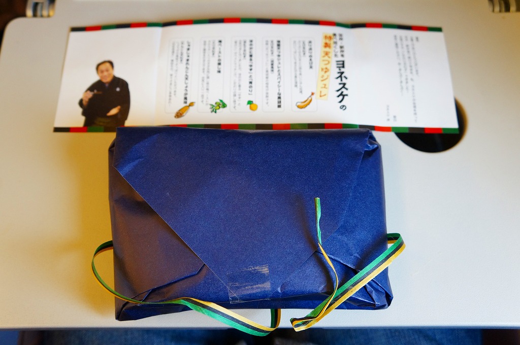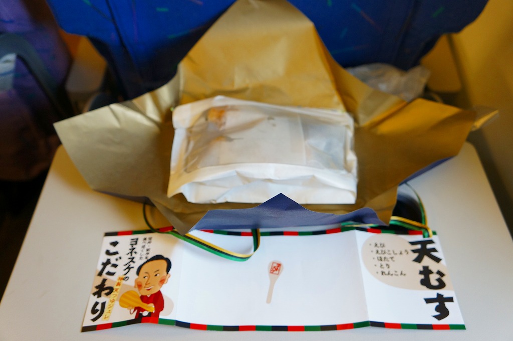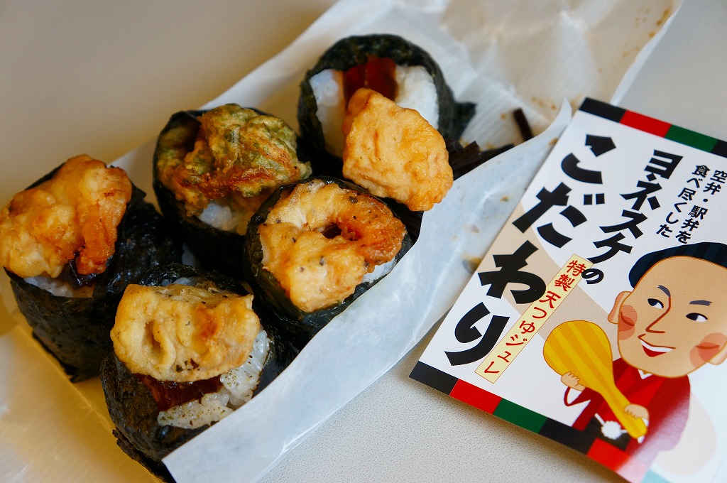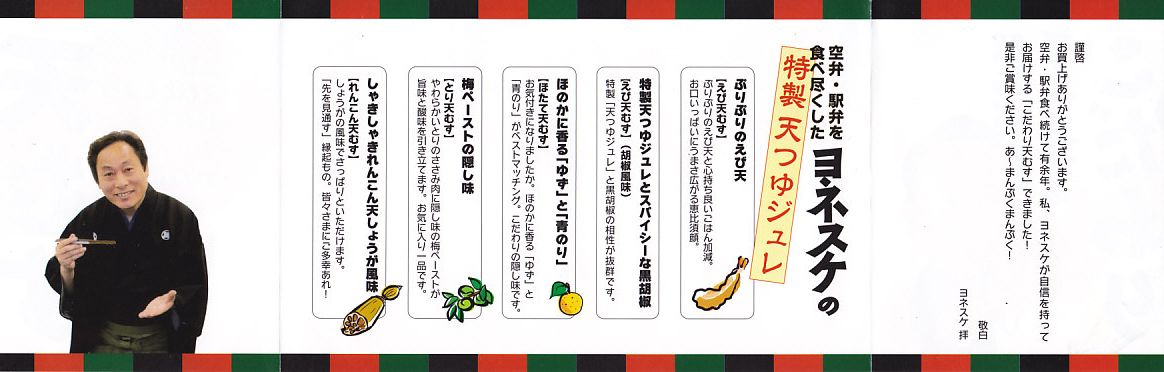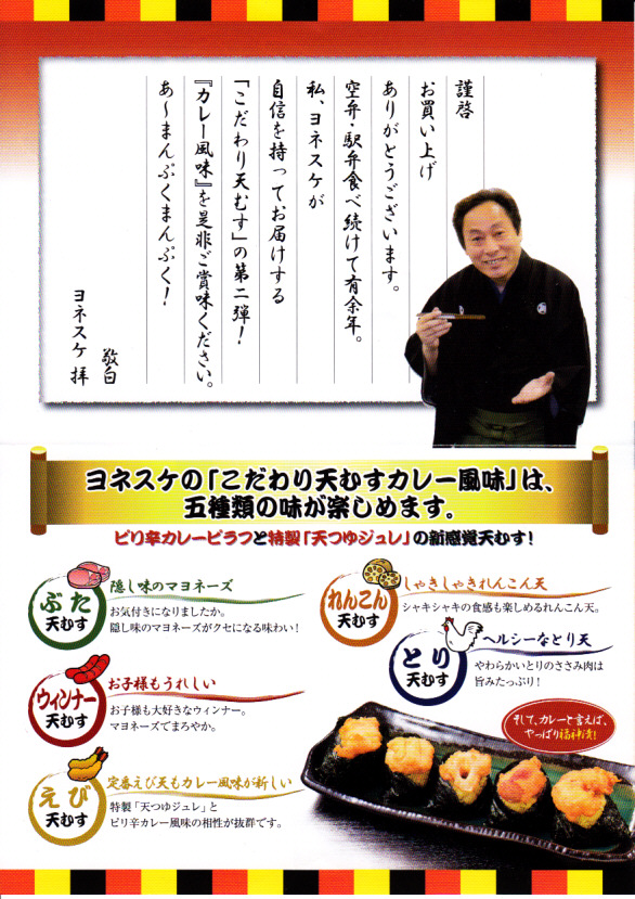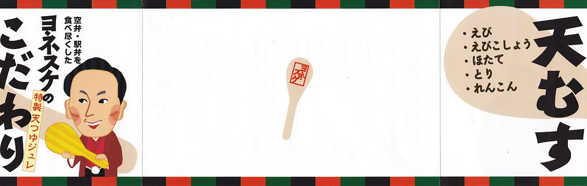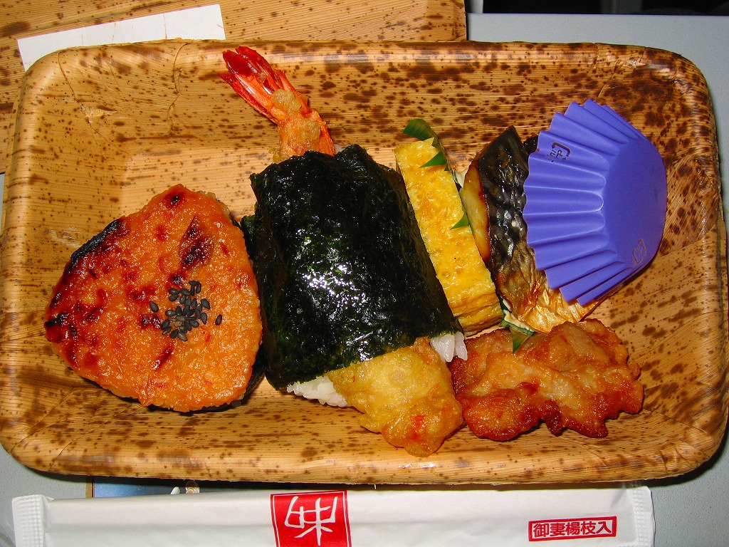 公式には2012年10月1日、実際には9月15日からの発売。落語家であり、テレビのワイドショーで人気を博し、駅弁と空弁のブログで著書まで出したヨネスケ氏が監修した空弁。掛紙にはテレビ番組でやっていたように、しゃもじを持つ姿での氏のイラストが描かれる。 中身はその掛紙に書かれるとおり、えび、えびこしょう、ほたて、とり、れんこんの天むす、つまりエビ天を載せた小さなおむすびが各1個、まとめてシートと封筒と紙風呂敷で三重に包まれるもの。天むすはそもそも衣と油の味が強い商品なので、見た目や味は5個ともほぼ同じだと感じた。 ヨネスケ氏は日本テレビ系列の平日朝のワイドショー番組「ルックルックこんにちは」で、一般家庭の夕食に予告なく押し掛ける「突撃!隣の晩ごはん」というコーナーを16年間も続け、番組が終了してもそのコーナーだけ他の番組へ移籍していくほどの人気により、落語家の桂米助でない姿のほうがむしろ広く知られた。ブログでは仕事で日本全国を飛び回る間に食べた駅弁や空弁を掲載。羽田空港と東京駅で多くを占めるのは仕方ないが、ここでのシンプルで時には辛口な批評もまた、人気と注目を集めていると思う。 【東京国際空港】1931(昭和6)年8月25日開港 東京都大田区羽田空港 http://www.tokyo-airport-bldg.co.jp/ 【日本エアポートデリカ株式会社】東京都大田区羽田空港1−8−2 03(5708)7788 http://www.airdeli.co.jp/ 御結びせっと(525円) 2012年10月28日に羽田空港第1旅客ターミナルビル搭乗待合室BLUESKYで購入