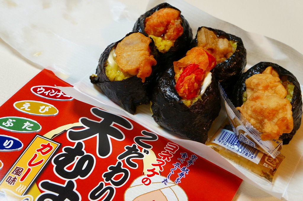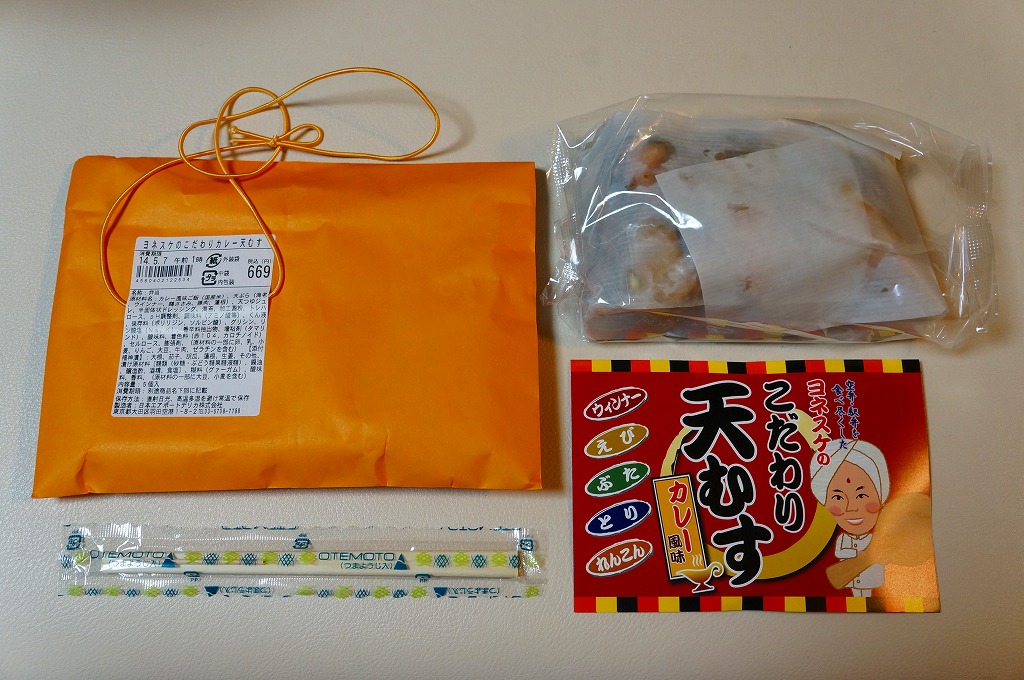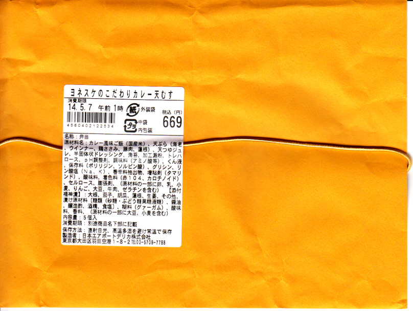 2015年9月11日の発売。羽田空港で定番の空弁となった、下記の「ヨネスケのこだわり天むす」と、浅草ヨシカミの「ロースカツサンド」を、ひとつの空弁としたもの。小さな小さなプラ容器をふたつ重ねて、黒いほうが海老天ととり天とレンコン天の天むす3個、白いほうがロースカツのソース漬けのサンドイッチ。たしかに両者を足して2で割る内容。量がとても少ないので、これだけを買って食べれば、分量の割に高いなあと感じるところ。 【東京国際空港】1931(昭和6)年8月25日開港 東京都大田区羽田空港 http://www.tokyo-airport-bldg.co.jp/ 【日本エアポートデリカ株式会社】東京都大田区羽田空港1−8−2 03(5708)7788 http://www.airdeli.co.jp/ ヨネスケのこだわり天むすカレー風味(669円) 2014年5月6日に羽田空港の売店で購入