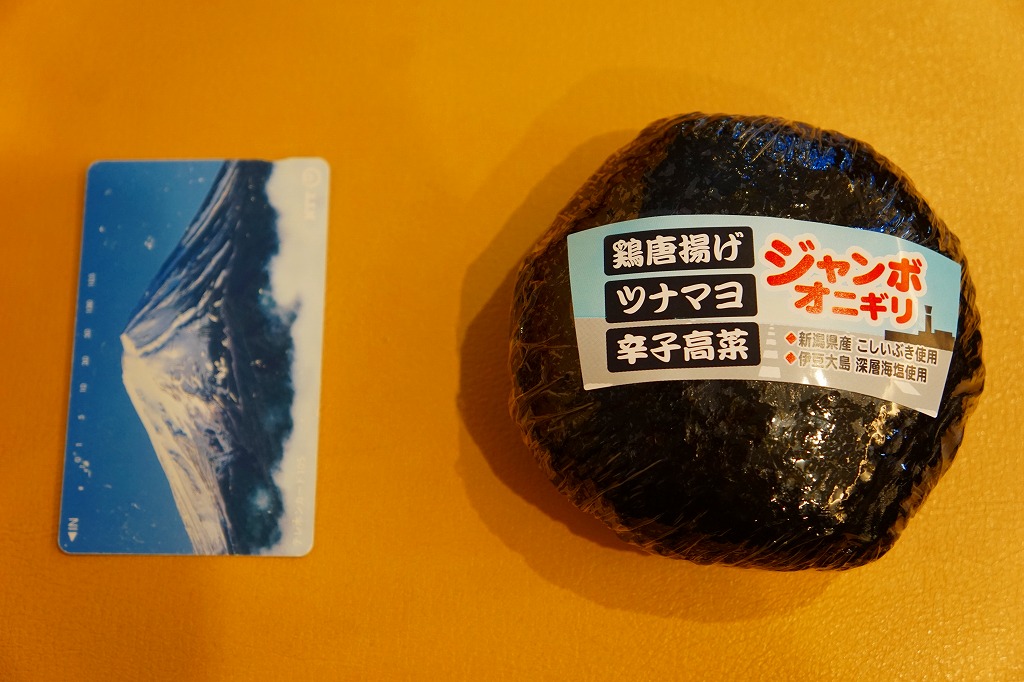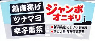 空弁屋と東京都恵比寿の日本料理店が2015年2月21日に発売。容器や包装は発売当初とは異なる模様。小柄な正八角形の容器の、下段に手まりずし大のアナゴやサクラエビなどの円筒茶飯を5個、上段に玉子焼、ニンジンやフキなどの煮物、レンコン揚げなどのおかずを詰める。量を抑えた高級弁当で、朝食や空弁に向く感じ。 【東京国際空港】1931(昭和6)年8月25日開港 東京都大田区羽田空港 http://www.tokyo-airport-bldg.co.jp/ 【日本エアポートデリカ株式会社】東京都大田区羽田空港1−8−2 03(5708)7788 http://www.airdeli.co.jp/ ジャンボオニギリ(390円) 2018年2月15日に羽田空港第1旅客ターミナルビル搭乗待合室の売店で購入