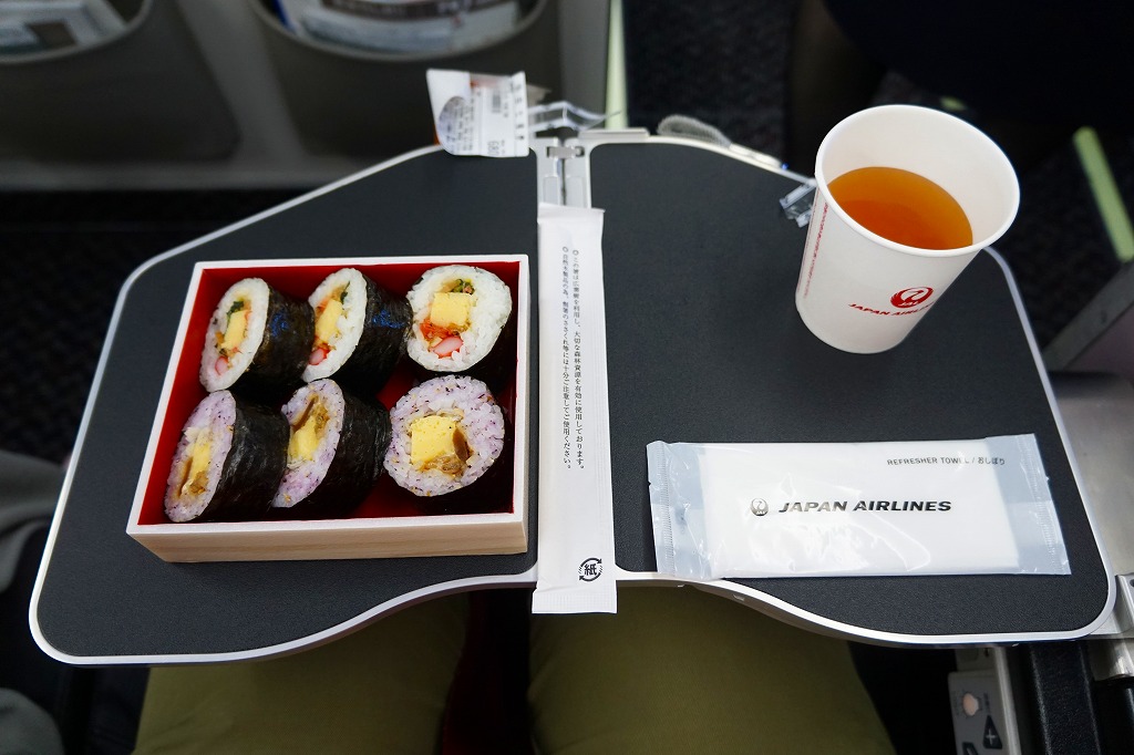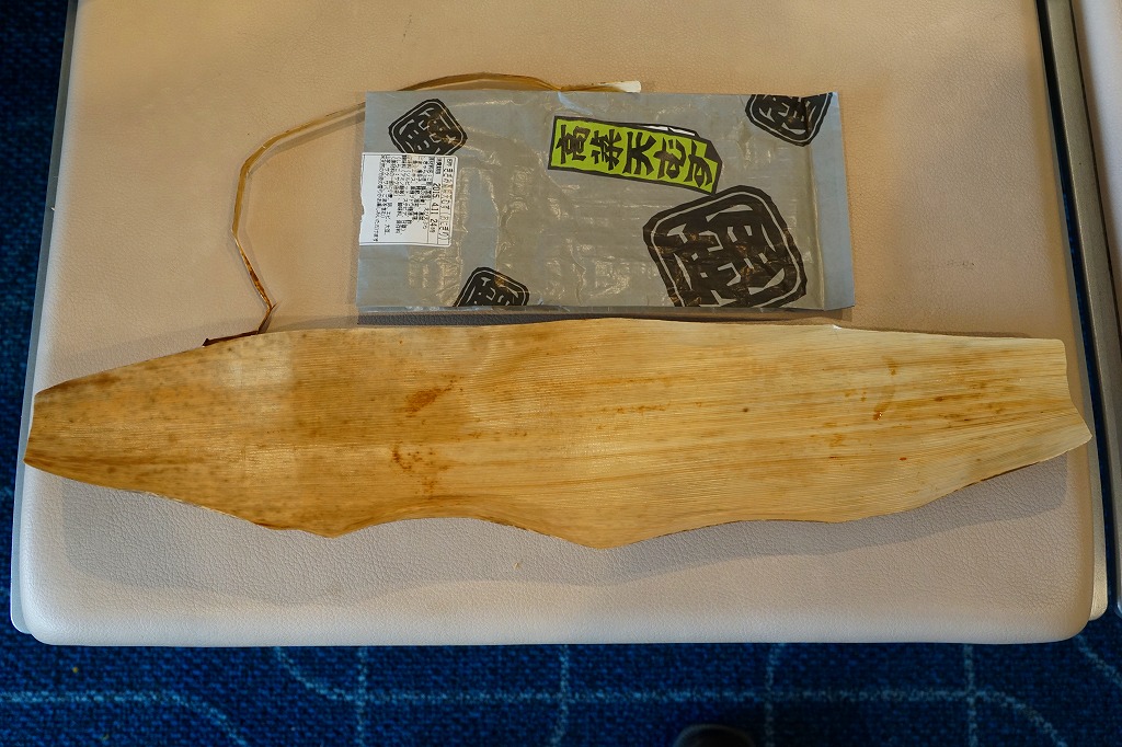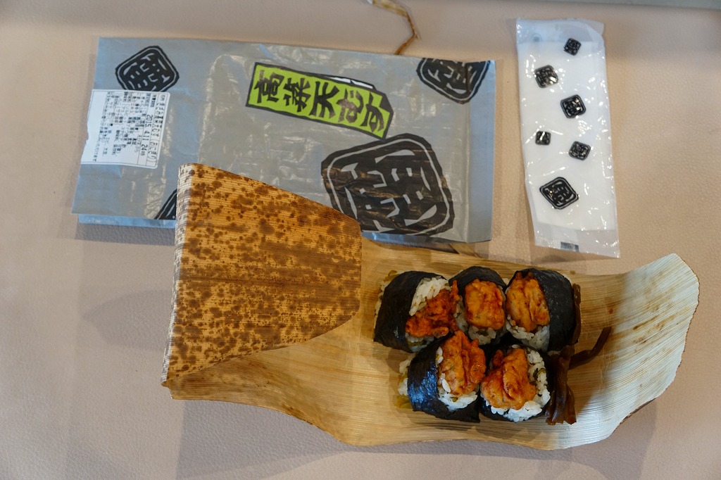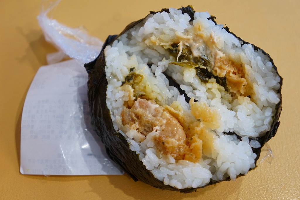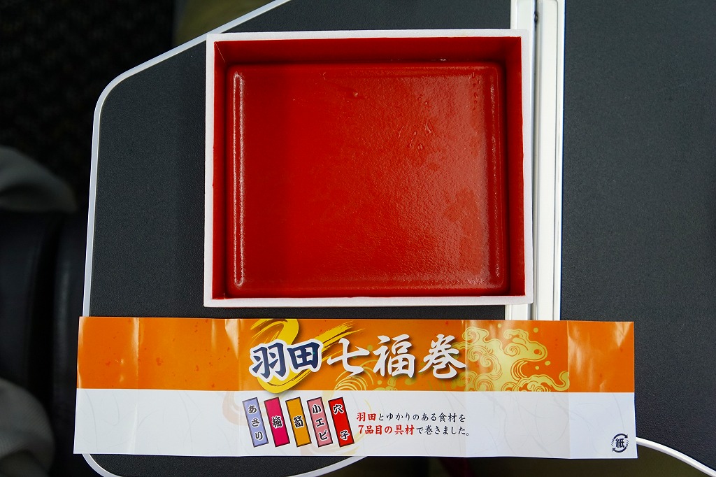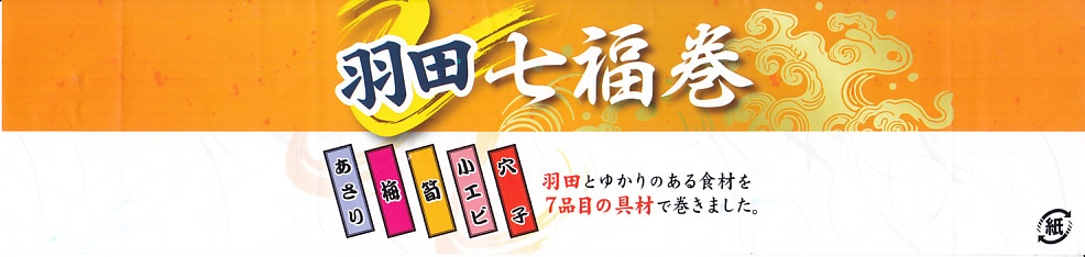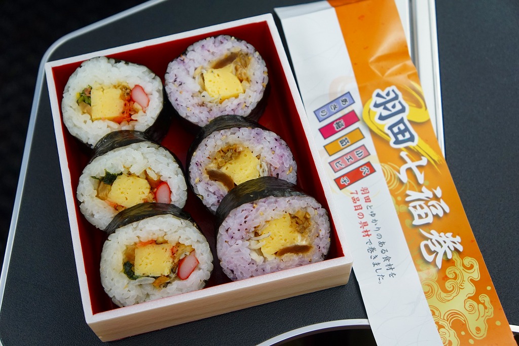 空弁には見えないが、売店では明らかに空弁として販売。調製元は羽田の空弁屋で、シールに管制塔のシルエットが見える。丸い直巻きの握り飯を、そのままラップに包んで、商品名のシールを貼る。具はそのシールに書いてあるとおり「鶏唐揚げ」「ツナマヨ」「辛子高菜」とあり、その3種類が飯の中心で混ざり合う。具も飯も量も多くて高価なコンビニおにぎりか、食事代が高い空港で満腹にしてくれるコスパ最高のおにぎりか。 【東京国際空港】1931(昭和6)年8月25日開港 東京都大田区羽田空港 http://www.tokyo-airport-bldg.co.jp/ 【日本エアポートデリカ株式会社】東京都大田区羽田空港1−8−2 03(5708)7788 http://www.airdeli.co.jp/ 羽田七福巻(680円) 2017年6月3日に羽田空港第1旅客ターミナルビルの売店で購入