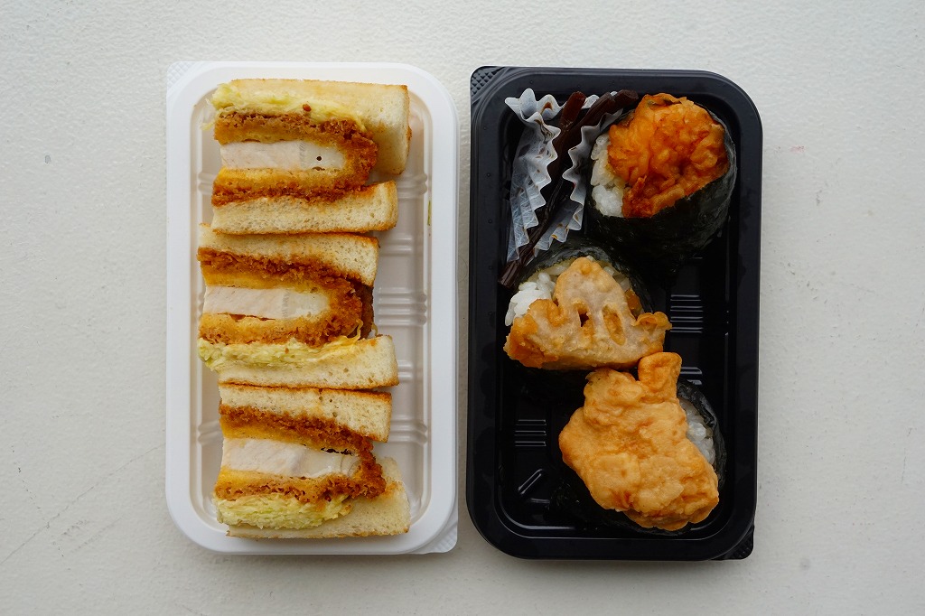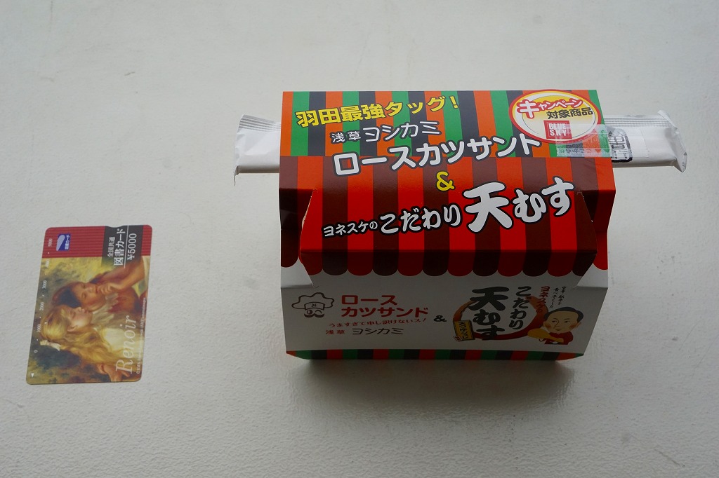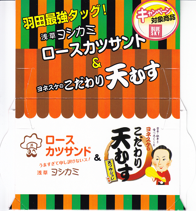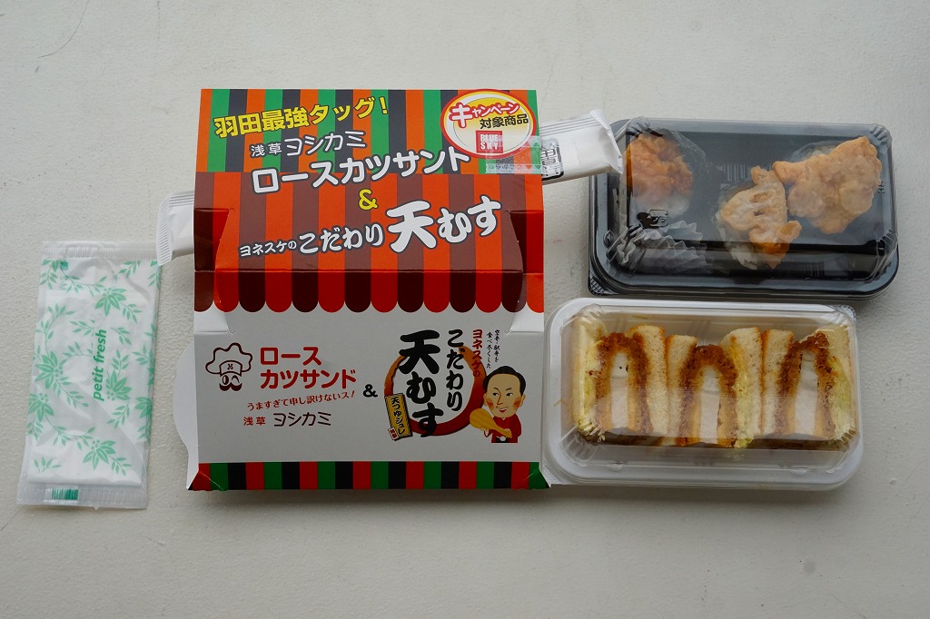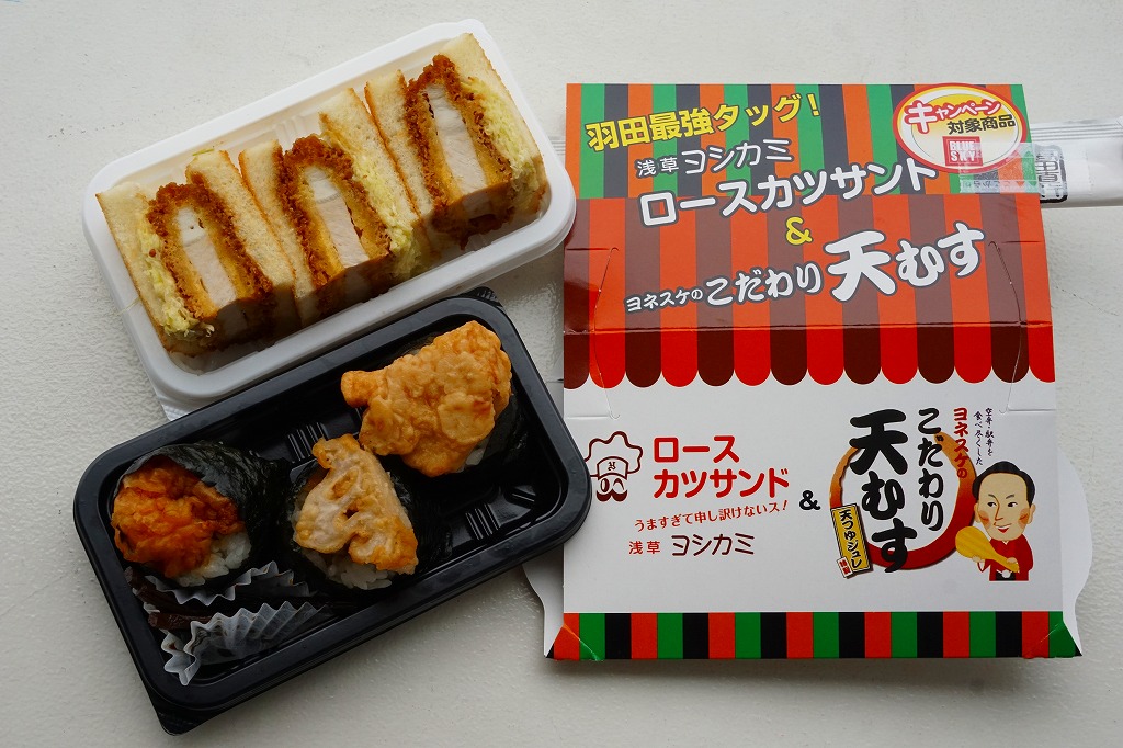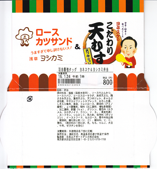 2017年6〜7月のごく短期間のみの販売か。中身は2種の太巻が3個ずつ。具は玉子焼を芯にして、一方にはタケノコ煮とアサリ煮など、さらに飯にゆかりを混ぜ、他方は焼アナゴ、小エビ佃煮、カニカマなどを詰めて、どれを数えているか不明だが「羽田とゆかりのある食材を7品目の具材で巻きました」のだそうな。 【東京国際空港】1931(昭和6)年8月25日開港 東京都大田区羽田空港 http://www.tokyo-airport-bldg.co.jp/ 【日本エアポートデリカ株式会社】東京都大田区羽田空港1−8−2 03(5708)7788 http://www.airdeli.co.jp/ 浅草ヨシカミロースカツサンド&ヨネスケのこだわり天むす(800円) 2016年1月23日に羽田空港の売店で購入