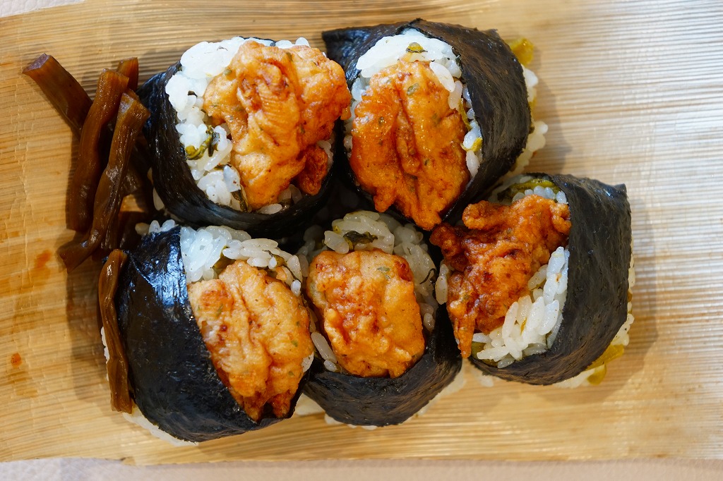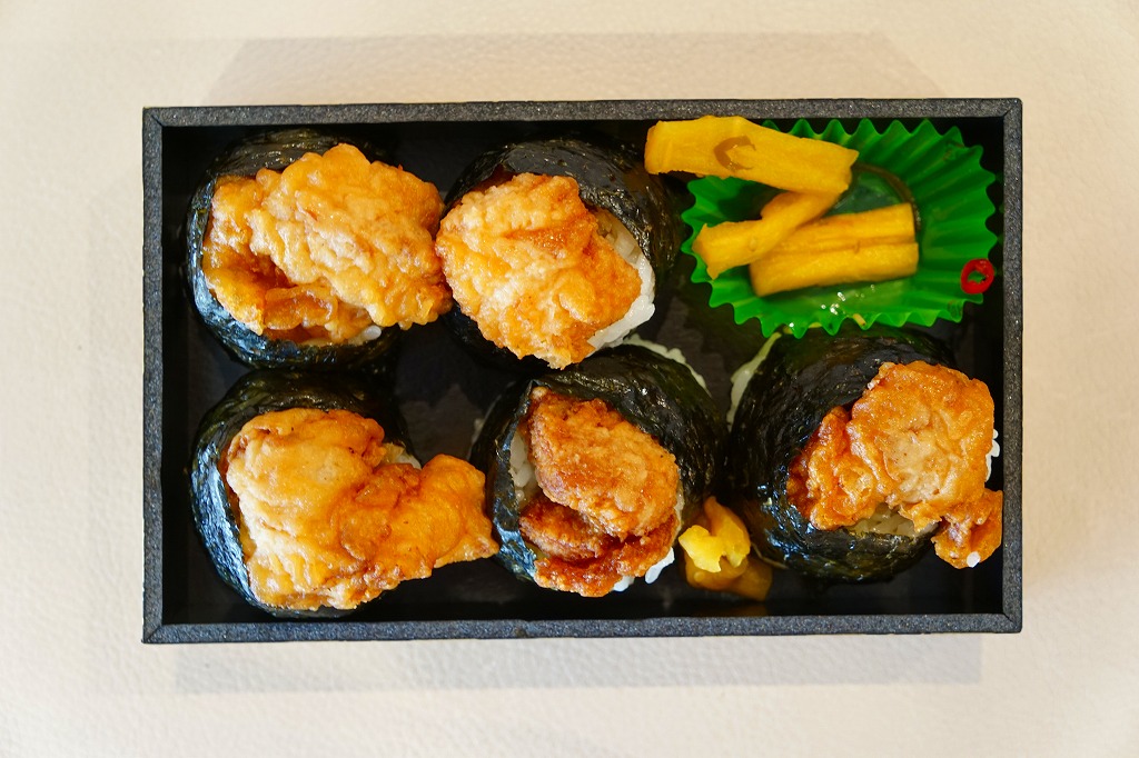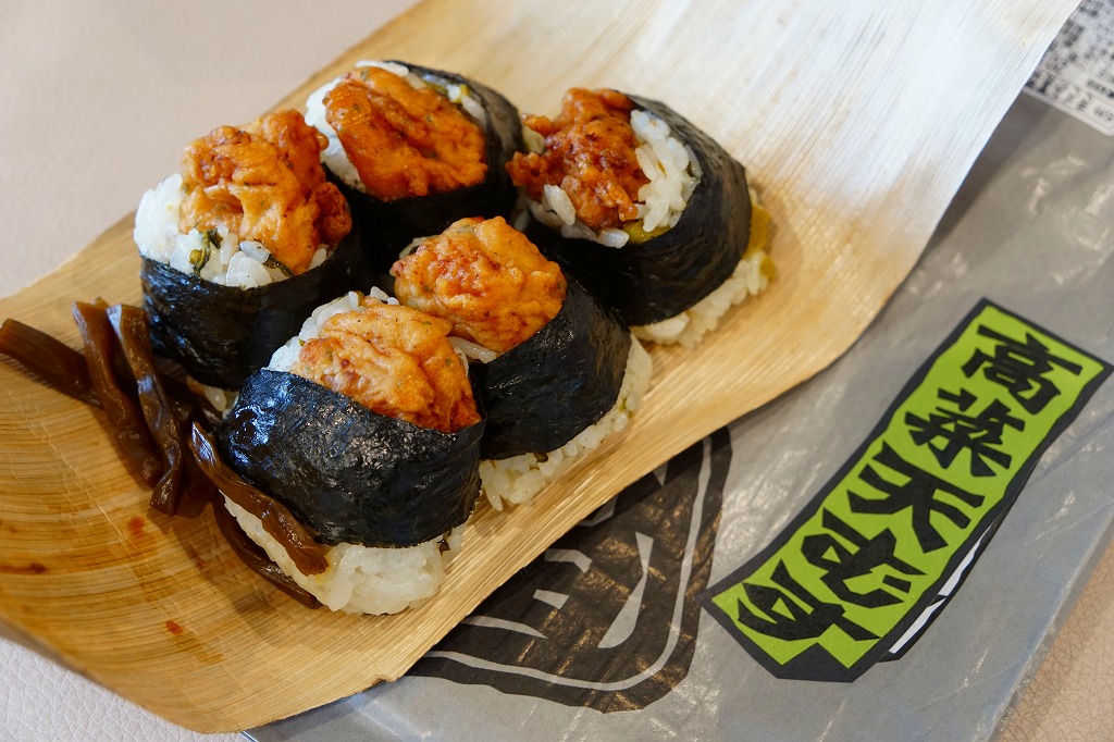 2015年4月の新作か。黒い小箱に、名古屋名物で羽田空港でも幅を利かせる天むすのようなプチおむすびが5個と、大根漬が収まる。商品名のとおり中身は天むすではなく、おむすびの上に載るのは鶏唐揚。エビ天より大きく脂っこいから、同じ分量でも胃に重たく感じる。朝飯に下記の天むすと一緒に食べたが、これは朝飯向けではなかったなと後悔。 【東京国際空港】1931(昭和6)年8月25日開港 東京都大田区羽田空港 http://www.tokyo-airport-bldg.co.jp/ 【日本エアポートデリカ株式会社】東京都大田区羽田空港1−8−2 03(5708)7788 http://www.airdeli.co.jp/ 高菜天むす(735円) 2015年4月11日に羽田空港第1旅客ターミナルビル空弁売店で購入