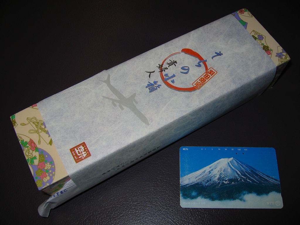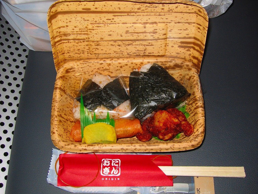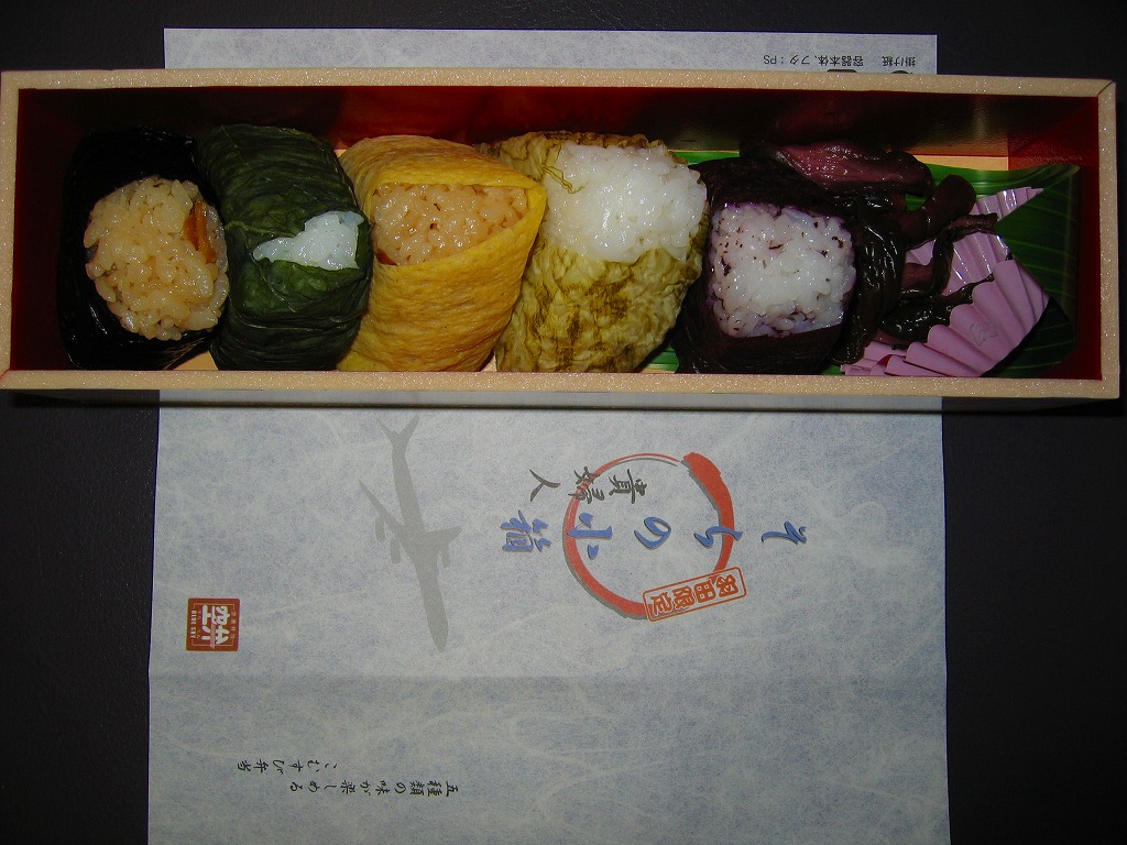 2004年7月17日に登場した「そらの小箱」シリーズ4種のうちひとつ。「空の貴婦人」と呼ばれたダグラスDC−8型ジェット機をイメージしたという。とても細長い発泡材の箱に巻き付けた掛紙には、その機体のシルエットも描かれる。 中身はやはり小柄な五目、高菜、玉子、とろろ昆布、ゆかりのおにぎりが各1個。おにぎりは風味も美しいが、これにしば漬けを添えているため、容器の開封時に強い刺激臭が漂ってきた。 【東京国際空港】1931(昭和6)年8月25日開港 東京都大田区羽田空港 http://www.tokyo-airport-bldg.co.jp/ 【株式会社NRE大増 東京店】東京都台東区東上野2−18−18 03(3810)7551 http://www.nre.co.jp/nre-daimasu/ おにぎん(714円) 2005年1月10日に羽田空港第2旅客ターミナルビル空弁工房で購入