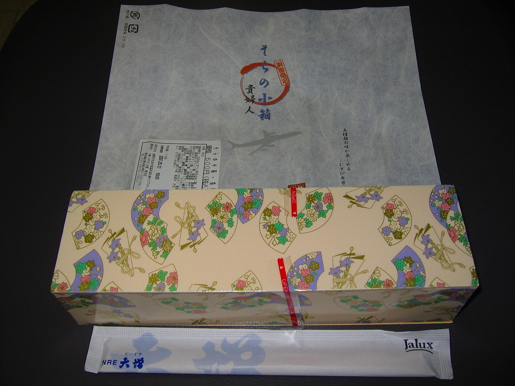 2010年1月までに登場か。牛乳パック素材の白い紙箱に、商品名を書いた桃色の掛紙を巻く。透明のシートに軽く包まれる中身は、たっぷりのタレをまとう牛肉や豚肉で白御飯を巻いたおむすびが3個と、たくあん1切れ。かつての宮崎名物が全国化、定番化のうえ、このように空弁にもなった。おにぎり弁当の軽さと、分量や肉の味の重さが同居する。 【東京国際空港】1931(昭和6)年8月25日開港 東京都大田区羽田空港 http://www.tokyo-airport-bldg.co.jp/ 【株式会社マコト】東京都大田区東六郷1−25−3 0120-353-534 http://www.makoto-j.co.jp/ そらの小箱 貴婦人(600円) 2007年5月12日に羽田空港第1ターミナル空弁売り場で購入