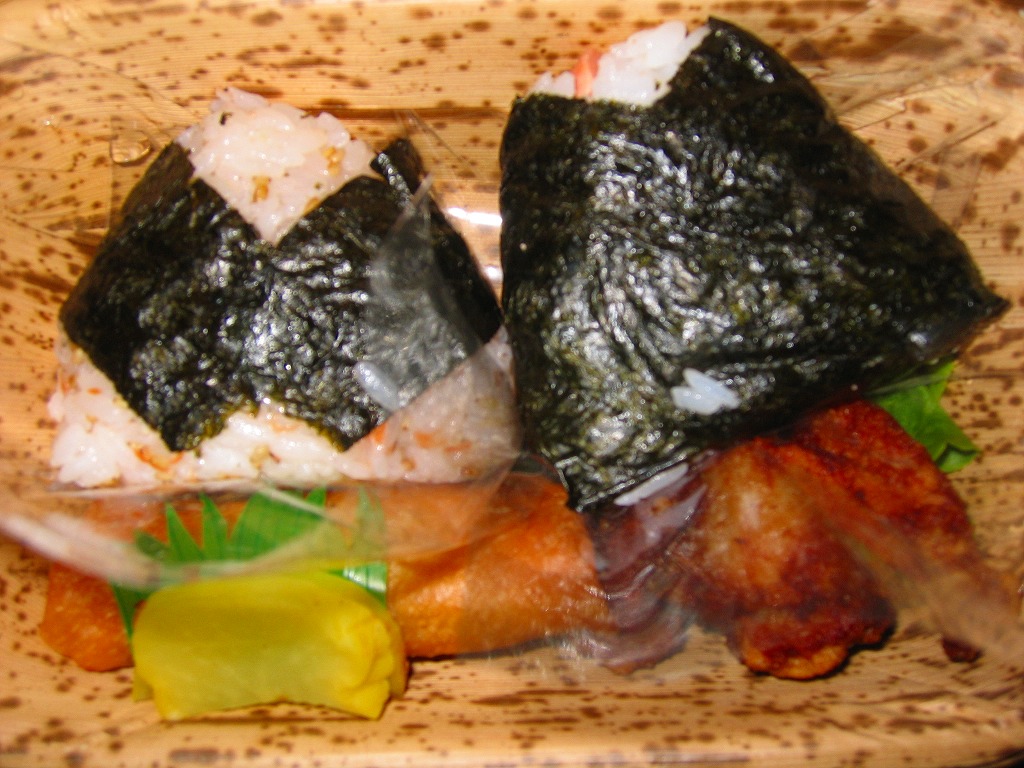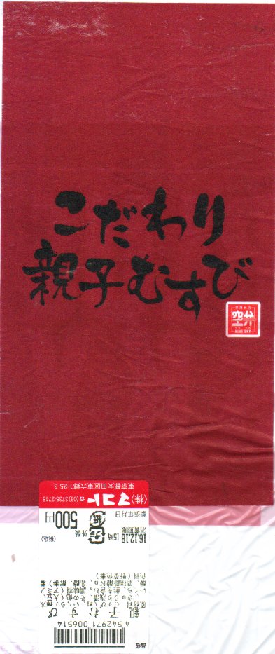羽田空港第2旅客ターミナル供用開始に伴い2004年12月1日に空弁としてデビューしたと思われる。竹皮を固めた容器の中に、小さなおむすびが2個と、やはり小柄な鶏唐揚と春巻とタクアンが入る。この分量と内容で714円とはずいぶんと高価だが、公式サイトによるとお米と具と海苔と水にこだわったグルメおにぎりだそうで、確かに味は良い。 【東京国際空港】1931(昭和6)年8月25日開港 東京都大田区羽田空港 http://www.tokyo-airport-bldg.co.jp/ 【ティーズインターナショナル株式会社】東京都大田区羽田空港3−4−2 羽田第2旅客ターミナルビル3階 03(5757)0050 http://www.tees-intl.com/oniginmein.htm こだわり親子むすび(500円) 2004年12月18日に羽田空港第1旅客ターミナル搭乗待合室内仮設売店で購入