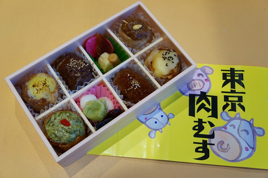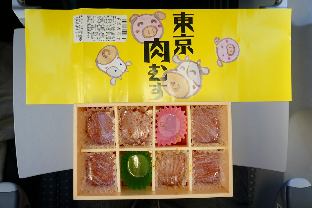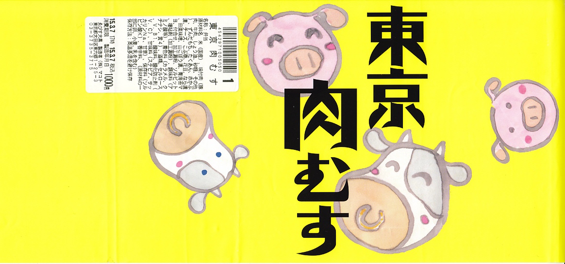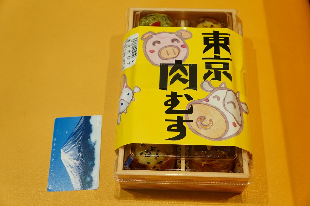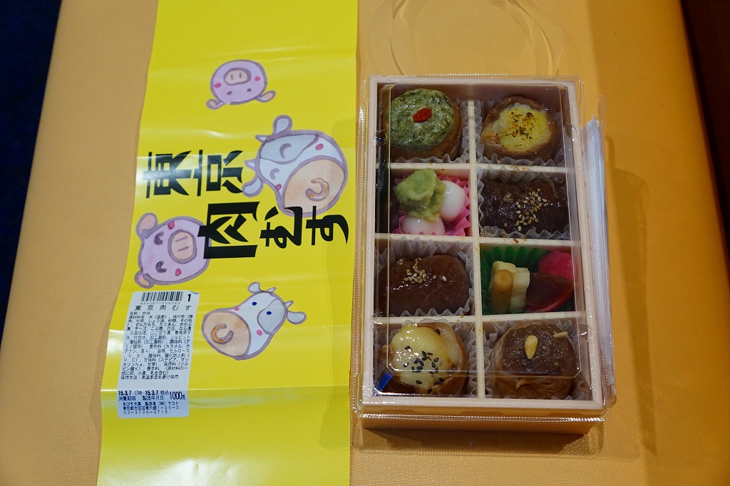 高菜飯を海苔で巻いてエビ天をはめたミニおにぎり「天むす」を5個、きゃらぶきを添えて、竹皮に包み、専用の紙袋に収める。天むすは名古屋の名物であり、しかしこの商品は全国各地の商業施設で買え、この羽田空港でも白米の通常版「天むす」、黒米混じりの御飯を使う「黒米天むす」とこれが販売されていた。お手軽でお手頃な軽食。 【東京国際空港】1931(昭和6)年8月25日開港 東京都大田区羽田空港 http://www.tokyo-airport-bldg.co.jp/ 【株式会社地雷也】東京都江東区白河2丁目8番1号 03(5639)1064 http://www.jiraiya.net/ 東京肉むす(1,000円) 2015年3月7日に羽田空港第1旅客ターミナル搭乗待合室売店で購入