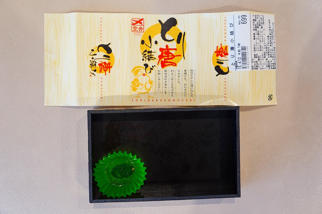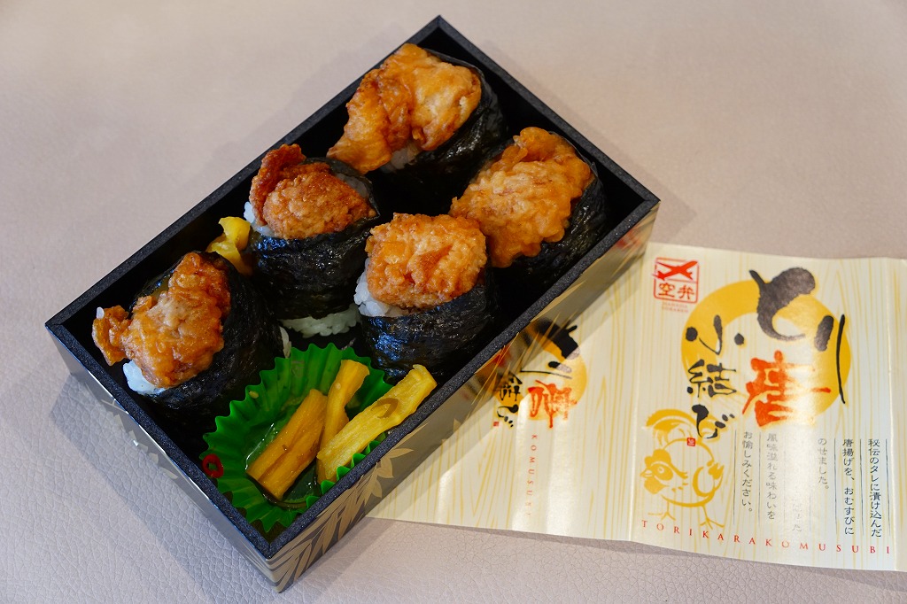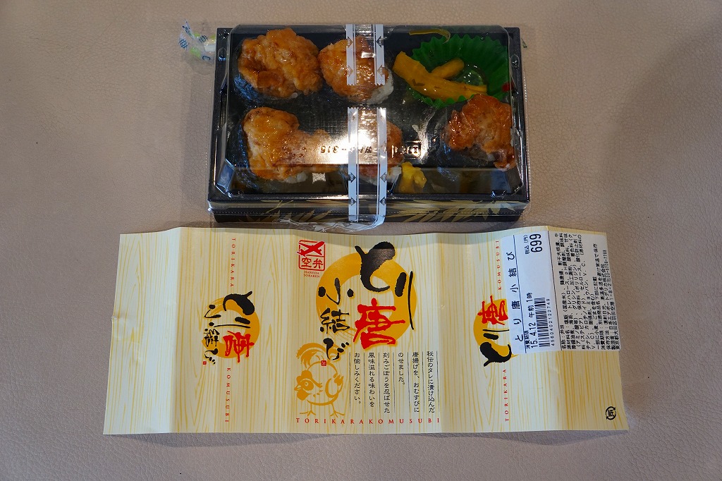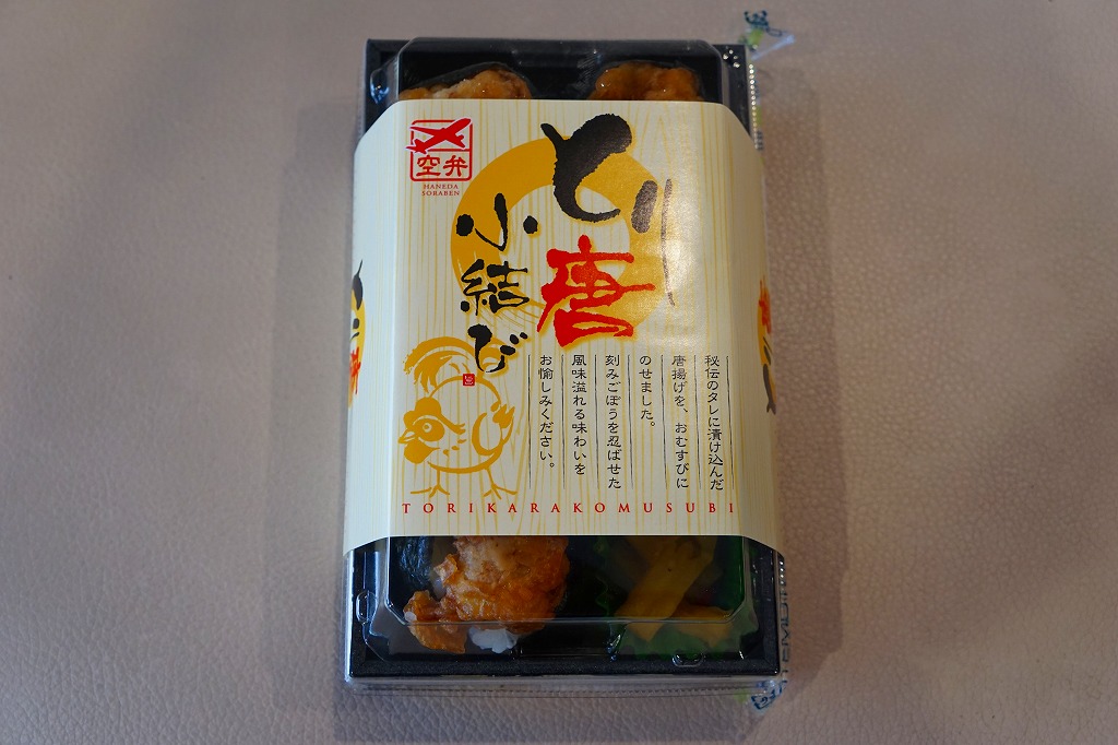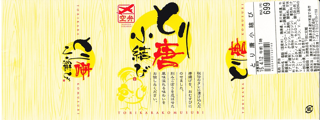 ヨネスケ空弁の第3弾、天むす空弁では第2弾で、2014年4月18日の発売。「カレー味」ということで、掛紙がカレー色になり、ヨネスケ氏のイラストがインド風になり、中身のウインナー、えび、ぶた、とり、れんこんの天むすがすべてカレー味になっている。色と香りが鮮やかで味は控えめのカレー風味が、心地良く感じられた。 【東京国際空港】1931(昭和6)年8月25日開港 東京都大田区羽田空港 http://www.tokyo-airport-bldg.co.jp/ 【日本エアポートデリカ株式会社】東京都大田区羽田空港1−8−2 03(5708)7788 http://www.airdeli.co.jp/ とり唐小結び(699円) 2015年4月11日に羽田空港第1旅客ターミナルビル空弁売店で購入