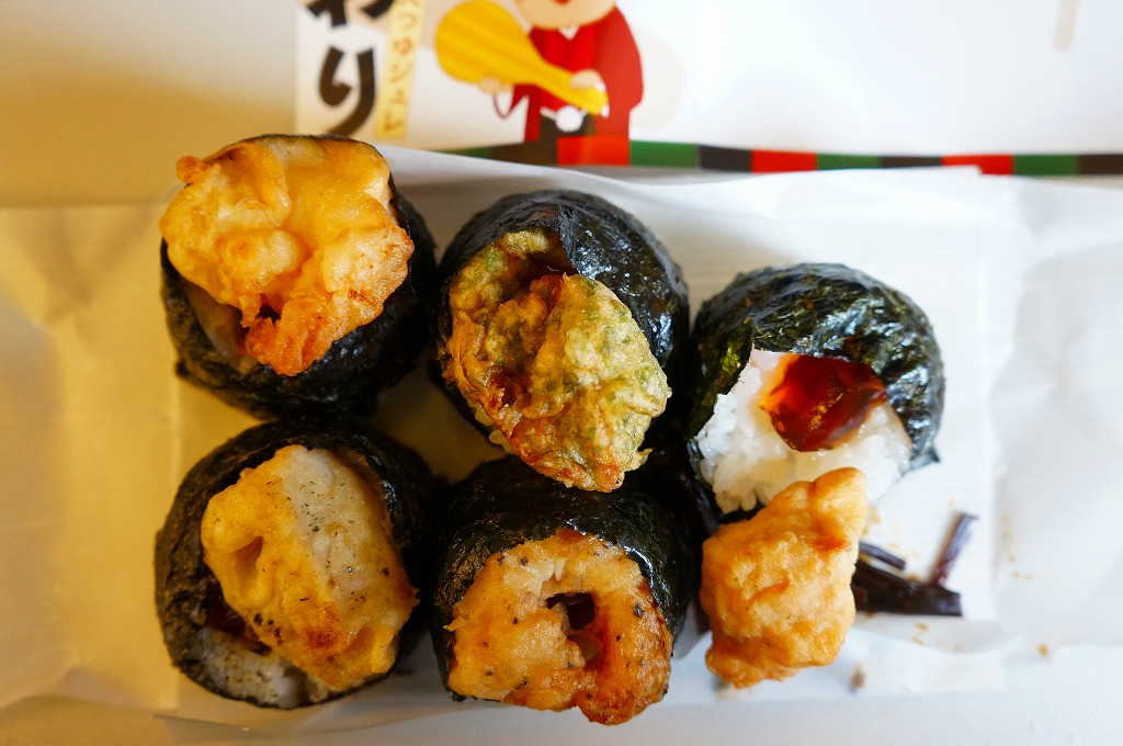 2013年までに発売か。容器の8区画の中に、チーズや味噌や青海苔マヨで3種4個とタレ2個で6個の、球形をした肉巻きおむすびと、漬物と甘味。見るからに肉々しく、肉も味も油も間違いなく重たいものだが、いろんな味を持つので、意外に食べ飽きない。しかしこれと肉2倍のカツサンドを、朝から食べてしまったので、さすがに胃がもたれた。 【東京国際空港】1931(昭和6)年8月25日開港 東京都大田区羽田空港 http://www.tokyo-airport-bldg.co.jp/ 【ゑびす大黒 株式会社マコト】東京都大田区東六郷1−25−3 03(3735)3715 http://www.makoto-j.co.jp/ ヨネスケのこだわり天むす(650円) 2012年10月28日に羽田空港第1旅客ターミナルビル搭乗待合室BLUESKYで購入