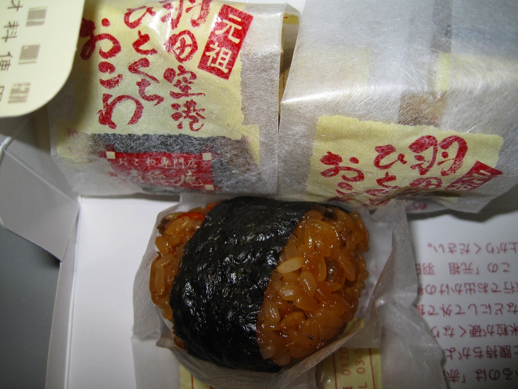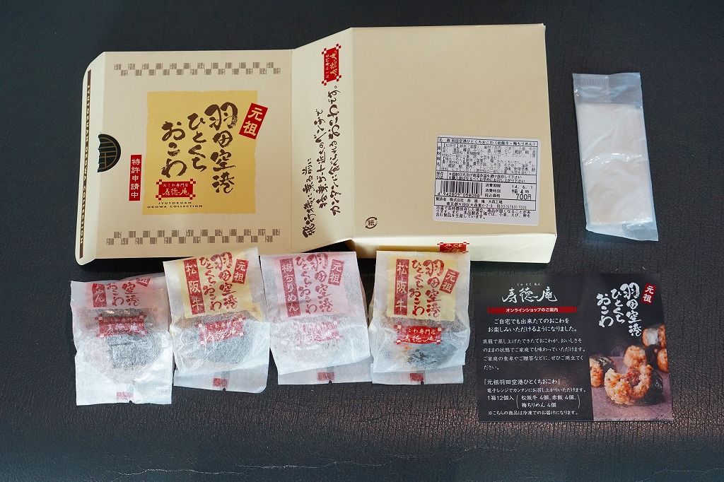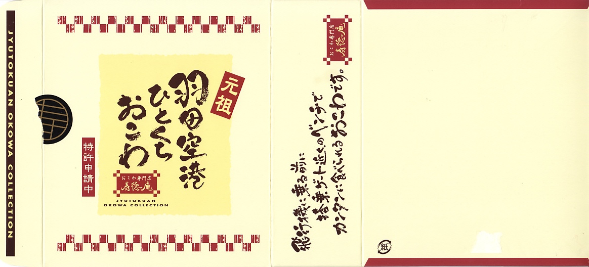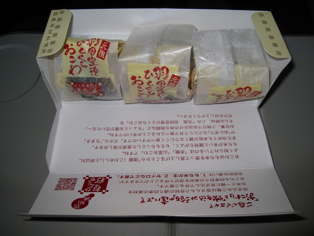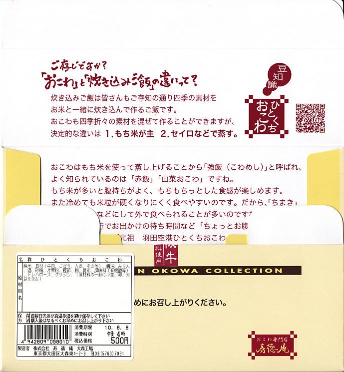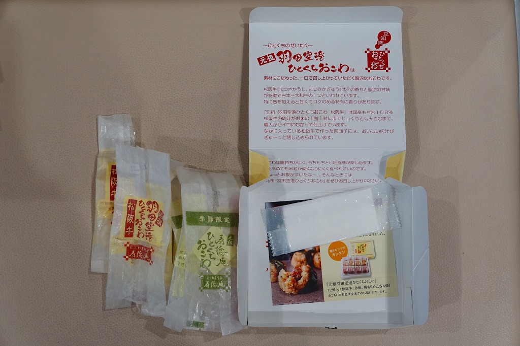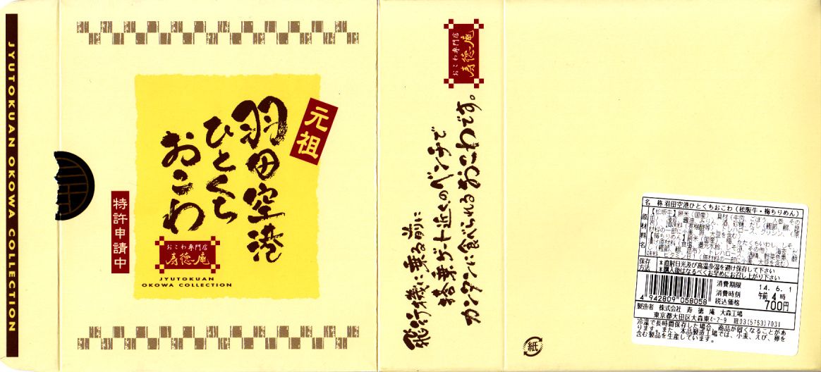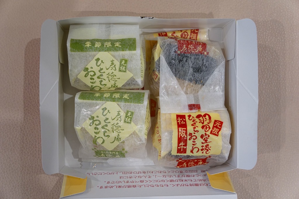 羽田空港でおなじみの、寿徳庵のひとくちおこわ。長方形だったはずの容器が正方形だったので買ってみたら、中身が3個から4個になり、松阪牛のものは2個に減らし、「梅ちりめん」が2個入っていた。 【東京国際空港】1931(昭和6)年8月25日開港 東京都大田区羽田空港 http://www.tokyo-airport-bldg.co.jp/ 【株式会社 寿徳庵 大森工場】東京都大田区大森東4−2−9 03(5763)7031 http://www.jutokuan.com/ 羽田空港ひとくちおこわ(500円) 2010年8月8日に羽田空港第1ターミナル搭乗待合室売店で購入