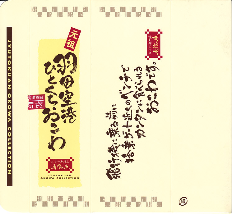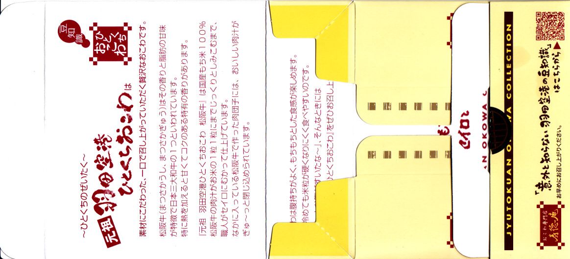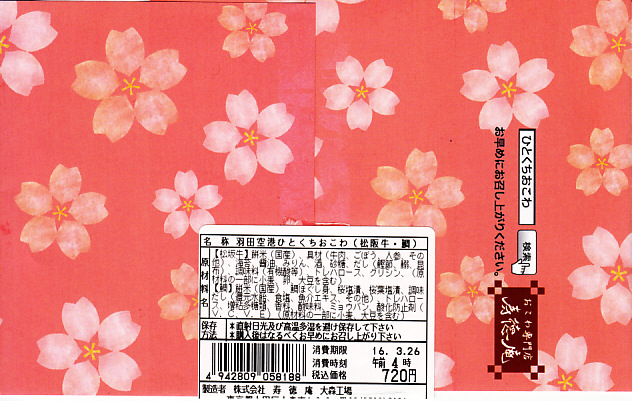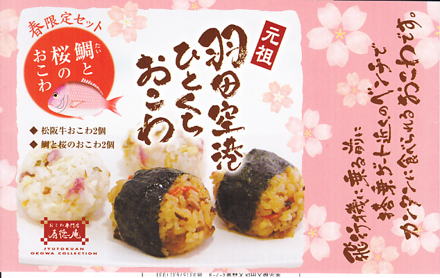 羽田空港でおなじみの、寿徳庵のひとくちおこわの、2016年春に見つけた春限定のパッケージ。いつもの絵柄の紙箱に、中身の写真と春色の絵柄を印刷した掛紙を巻く。中身は通常の松阪牛の球が2個と、「季節限定」と書かれたタイとサクラの球が2個。桜花のほのかな色と臭みがあり、タイはどこにあったのやら。 【東京国際空港】1931(昭和6)年8月25日開港 東京都大田区羽田空港 http://www.tokyo-airport-bldg.co.jp/ 【株式会社 寿徳庵 大森工場】東京都大田区大森東4−2−9 03(5763)7031 http://www.jutokuan.com/ 元祖羽田空港ひとくちおこわ(700円) 2014年5月31日に羽田空港第2ターミナルの売店で購入