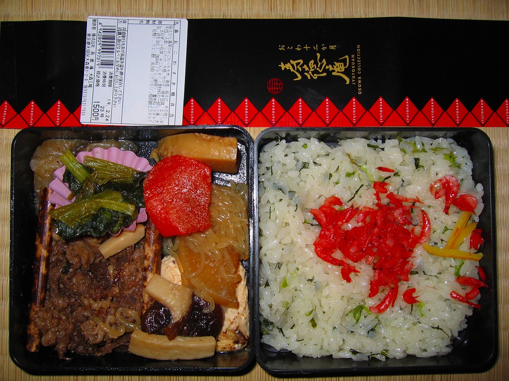 2006年頃の登場か。形状と色調が重箱風な、小柄な正方形のプラ容器を二段重ねで使用、これに紙帯を巻いてセロテープで留め、調製シールを貼り割箸を付ける。中身は下段が桜海老をまぶした高菜おこわ、上段が松阪牛すき焼、シイタケやダイコンやニンジンなどの煮物と、糸こんにゃくや焼き豆腐に小松菜など。 つまり下段が「おこわ」で上段が「すき焼」となる。下の空弁と業者が同じとは思えない完成度が心地よい、小柄で高価な高級空弁で、スーパーシートの昼食にふさわしい。2007年の日本経済新聞で「専門家おすすめの空弁ランキング」第1位を獲得している 【東京国際空港】1931(昭和6)年8月25日開港 東京都大田区羽田空港 http://www.tokyo-airport-bldg.co.jp/ 【株式会社 寿徳庵 大森工場】東京都大田区大森東4−2−9 03(5763)7031 http://www.jutokuan.com/ 松阪牛牛そぼろおこわ(1,000円) 2006年3月10日に東京駅コンコース売店で購入