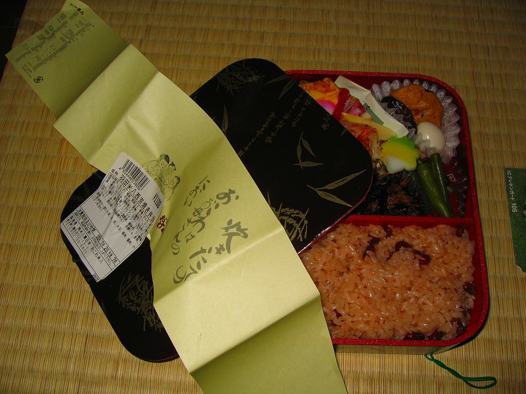 武蔵野と呼ばれる東京都西部が地盤なデパ地下のおこわ屋さんが、羽田空港で売る高級幕の内タイプの空弁。角の丸め具合が独特の長方形発泡材容器を輪ゴムで押さえ、特にこの空弁のために用意されたわけではなさそうな掛紙を巻いて調製シールを貼る。中身はつまり赤飯と西京焼がメインなお弁当だが、おかずの分量と種類と風味の充実ぶりは凄く、これを空弁のコンセプトに違わずコンパクトにまとめる。紹介例は絶無だが水準は高い。 【東京国際空港】1931(昭和6)年8月25日開港 東京都大田区羽田空港 http://www.tokyo-airport-bldg.co.jp/ 【株式会社米八東日本 おこわ米八】東京都三鷹市井口2−13−1 0422(33)5611 米八弁当(800円) 2005年1月10日に羽田空港第2旅客ターミナルビル空弁工房で購入