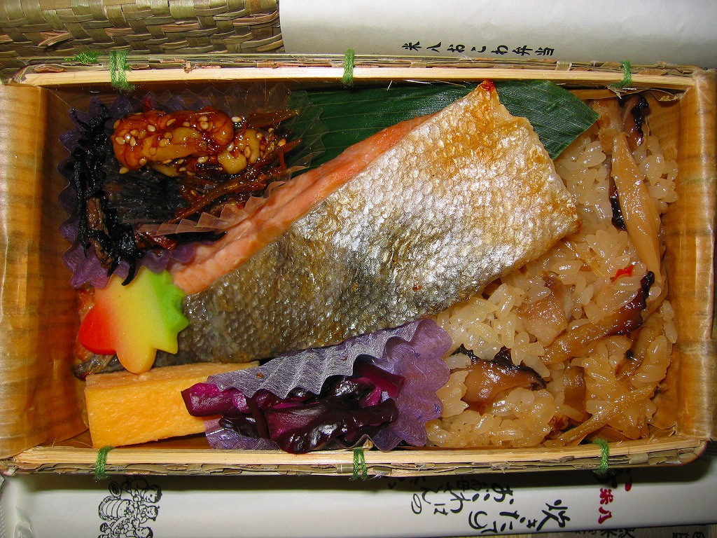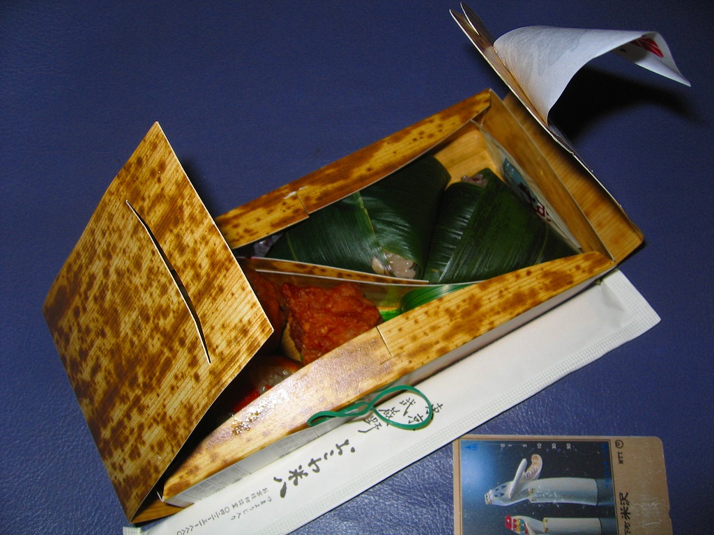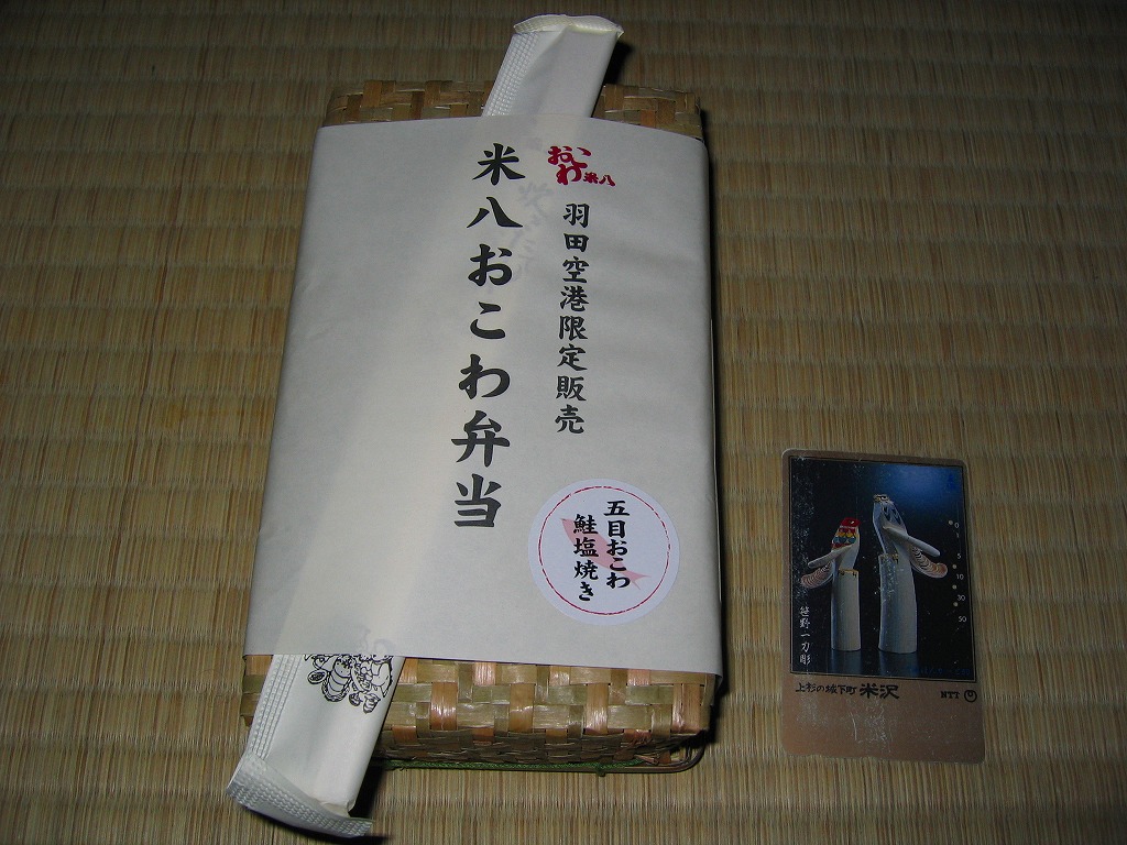 羽田空港第2旅客ターミナル供用開始に伴い、2004年12月1日に空弁デビューした、デパ地下のおこわ屋さんのお弁当。イグサ編みの柔らかい容器をシンプルな掛紙で包む。中身は掛紙にシールで貼られたとおり、五目おこわが敷かれて鮭塩焼きが載り、これに玉子焼やくるみ小女子や蒲鉾などを添える。駅弁そっくりの商品だが、その風味にどことなく違いを感じた。ただ、この商品名は固有ではなく、中身が何であれこの名前らしい。 【東京国際空港】1931(昭和6)年8月25日開港 東京都大田区羽田空港 http://www.tokyo-airport-bldg.co.jp/ 【株式会社米八東日本】東京都三鷹市井口2−13−1 0422(33)5611 Copyright (C) 2006-2022 まっこうくじら |