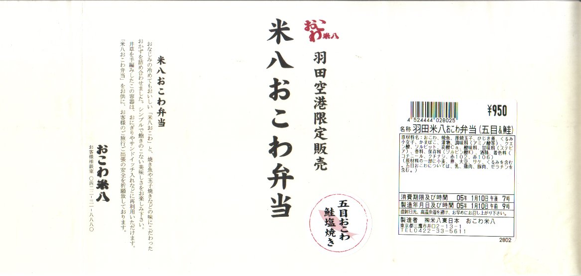 羽田空港第2旅客ターミナル供用開始に伴い、2004年12月1日に空弁デビューした、デパ地下のおこわ屋さんのお弁当。竹皮を模した組立式紙箱に、封として商品名のシールを貼る。中身はおこわいなりと赤飯ちまきが各2個と、小さな鶏唐揚と玉子焼が各1個。サイズと見た目では高価に思えるが、食べて風味と分量を感じれば価格相応と思える。ただ、この商品名は固有ではなく、中身が何であれこの名前らしい。 【東京国際空港】1931(昭和6)年8月25日開港 東京都大田区羽田空港 http://www.tokyo-airport-bldg.co.jp/ 【株式会社米八東日本】東京都三鷹市井口2−13−1 0422(33)5611 米八おこわ弁当 五目おこわ鮭塩焼き(950円) 2005年1月10日に羽田空港第2旅客ターミナルビル空弁工房で購入