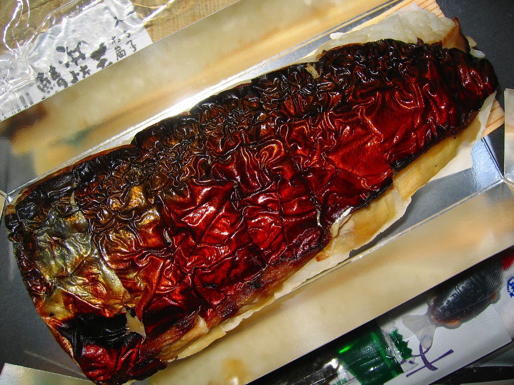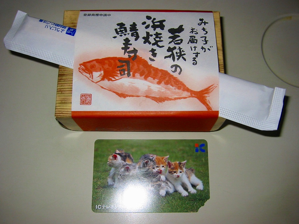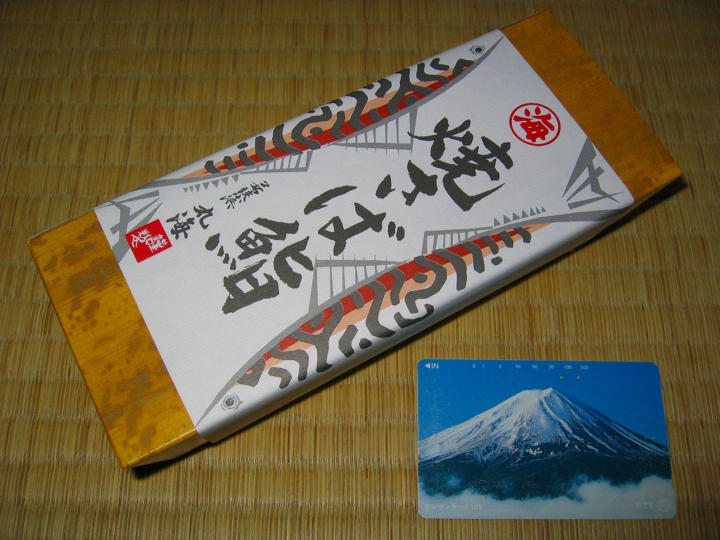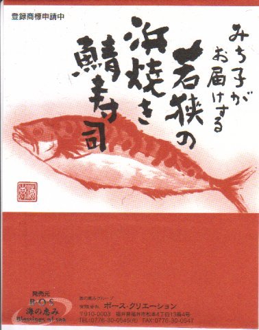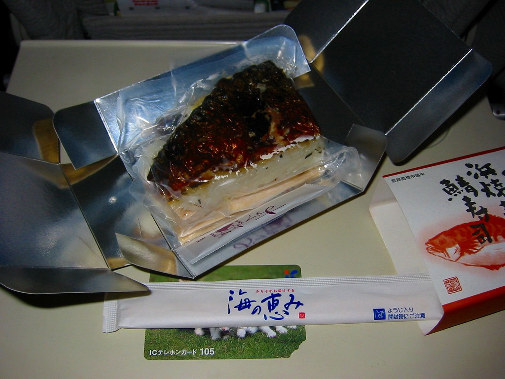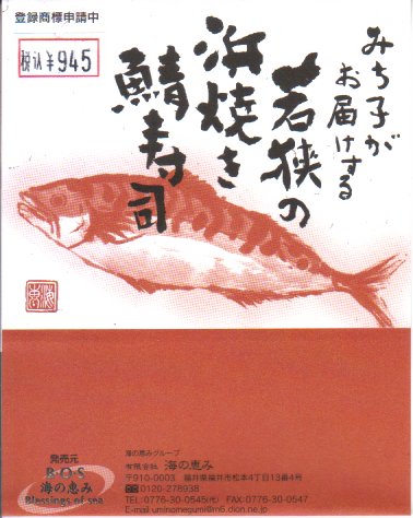 あの著名空弁の、大きい方のパッケージ。掛紙は同じで容器が横に長くなり、密封パックの焼鯖棒寿司が倍の長さになる。2003年3月に購入した小さい方のパッケージと比較して、能書きのしおりが入り、所在地や電話番号を変えないまま発売元の社名が変わっている。会社の運命も大きく変わったことだろう。 【東京国際空港】1931(昭和6)年8月25日開港 東京都大田区羽田空港 http://www.tokyo-airport-bldg.co.jp/ 【有限会社 海の恵み】福井県福井市松本4丁目13番4号 0776(30)0545 若狭の浜焼き鯖寿司(600円) 2003年3月20日に羽田空港搭乗待合室内売店で購入