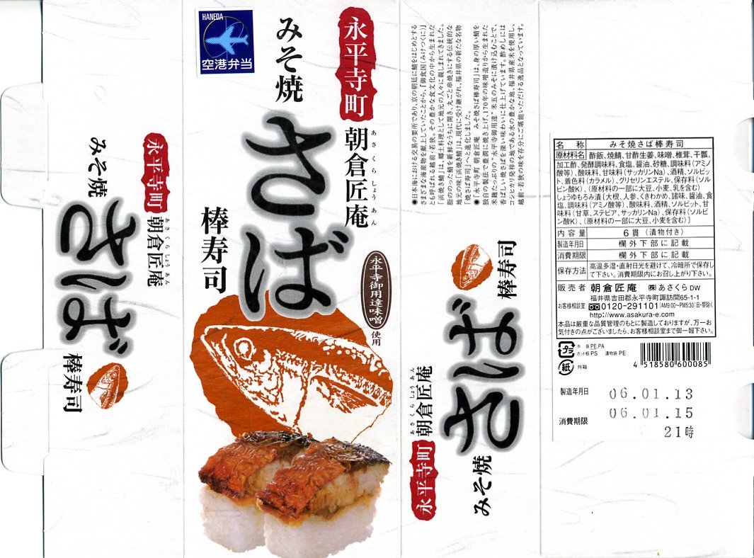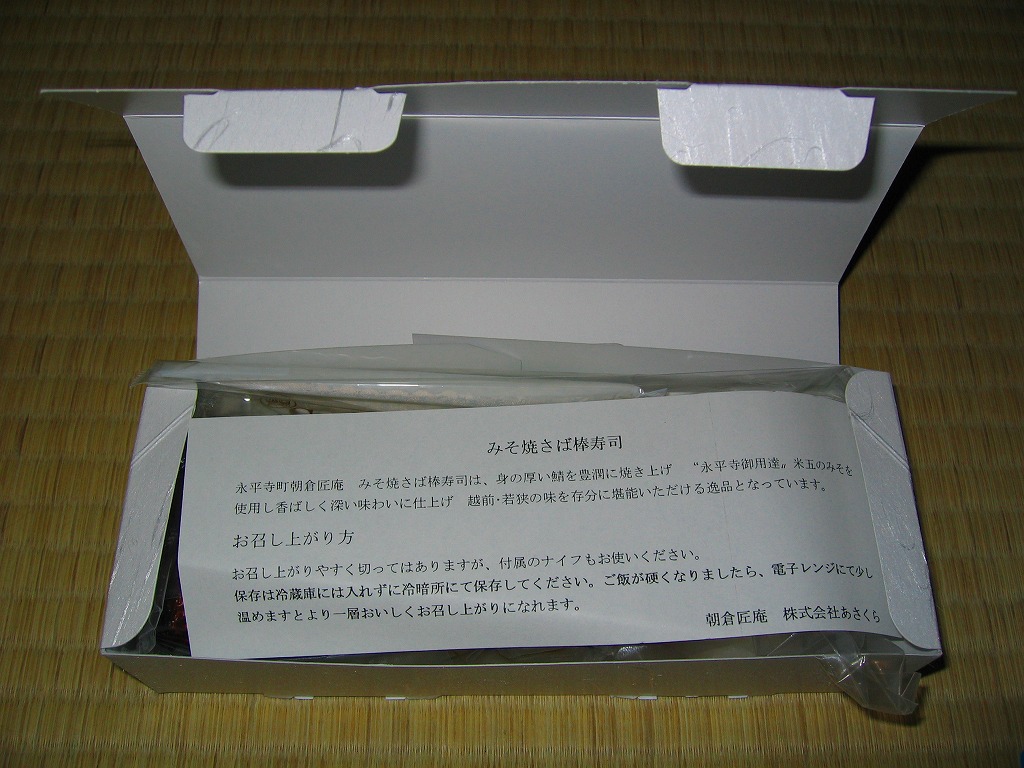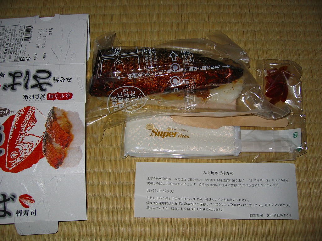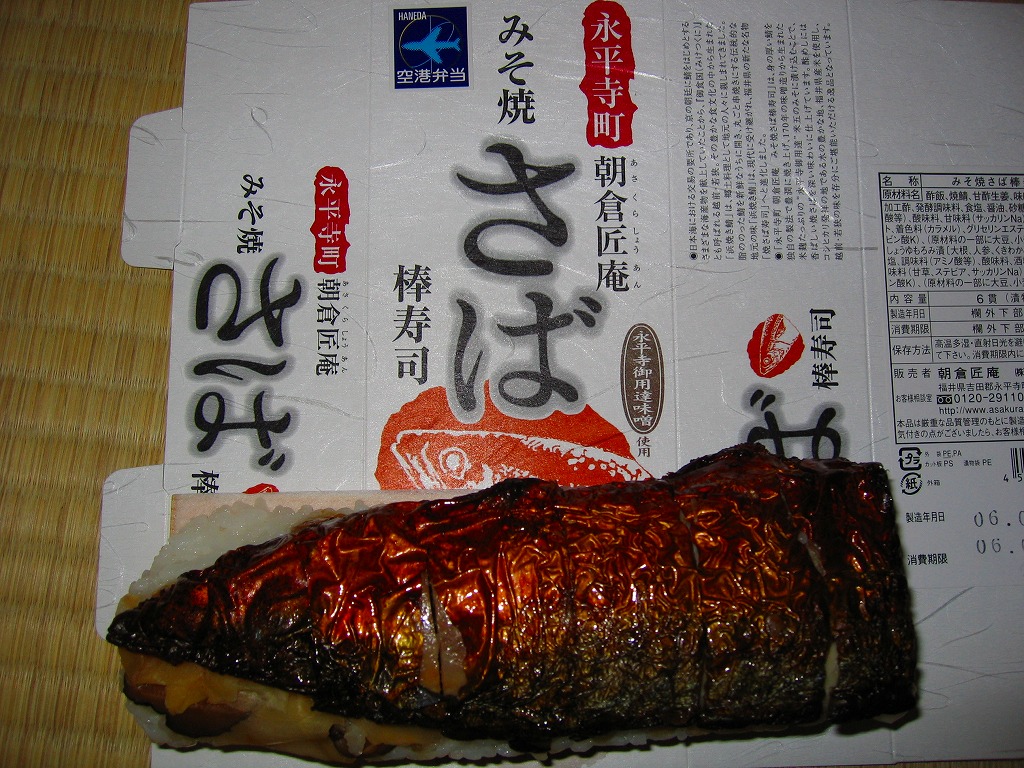 今や空弁の代名詞にもなった焼サバ寿司は、いったいどれだけ種類があるのだろうか。発泡材の板に酢飯と大葉と焼鯖を置き、ラップでキツキツに巻き、竹皮を模した紙箱に詰めて掛紙を巻いて、1,050円。紙箱にまで脂が染み出しているので、出先での消費は困難。このあたりを改善した空弁には、まだ出会えていない。 【東京国際空港】1931(昭和6)年8月25日開港 東京都大田区羽田空港 http://www.tokyo-airport-bldg.co.jp/ 【小浜海産物株式会社PFD】福井県小浜市川崎2−1−1 0770(52)3700 http://www.wakasa-marukai.co.jp/ 永平寺町朝倉匠庵みそ焼さば棒寿司(1,100円) 2006年1月14日に京王百貨店駅弁大会で購入