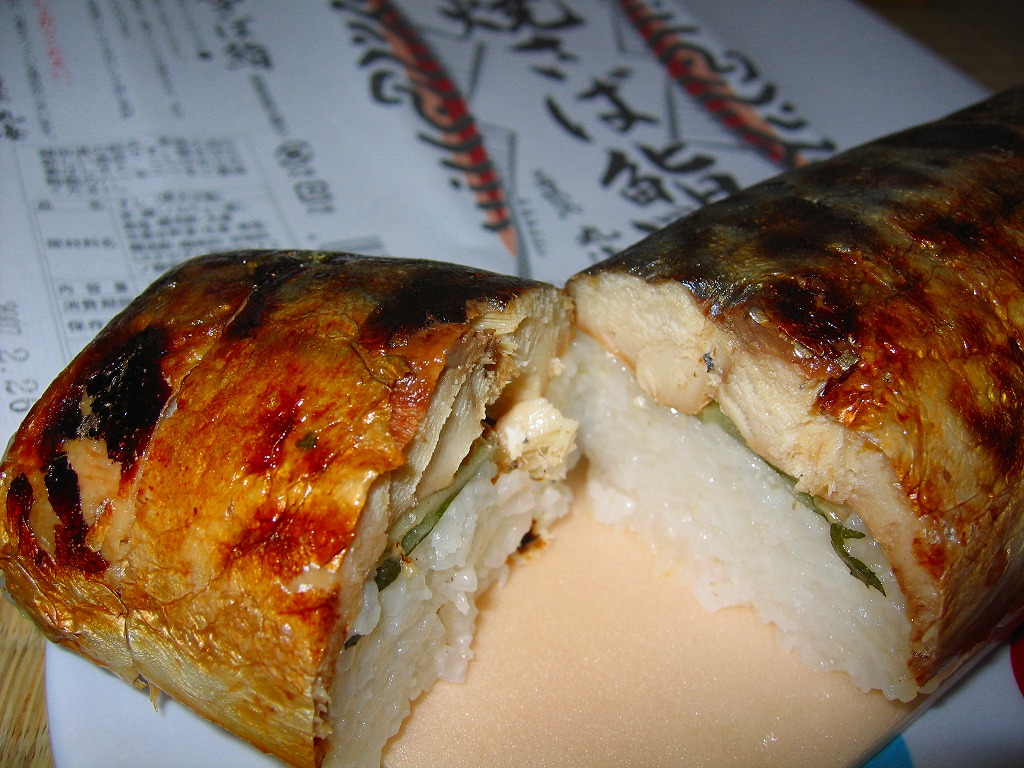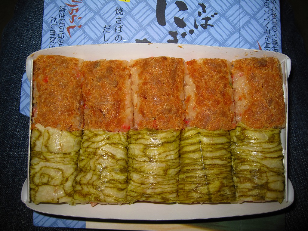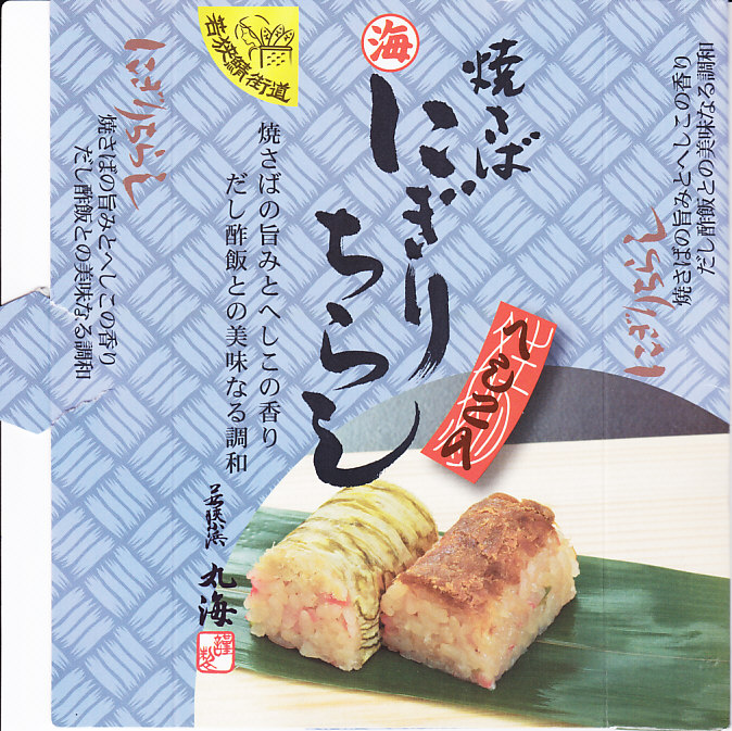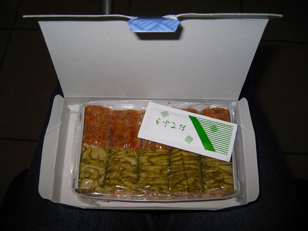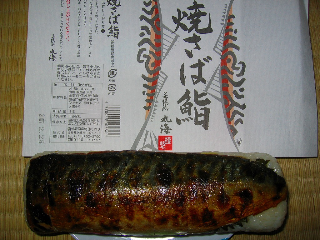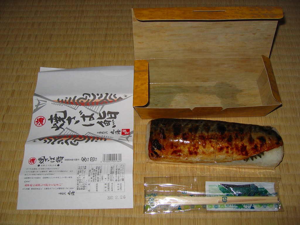 2009〜2010年頃の登場か。正統派の幕の内弁当に入る俵飯の大きさをしただし酢飯が、サバフレークを載せて5個、昆布を巻いて5個、白い紙製トレーごと密封されて、中身のイメージ写真を掲載した紙箱に収まる。味はまるで飯の塩辛。 【東京国際空港】1931(昭和6)年8月25日開港 東京都大田区羽田空港 http://www.tokyo-airport-bldg.co.jp/ 【小浜海産物株式会社PFD】福井県小浜市川崎2−1−1 0770(52)3700 http://www.wakasa-marukai.co.jp/ 焼さば鮨(1,050円) 2007年2月24日に羽田空港第2旅客ターミナルANA売店で購入