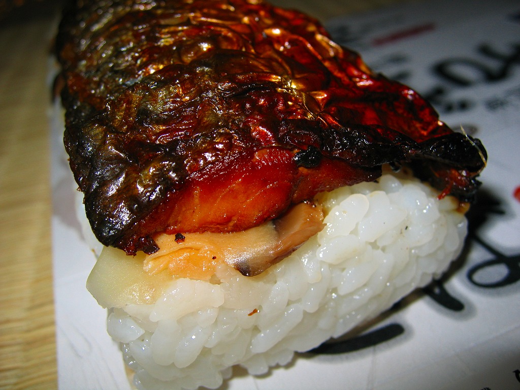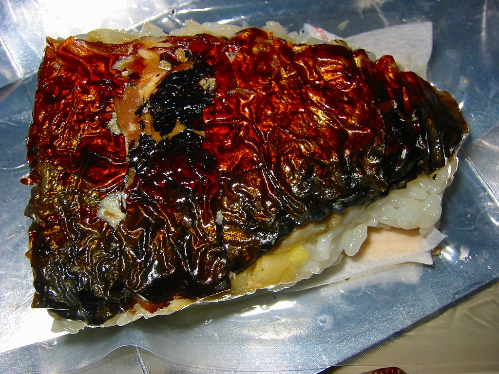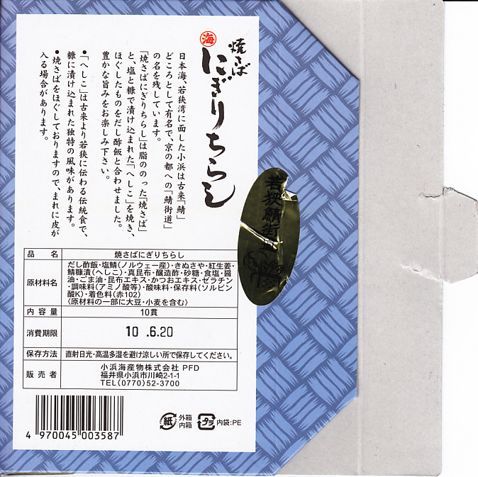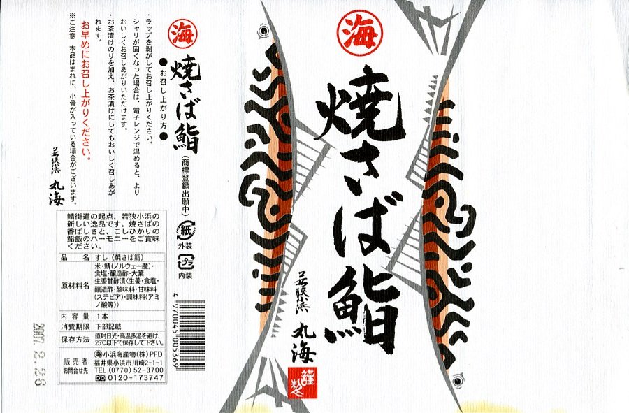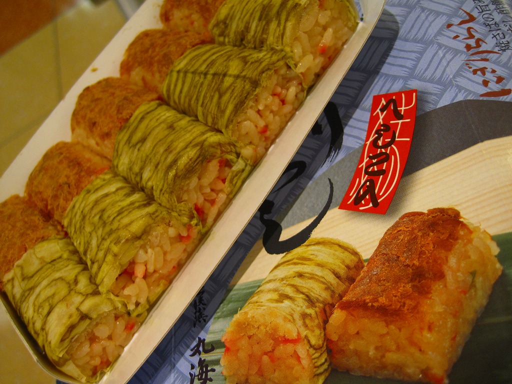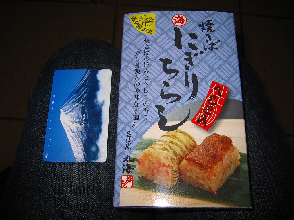 2009〜2010年頃の登場か。正統派の幕の内弁当に入る俵飯の大きさをしただし酢飯が、サバフレークを載せて5個、昆布を巻いて5個、白い紙製トレーごと密封されて、中身のイメージ写真を掲載した紙箱に収まる。味はまるで飯の塩辛。 【東京国際空港】1931(昭和6)年8月25日開港 東京都大田区羽田空港 http://www.tokyo-airport-bldg.co.jp/ 【小浜海産物株式会社PFD】福井県小浜市川崎2−1−1 0770(52)3700 http://www.wakasa-marukai.co.jp/ 焼さば鮨(1,050円) 2007年2月24日に羽田空港第2旅客ターミナルANA売店で購入