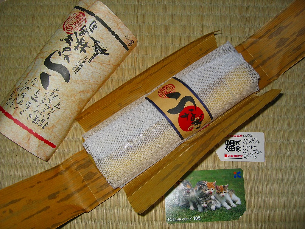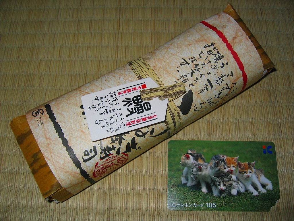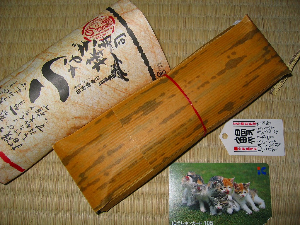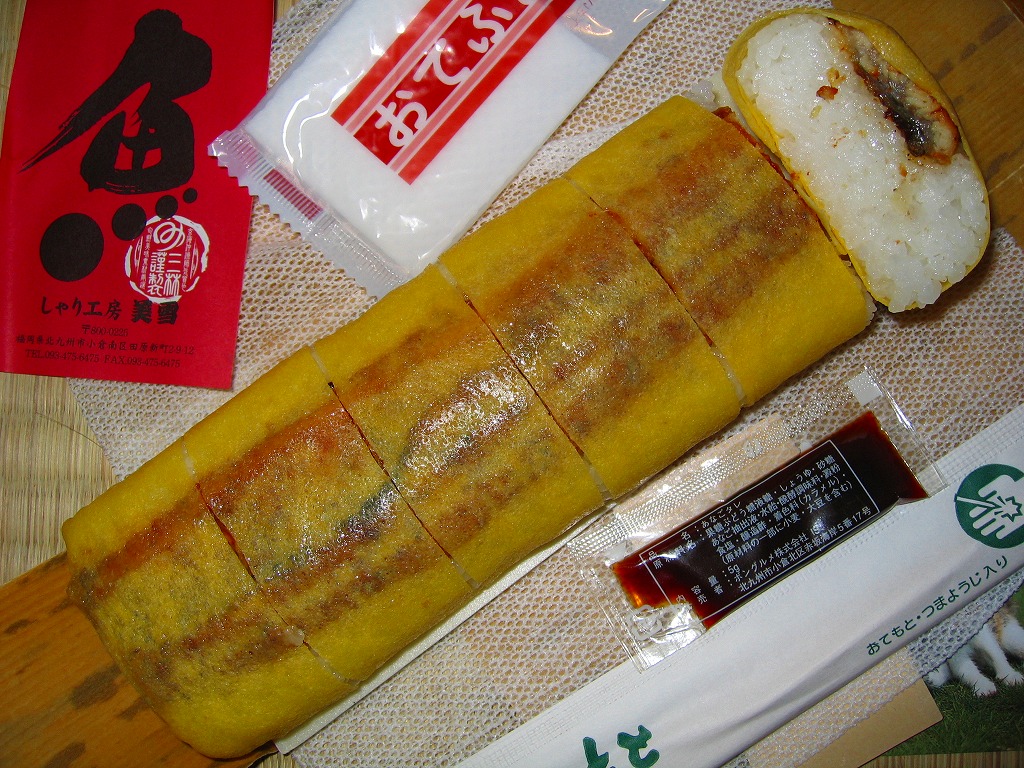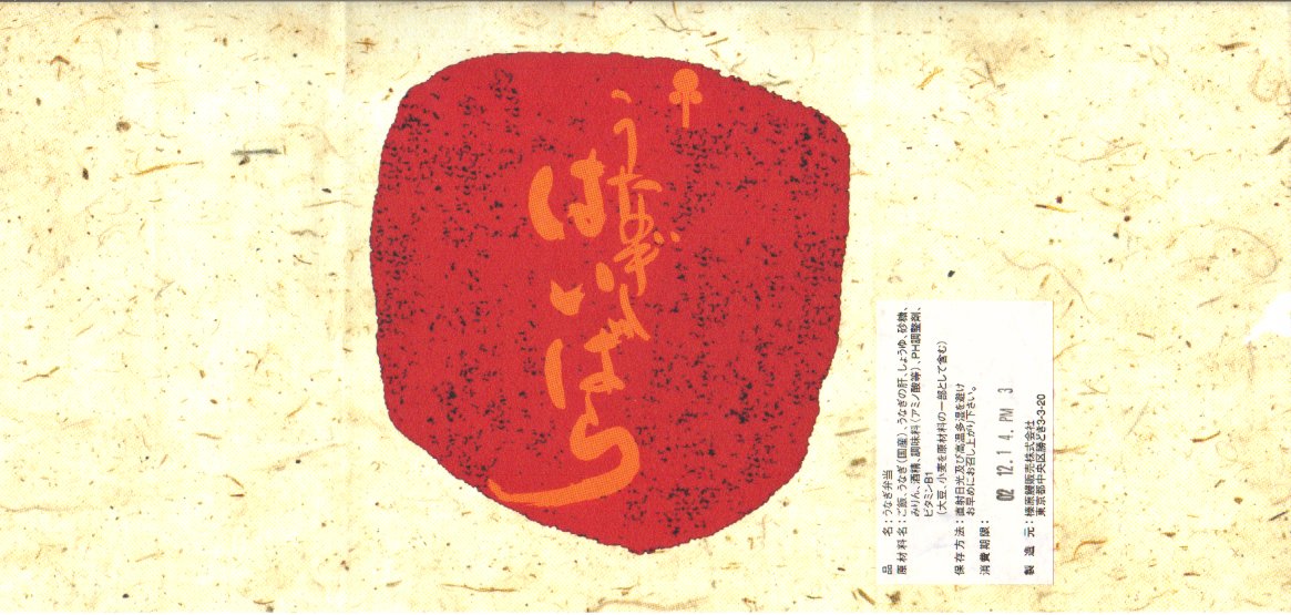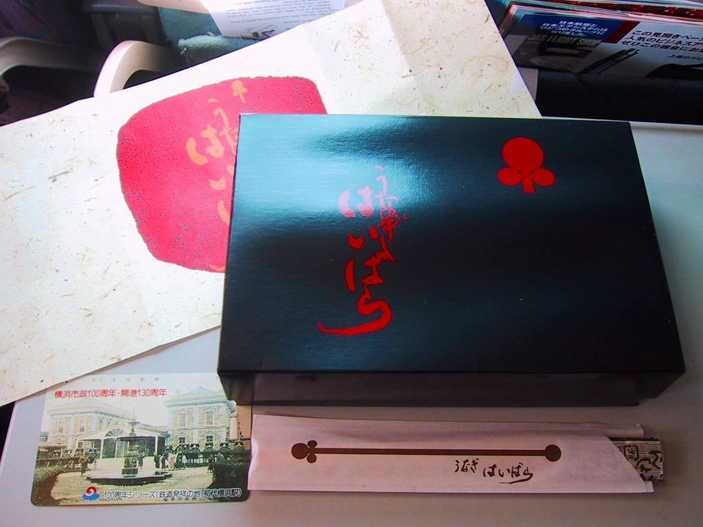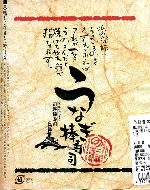 酢飯に鰻蒲焼を載せて薄焼き玉子で巻いて、発泡材を板にしてラップで巻いて、布目の白紙を巻いて棒寿司名のシールを貼り、竹皮風の紙で包んで輪ゴムで留めて、掛紙を巻いて針金で留めて荷札を付ける、福岡空弁タイプの小柄な棒寿司。鰻はまさにゴム草履だったが、ロットの問題もあるだろう。 掛紙に「三林謹製」、しおりに「しゃり工房 美雪」、電話番号で検索すると北九州の「(株)山勝」、商品でネットを検索すればネット通販とネットオークションのみ出てくる正体不明な商品。弁当大会では羽田空弁として販売されていたが、果たして現地に実態があるのかどうか。 【東京国際空港】1931(昭和6)年8月25日開港 東京都大田区羽田空港 http://www.tokyo-airport-bldg.co.jp/ 【有限会社 ミユキ】福岡県北九州市小倉南区田原新町2-9-12 093(475)6475 うなぎ はいばら(?円) 2002年12月14日に羽田空港搭乗待合室内売店で購入