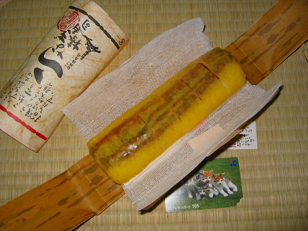 2009年3月23日に15種類が登場した「四季楽庭」ブランドの羽田空弁のひとつである模様。小柄で細身な木目柄の総発泡材容器をプラ帯で締めて、商品名を描いた茶色い掛紙で巻く。中身は白御飯の上に錦糸卵を敷いて、ウナギの蒲焼きとその刻みを載せてインゲン豆を2本加えるウナギ弁当。これがひつまぶしかと聞かれれば、そうではないと思うが、小柄でお手頃な機能的空弁。 【東京国際空港】1931(昭和6)年8月25日開港 東京都大田区羽田空港 http://www.tokyo-airport-bldg.co.jp/ 【サンブランチ株式会社見沼工場】埼玉県さいたま市見沼区卸町1丁目51番地 048(796)7952 うなぎ棒寿司(?円) 2005年3月6日に日本橋三越の弁当大会で購入