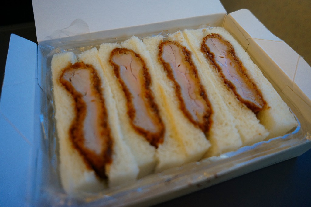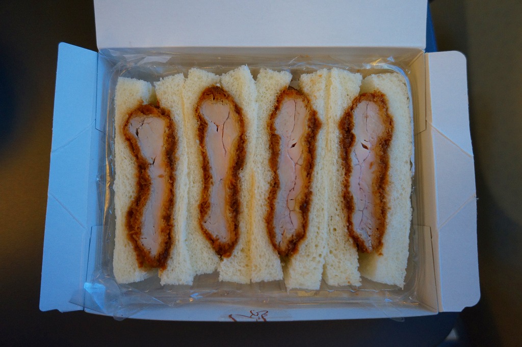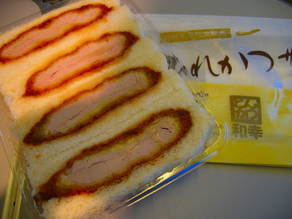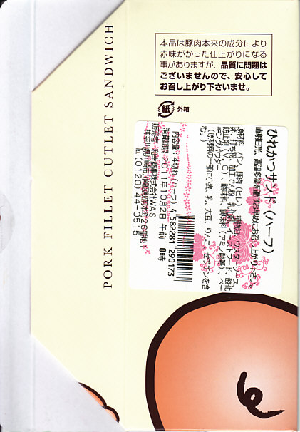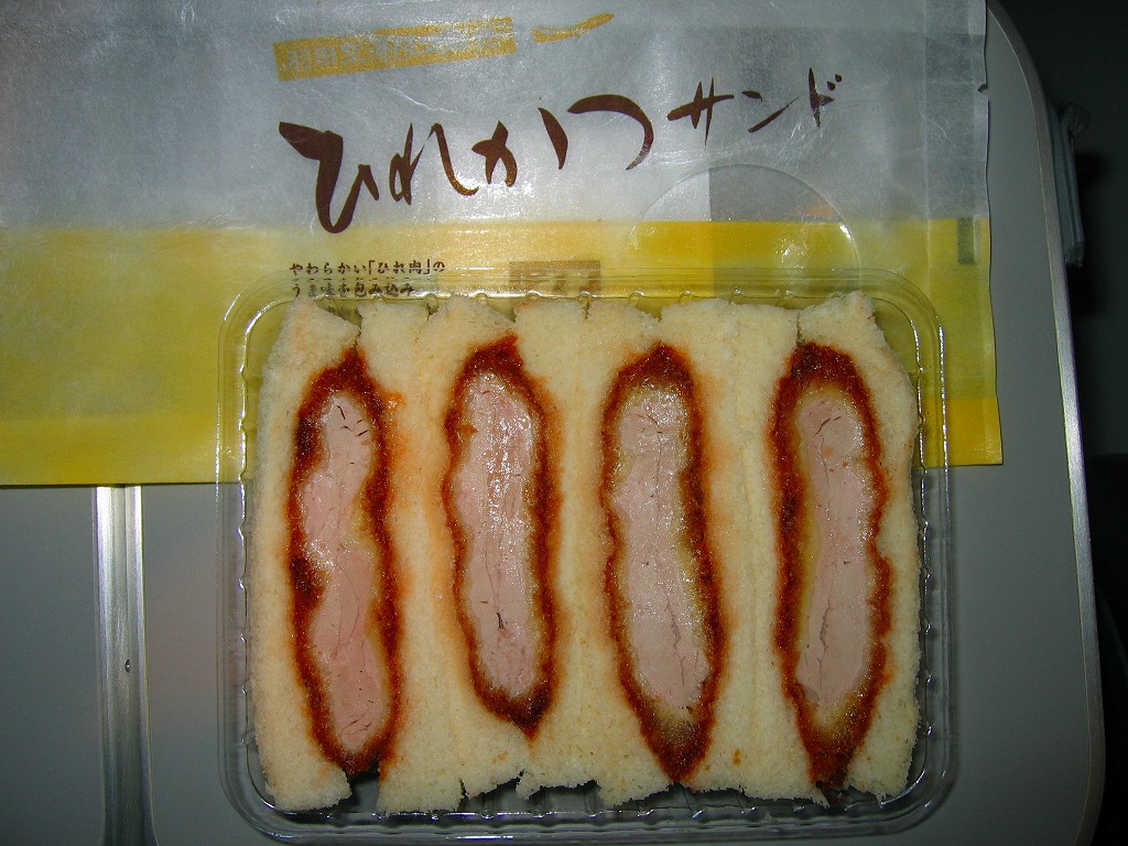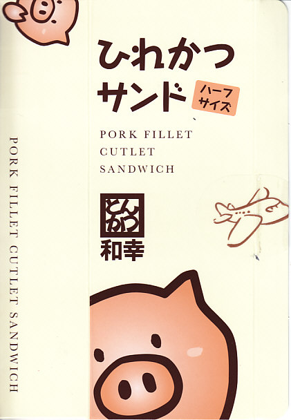和幸ブランドのひれかつサンドの2011年10月時点での姿。空弁を思わせるものはふたを留める飛行機マークのシールだけだが、この強度と粘着力が強力であり、ふたを開けるのに四苦八苦。2005年には3切れで500円であったものが、2008年には4切れで560円、そして今回は分量据え置きで630円と、順調に値上げされている。 【東京国際空港】1931(昭和6)年8月25日開港 東京都大田区羽田空港 http://www.tokyo-airport-bldg.co.jp/ 【和幸商事株式会社WAS】神奈川県川崎市川崎区駅前本町26番地1 0120-44-0515 http://www.wako-group.co.jp/ ひれかつサンド ハーフサイズ(330円) 2011年10月1日に羽田空港第2旅客ターミナル搭乗待合室売店で購入