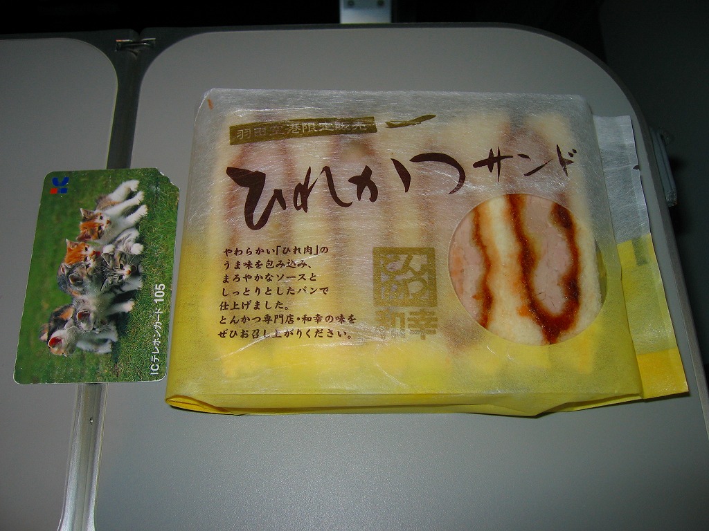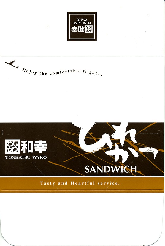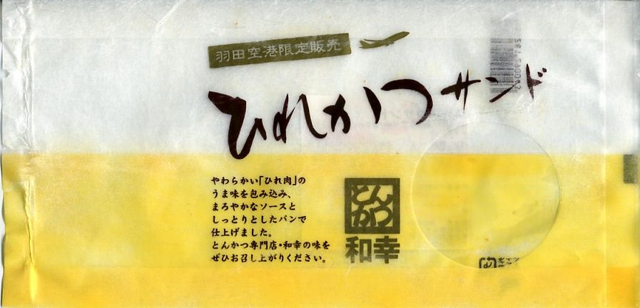 和幸ブランドのひれかつサンドの2011年10月時点での姿。2008年時点と比べて、紙箱入りになり、このハーフサイズという商品も空港で売られるようになった。中身や味は以前と同じで、透明なトレーに収まる点も変わらない。このパッケージが羽田空港限定なのかどうかは不明。 【東京国際空港】1931(昭和6)年8月25日開港 東京都大田区羽田空港 http://www.tokyo-airport-bldg.co.jp/ 【和幸商事株式会社WAS】神奈川県川崎市川崎区駅前本町26番地1 0120-44-0515 http://www.wako-group.co.jp/ ひれかつサンド(560円) 2008年12月7日に羽田空港第1旅客ターミナル搭乗待合室売店で購入
