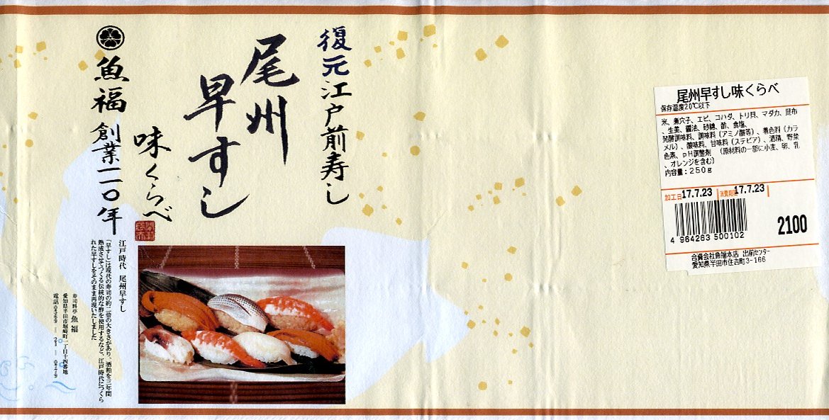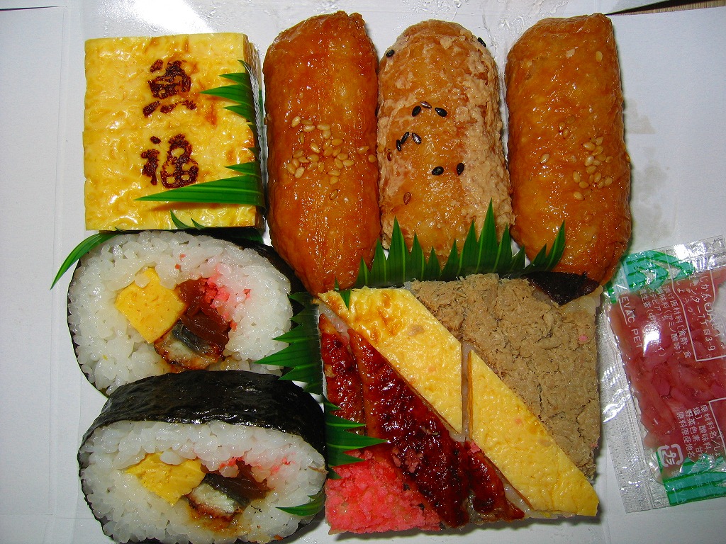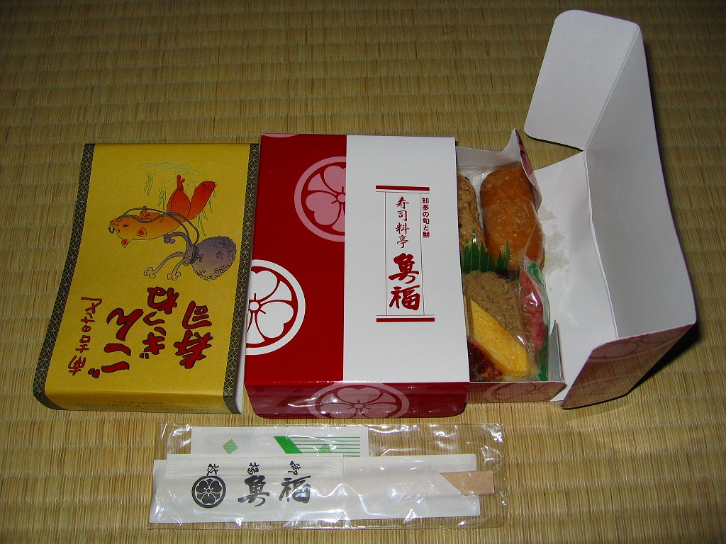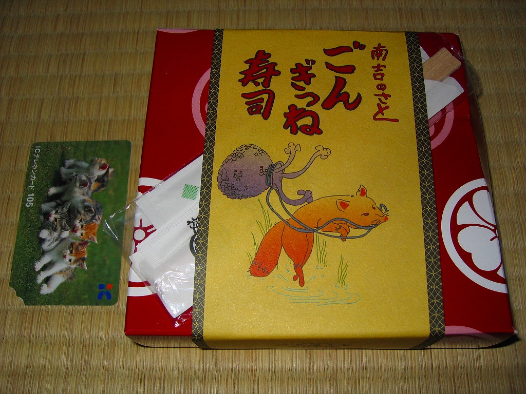 2011年6月22日に中部国際空港で、メディア上で暴れる花畑牧場と名古屋の駅弁屋でもある調製元との「コラボ商品」として登場。赤いプラ製トレーを接着した長方形の発泡材枠容器に透明なふたをして、商品名を書いた黒いボール紙の枠にはめる。中身は白御飯の上を豚焼肉と錦糸卵で覆い、山菜醤油漬と落花生煮と柴漬けを添えるもの。 ホエー豚ブランドの弁当はもはや、各地の空港や催事でおなじみ。バターのような脂が多くを占める豚焼肉が柔らかくもしつこい。一方で千葉の駅弁ではないのにピーナツ煮を詰めるのはユニーク。この催事場では近鉄名古屋駅の駅弁を名乗ったが、そんな販売実態はない模様。ここではいつものことだから諦めるしかない。 【中部国際空港】2005(平成17)年2月17日開港 愛知県常滑市セントレア1−1 http://www.centrair.jp/ 【株式会社だるま 名古屋支社】愛知県名古屋市中村区亀島2−1−1 052(452)2101 http://nagoyadaruma.jp/ 南吉のさと ごんぎつね寿司(680円) 2005年7月23日に中部国際空港搭乗ロビー売店で購入