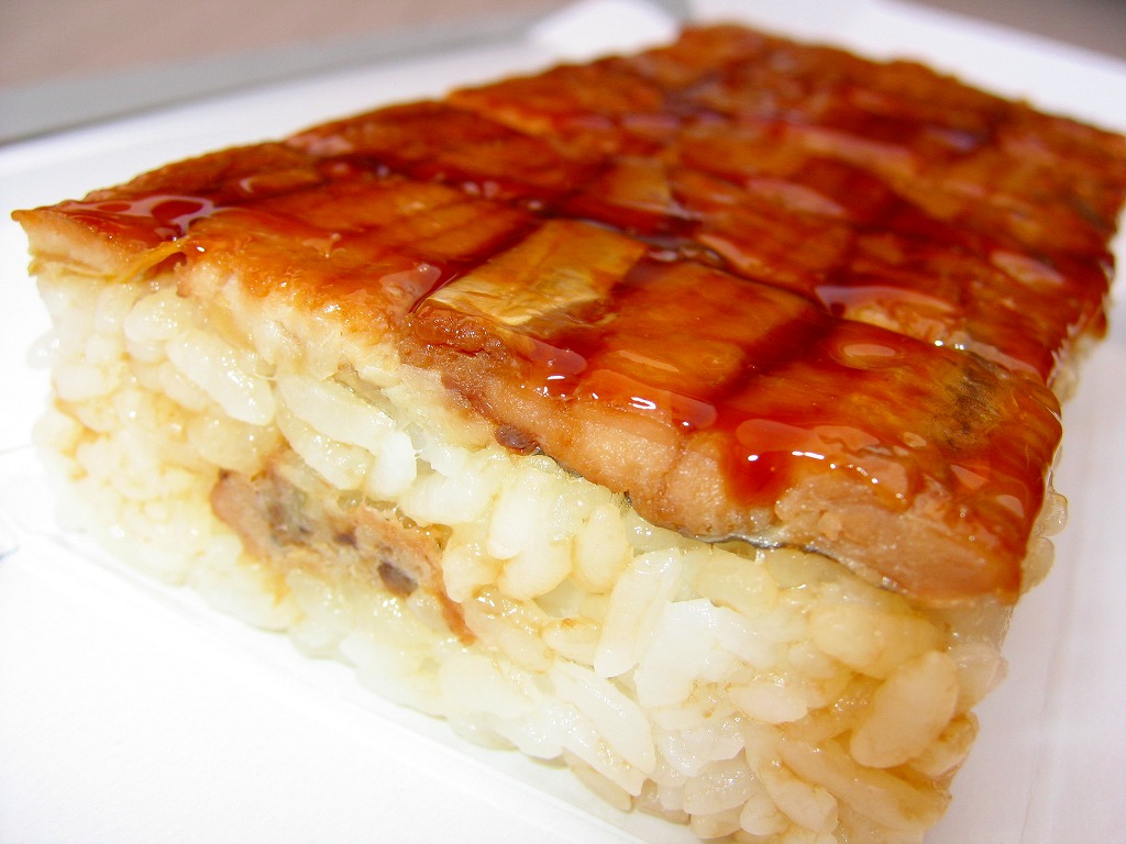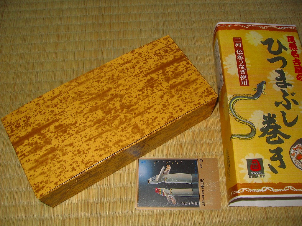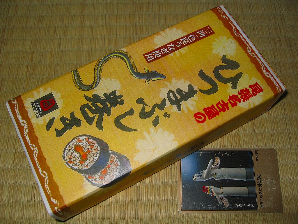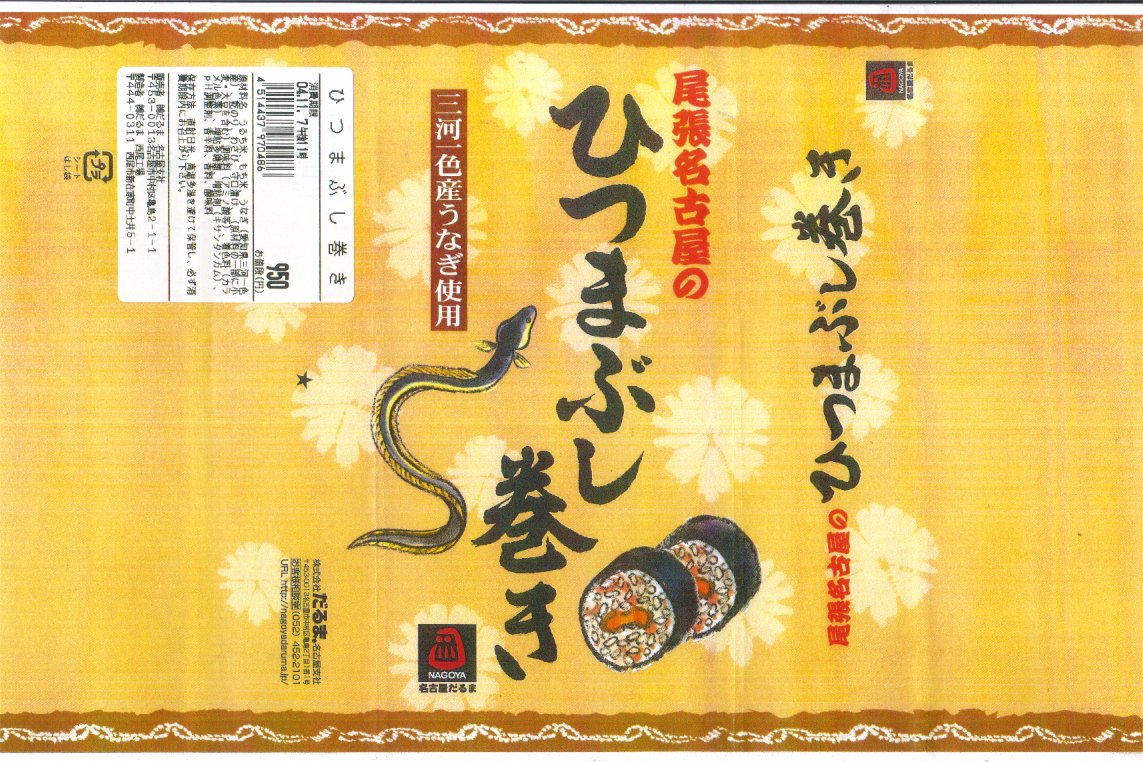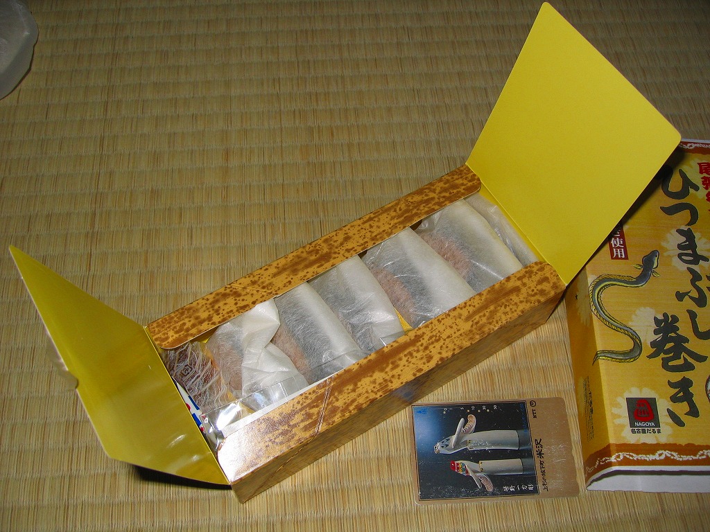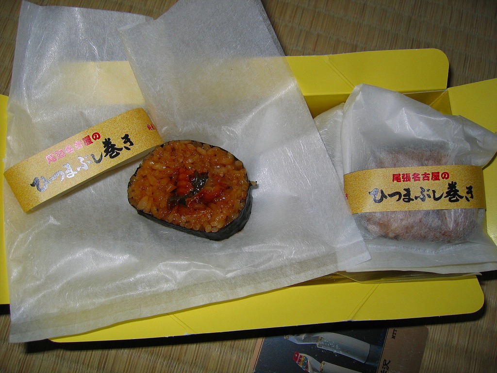 2005年2月の中部国際空港開港と同時の空弁デビューと思われる、中部空弁で飛び抜けて高額な商品。まきすを箱形に組み立てた容器に割箸やしおりを添えて、中身の写真を載せた掛紙で包む。中身は煮穴子×2・海老×2・コハダ・トリ貝・マダカで合計7個の江戸前寿司。背景を知らなければ割高感しかない。 尾州早すしとは、地域の活性化グループ「知多ソフィア・ネットワーク」が2002年10月に、二百年前の江戸前寿司のレシピに基づいて再現した江戸前寿司。愛知県半田が発祥で食酢最大手のミツカンが当時の製法でつくる酢「三ツ判山吹」を使い、現代の2倍大のシャリと、酢と塩で下ごしらえしたネタを組み合わせた。知名度はまだまだだが、百貨店などからの引き合いは来ているという。 【中部国際空港】2005(平成17)年2月17日開港 愛知県常滑市セントレア1−1 http://www.centrair.jp/ 【合資会社魚福本店出前センター】愛知県半田市住吉町3−166 連絡先の記載なし 尾張名古屋のひつまぶし巻き(950円) 2004年11月7日に小田急百貨店藤沢店駅弁大会で購入