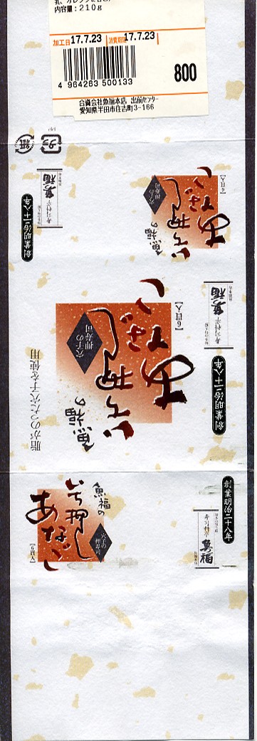 2005年2月の中部国際空港開港と同時に空弁デビューした、愛知県半田市の食堂や仕出しの業者の鶏飯。ちゃちな発泡材容器に透明なフタをかける、コンビニに置いても貧相に見える容器に、鶏を描いた掛紙をかける。中身は鶏飯に玉子焼や焼鮭や焼鶏などを添えるもので、鶏飯と焼鶏の味は良いが、その他は見栄えも味もだいぶ落ちる、雑な作りが残念。 このお弁当は空弁売店ではなく、軽食や雑誌から空港グッズや土産物まで扱う総合観光売店の一角にあるコンビニタイプの冷蔵ショーケースで、コンビニ弁当と同等の陳列方法で販売されていた。その中にはコンビニ弁当に空港名ミニシールを1枚貼るだけで空弁を名乗るマガイモノもあり、中部国際空港では報道にあるほどの空弁の盛り上がりはない。空弁ブームが実は、羽田空港など非常に限られた数空港でしか発生していない現状を示していると思う。 【中部国際空港】2005(平成17)年2月17日開港 愛知県常滑市セントレア1−1 http://www.centrair.jp/ 【株式会社ウオフク】愛知県半田市日ノ出町48番地 0569(22)5329 魚福のいち押しあなご(800円) 2005年7月23日に中部国際空港搭乗ロビー売店で購入