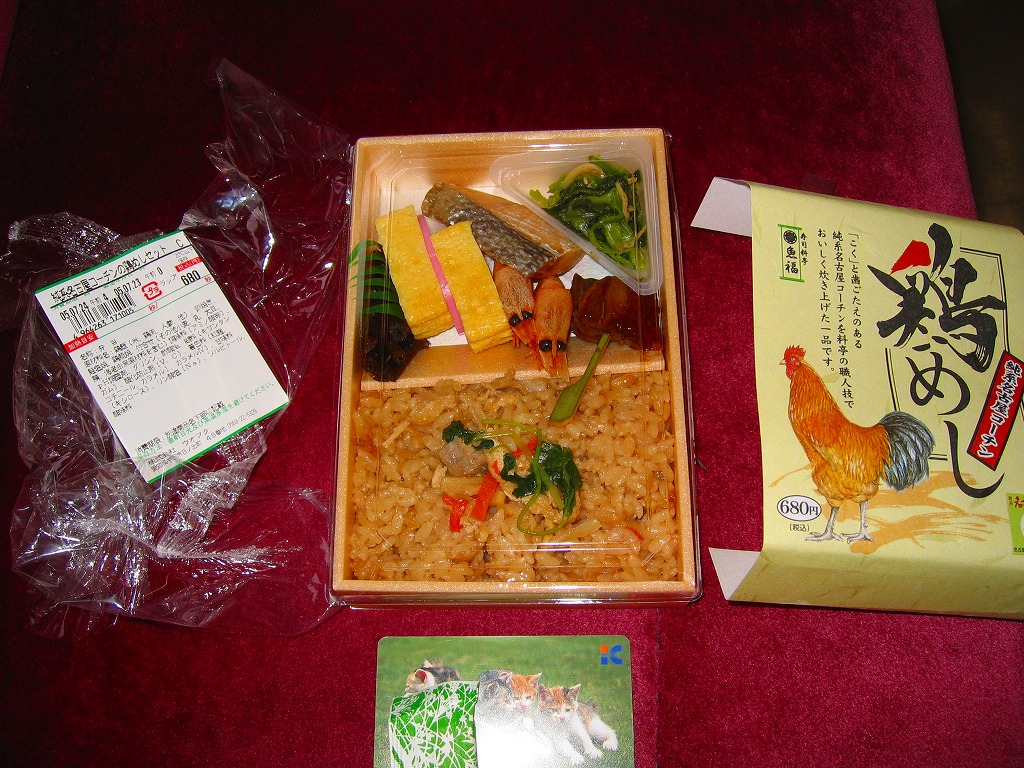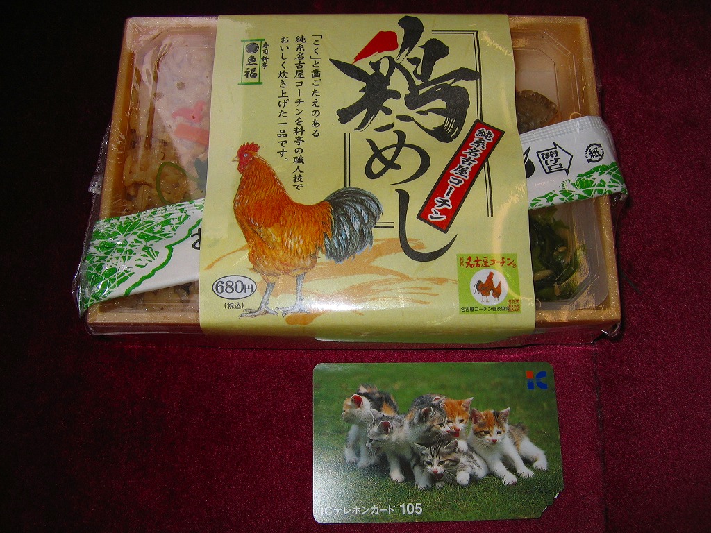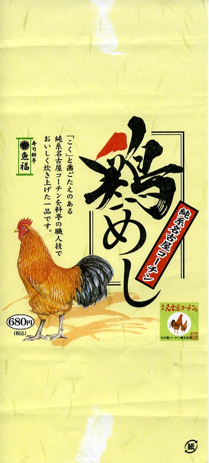 2005年2月の中部国際空港開港と同時に空弁デビューした、愛知県半田市の食堂や仕出しの業者の助六寿司。キツネ柄の掛紙を巻いた調製元特製の正方形紙箱に、三種のいなり寿司と太巻と玉子焼と、ウナギや玉子焼などでストライプを描く押寿司が入る。小柄で安価で満腹になる機能的な空弁であり、調製元が寿司料亭を名乗るだけあって風味も良好。 童話「ごんぎつね」は、兵十が捕ったウナギをいたずらで逃がし、約十日後のその母の死を知りウナギが食べたかったろうと心を痛めたごんぎつねが、その償いをと兵十宅に栗や松茸などをこっそり届けていたら、兵十に間違えて撃たれたというストーリー。これを1932年に発表した新美南吉(1913−1943)の出身地が、調製元所在地と同じ愛知県半田である。関連資料を集めた記念館もあるが、御多分に洩(も)れず公共交通機関では訪問が困難である。 【中部国際空港】2005(平成17)年2月17日開港 愛知県常滑市セントレア1−1 http://www.centrair.jp/ 【合資会社魚福本店】愛知県半田市堀崎町1−14番地 0569(21)0779 純系名古屋コーチン鶏めし(680円) 2005年7月23日に中部国際空港搭乗ロビー売店で購入
