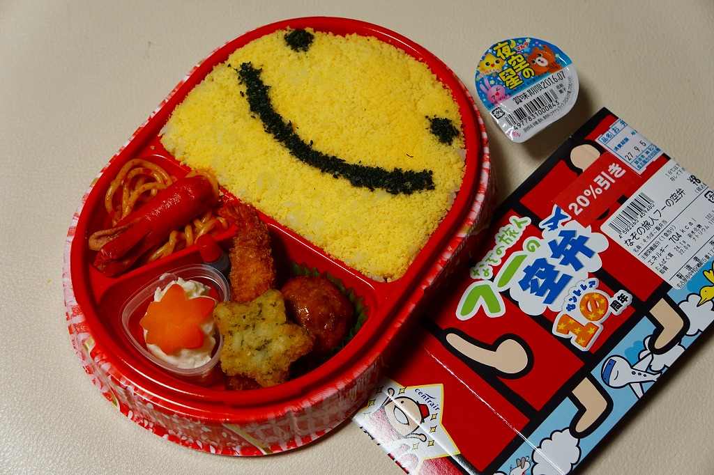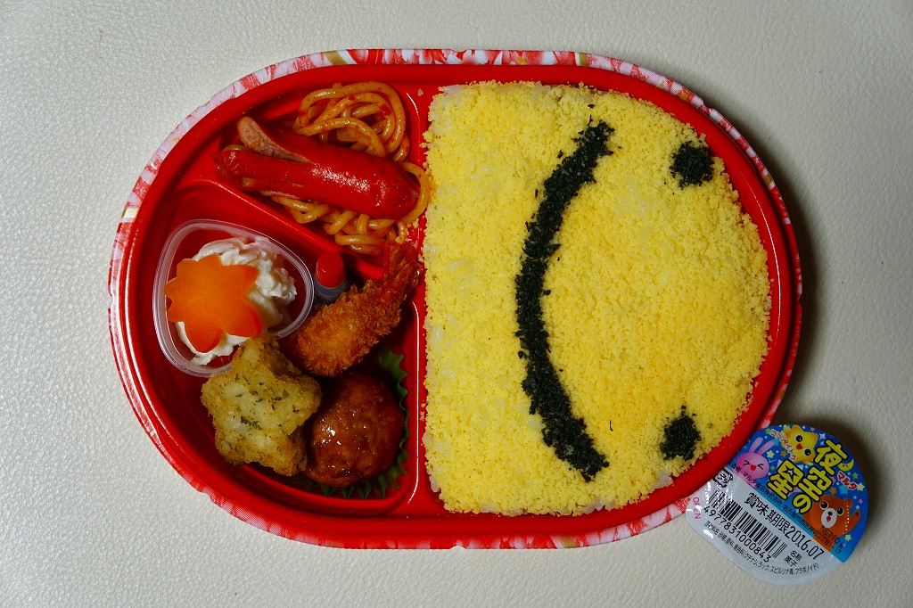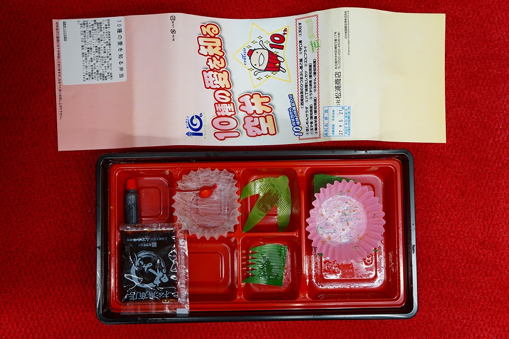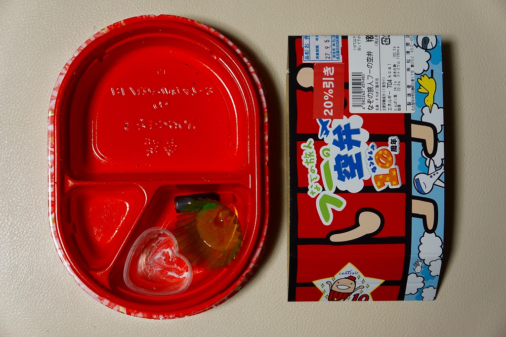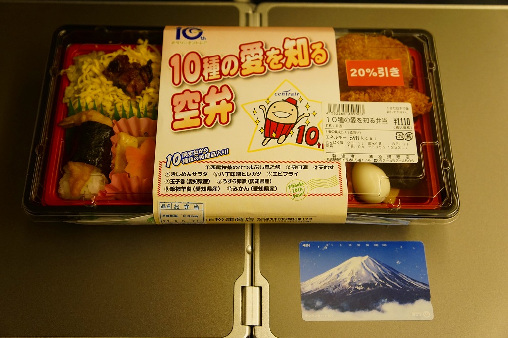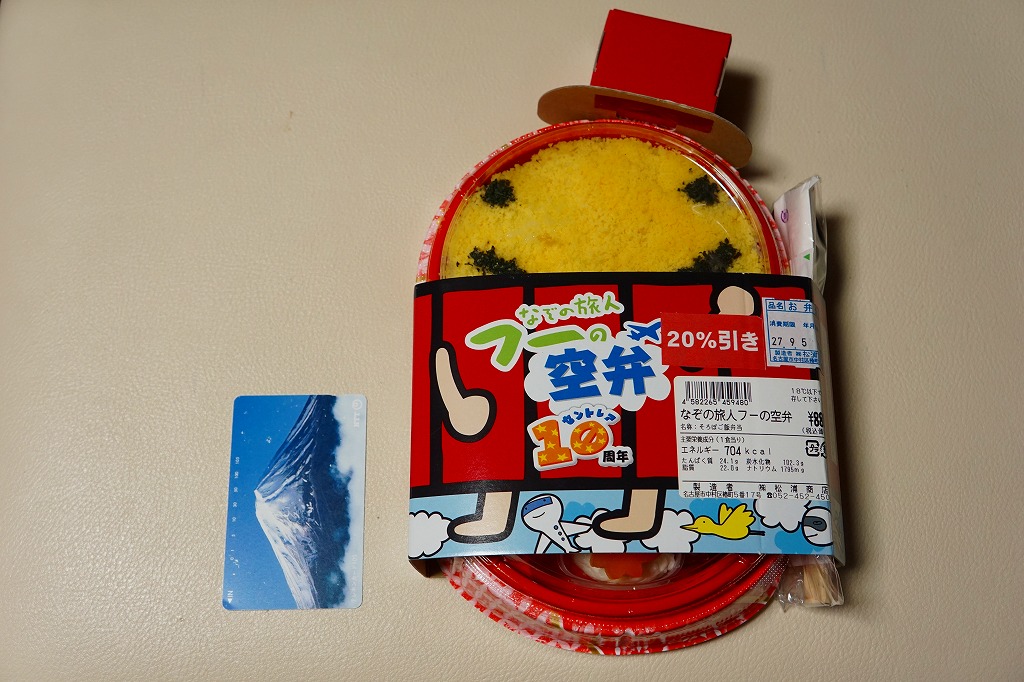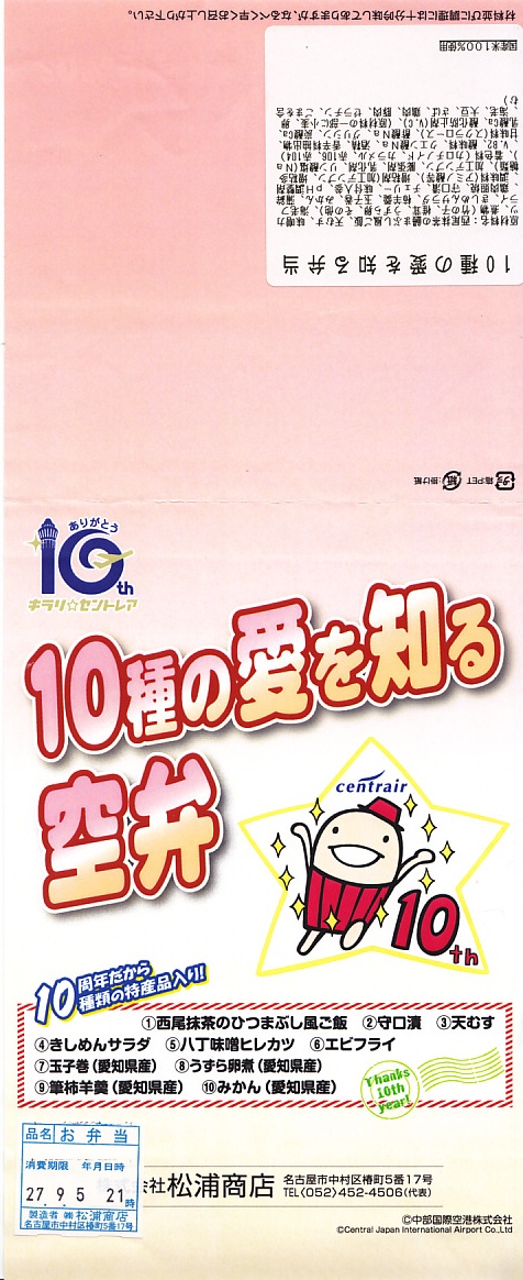 中部国際空港の開港10周年を記念し、2014年10月以降に発売か。開港当時からのキャラクターのひとつ「なぞの旅人フー」を、ボール紙製の帽子と、空弁の名前や調製シールなどを記すボール紙のパッケージと、御飯の上の細かい玉子そぼろの絵柄で表す。中身は白御飯に玉子そぼろと刻み海苔で顔を描き、ウインナー、スパゲティ、エビフライ、肉団子、ハッシュドポテト、ポテトフライ、ニンジンなどのお子様ランチ。帽子の中には金平糖のミニカップが入っていた。 玉子そぼろ飯に見えた御飯は、実は下から鶏飯、鶏そぼろ、白飯、玉子そぼろという4層構造で、おかず要らずでいただけた。調製元はJR名古屋駅の駅弁屋であり、この細かい玉子そぼろは、JR名古屋駅の名物駅弁「とり御飯」で半世紀前から親しまれるものである。 このキャラクターは、どこまで知られたり親しまれているのだろうか。訪問時には実物は、イベントステージの裏で陰に隠れていた。 【中部国際空港】2005(平成17)年2月17日開港 愛知県常滑市セントレア1−1 http://www.centrair.jp/ 【株式会社松浦商店】愛知県名古屋市中村区椿町5番17号 052(452)4506 http://www.obento-matsuura.co.jp/ 10種の愛を知る空弁(1,110円) 2015年9月5日に中部国際空港搭乗ロビー売店で購入