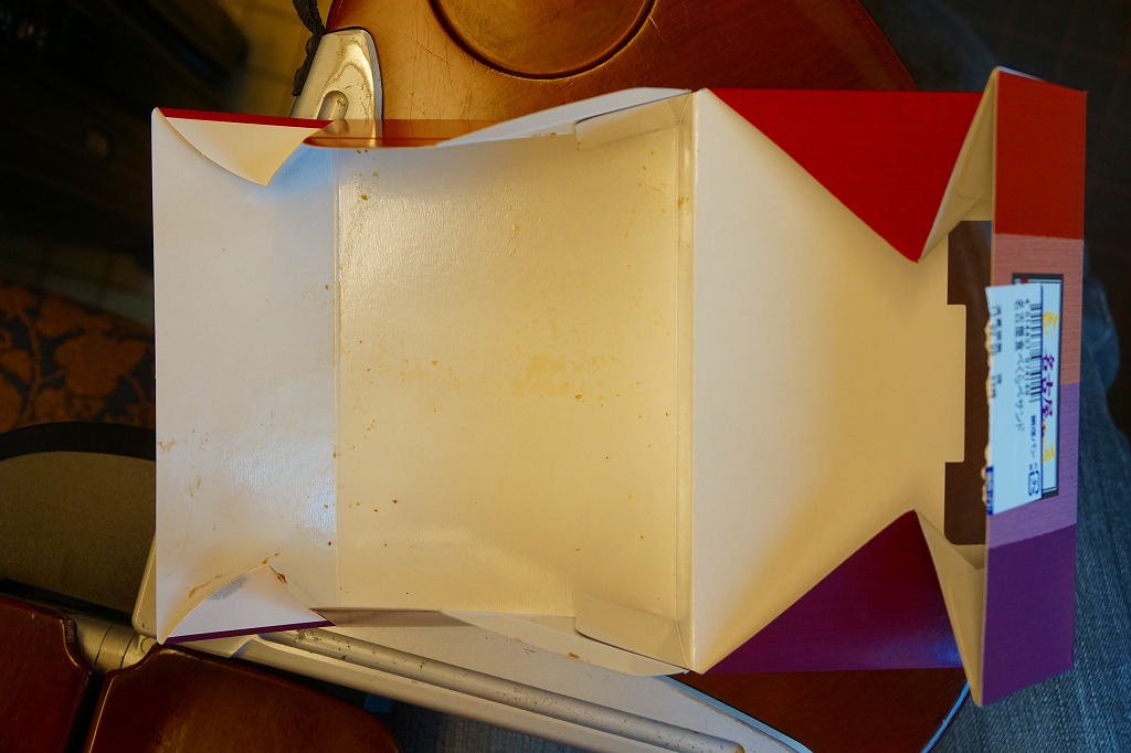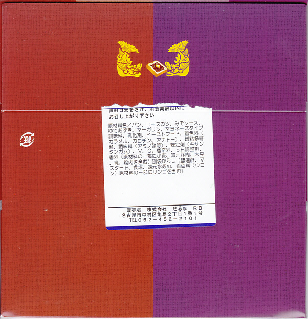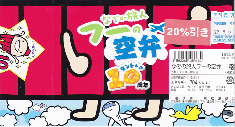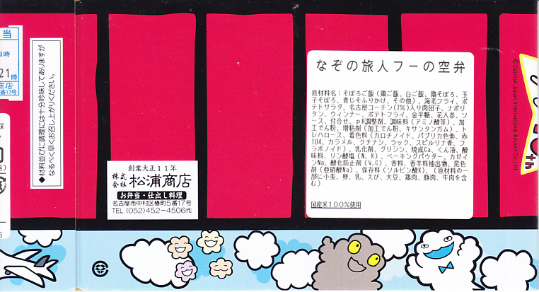 中部国際空港の開港10周年を記念し、2014年10月以降に発売か。牛のシルエットと商品名、セントレア10周年の絵柄や調製元のアイコンを記した紙箱に、真っ黒で非常に甘い味付けの牛肉煮を耳なし食パンで挟んだサンドイッチ4切れが直に収まる。みそかつサンドをさしおいて、こちらを選ぶことはないと思う。 【中部国際空港】2005(平成17)年2月17日開港 愛知県常滑市セントレア1−1 http://www.centrair.jp/ 【株式会社だるま 名古屋支社】愛知県名古屋市中村区亀島2−1−1 052(452)2101 http://nagoyadaruma.jp/ なぞの旅人フーの空弁(880円) 2015年9月5日に中部国際空港搭乗ロビー売店で購入