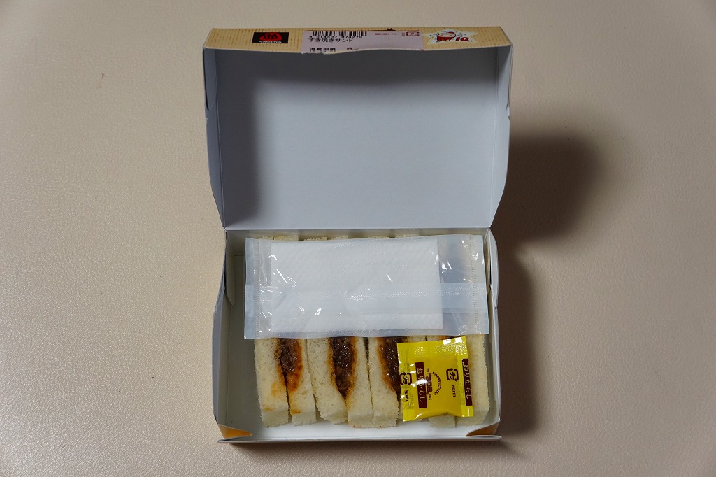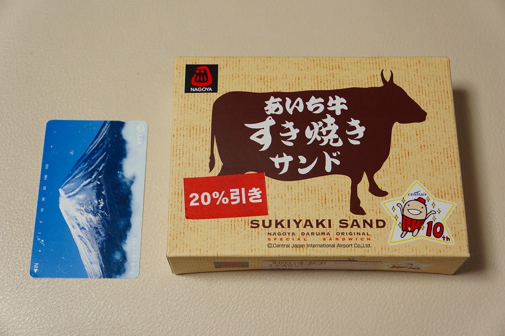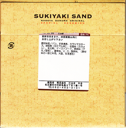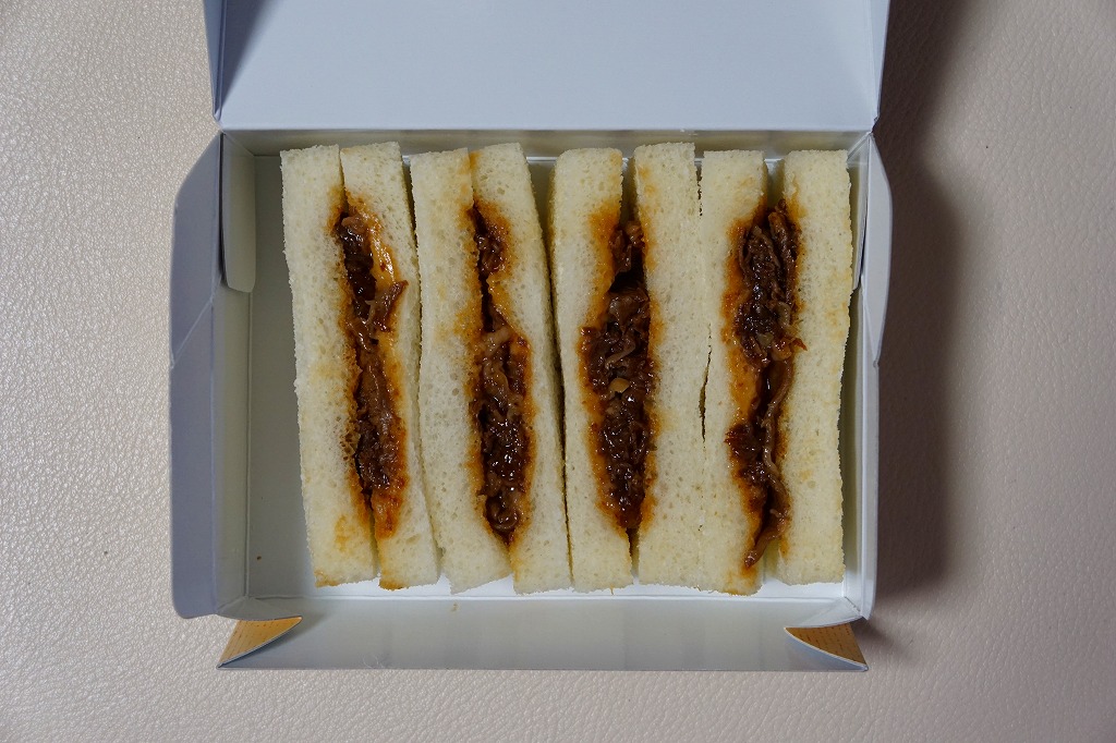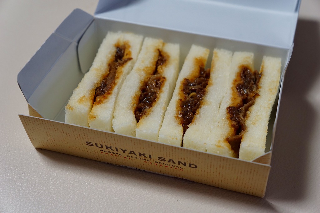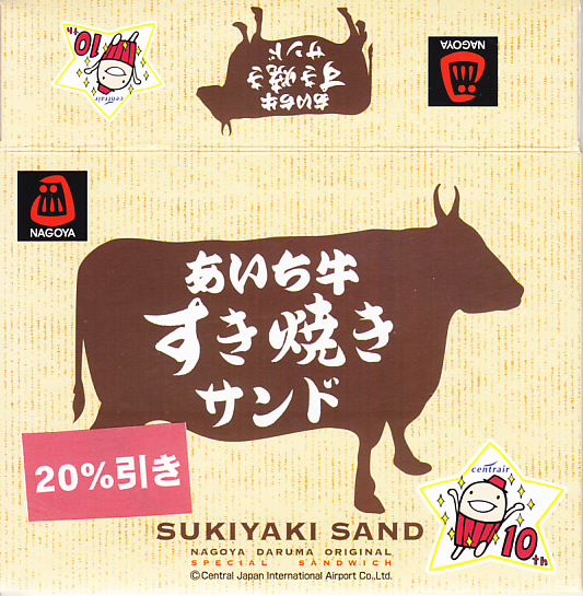 2014年までに発売か。二色の紙箱に明記されるとおり、トーストされていない耳なし食パンにみそかつを挟んだサンドイッチが2切れと、トーストした耳なし食パンにあんこを挟んだサンドイッチ「小倉トースト」が2切れ。甘い物が大好きでない人が間違えて買うと大変そう。 【中部国際空港】2005(平成17)年2月17日開港 愛知県常滑市セントレア1−1 http://www.centrair.jp/ 【株式会社だるま 名古屋支社】愛知県名古屋市中村区亀島2−1−1 052(452)2101 http://nagoyadaruma.jp/ あいち牛すき焼きサンド(780円) 2015年9月5日に中部国際空港搭乗ロビー売店で購入