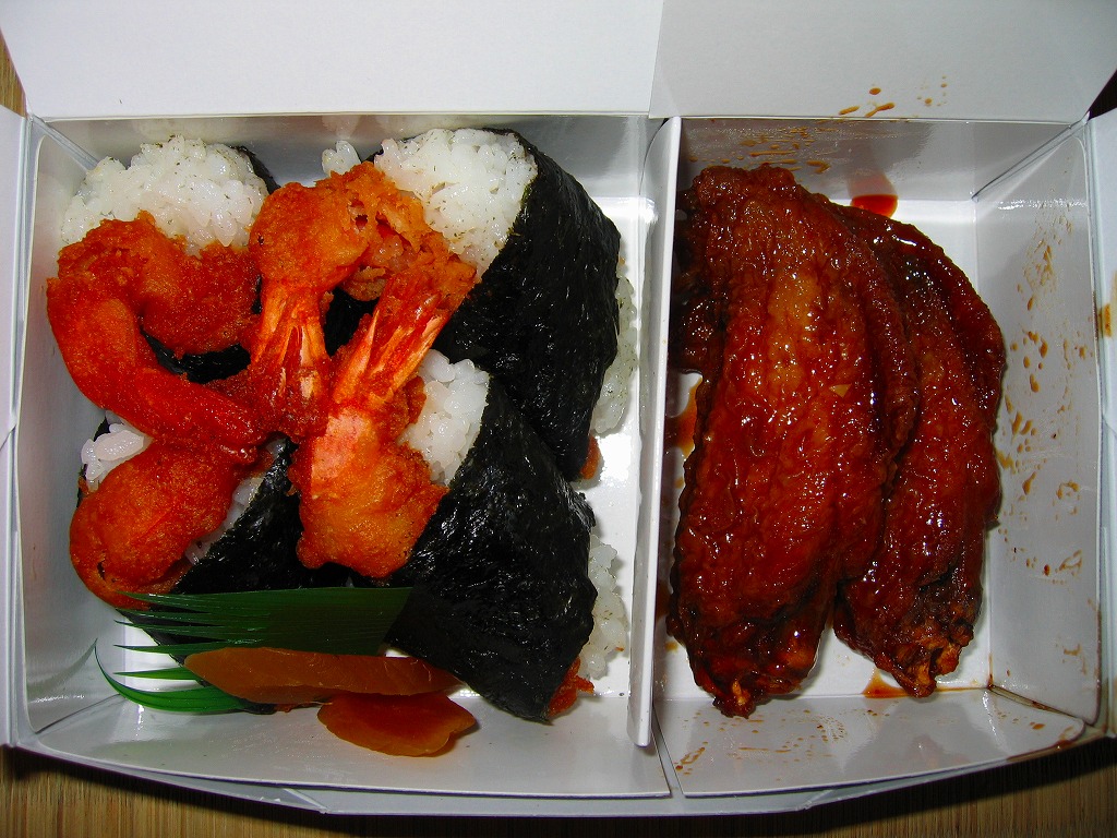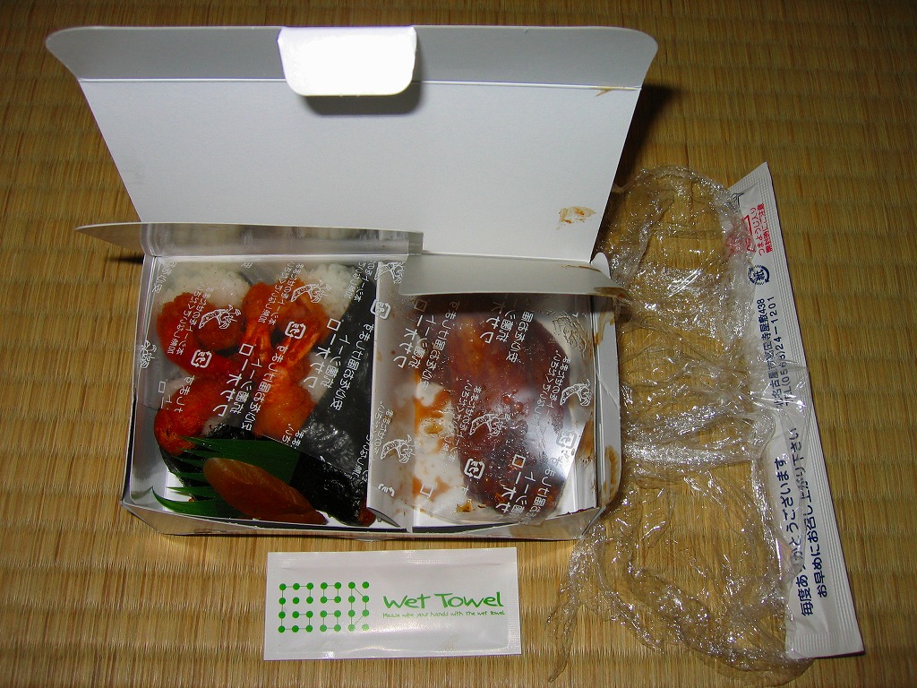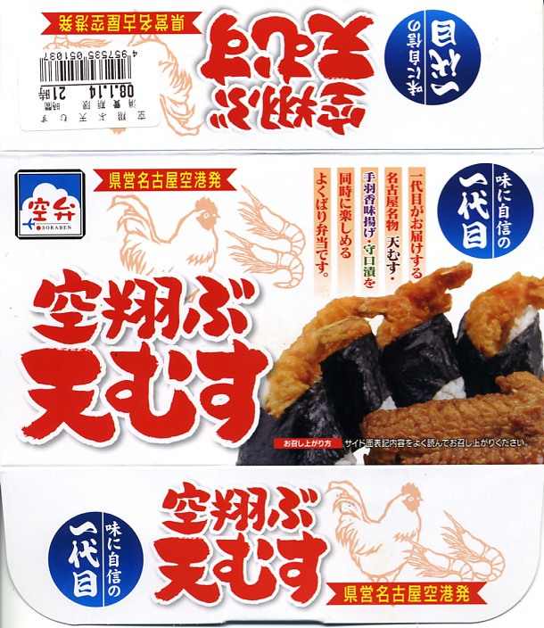 百貨店の催事場で県営名古屋空港の空弁として売られていた商品。催事屋製空弁マークを付けて中身の写真を掲載する小さなボール箱の中に、天むすが4個、手羽先が2本、守口大根が少々。現地に実態のない催事商品だろうから、搭乗待合室や機内での消費に向かないこの内容で、しかもお手ふきを添付しなくても構わないのだろう。 【名古屋飛行場】1944(昭和19)年開港 愛知県西春日井郡豊山町 http://www.nagoya-airport-bldg.co.jp/ 【株式会社一代目】愛知県北名古屋市高田寺屋敷438 0568(24)1201 Copyright (C) 2006-2022 まっこうくじら |